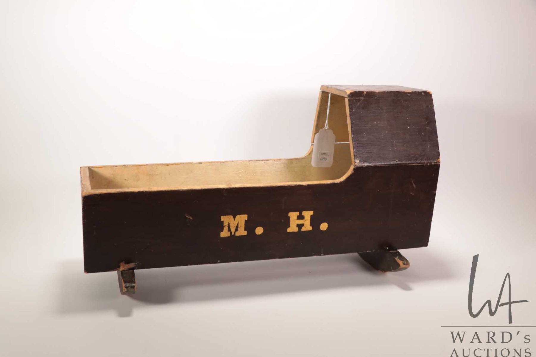 Antique hand made doll's cradle with initials M.H. on side, 22" in length