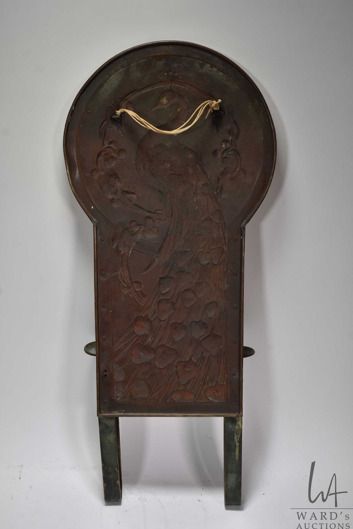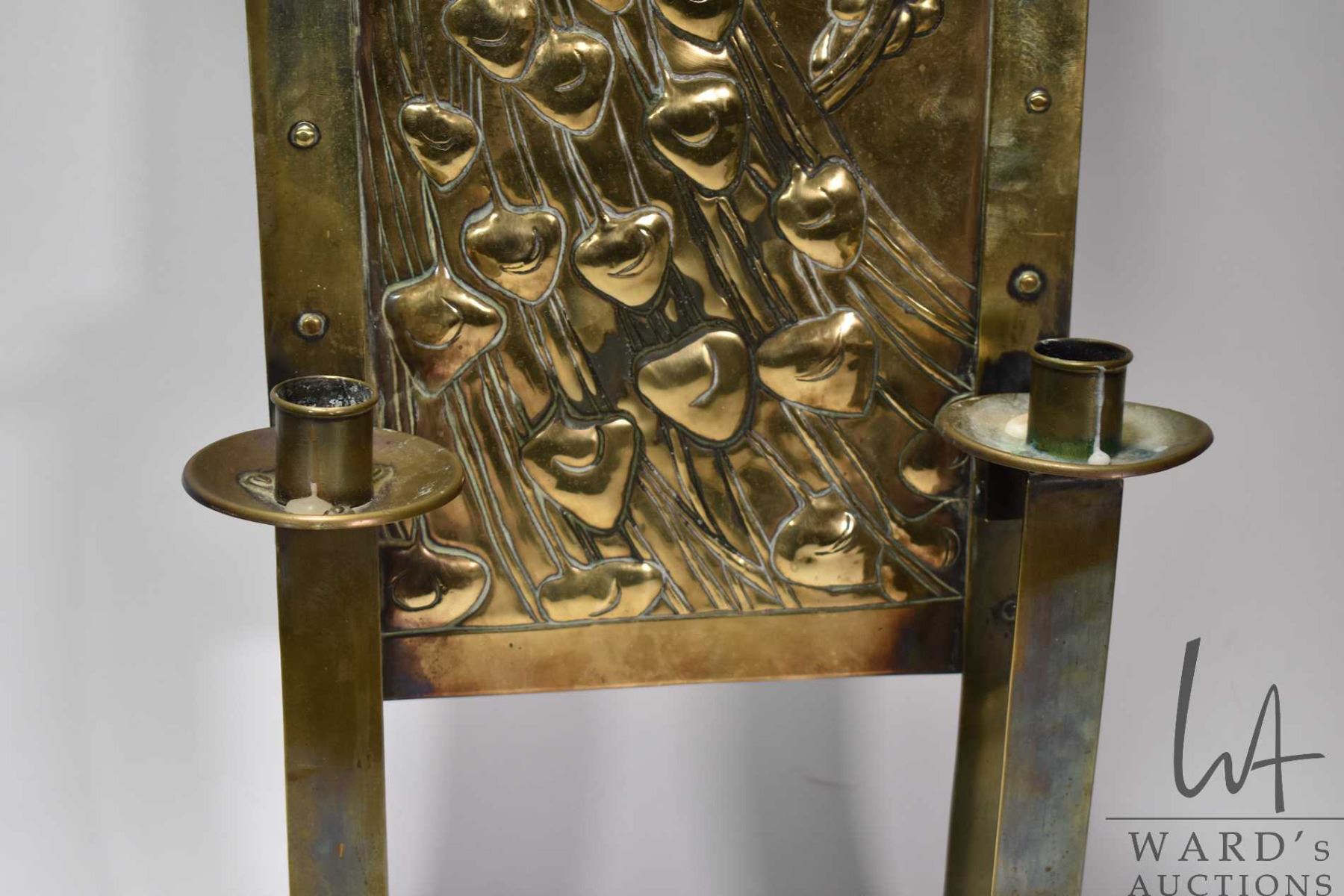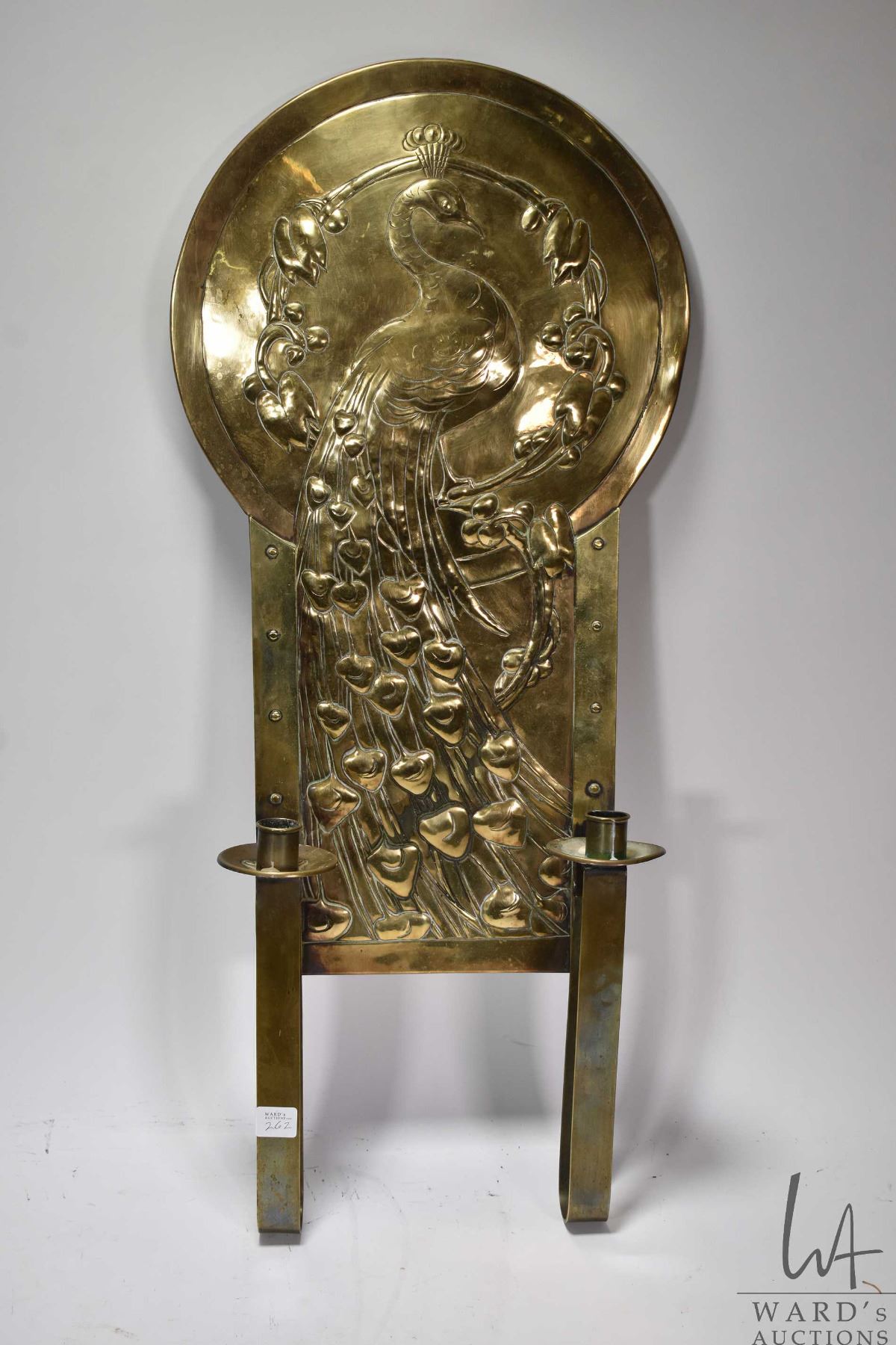 Antique hand made repousse decorative brass, peacock motif, double candle wall sconce, attributed to Margaret Gilmour (1860-1942), Glasgow School, 28" in height