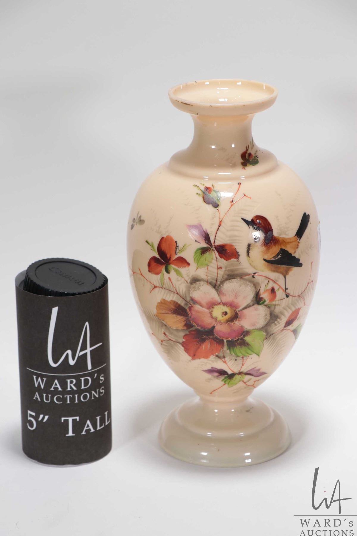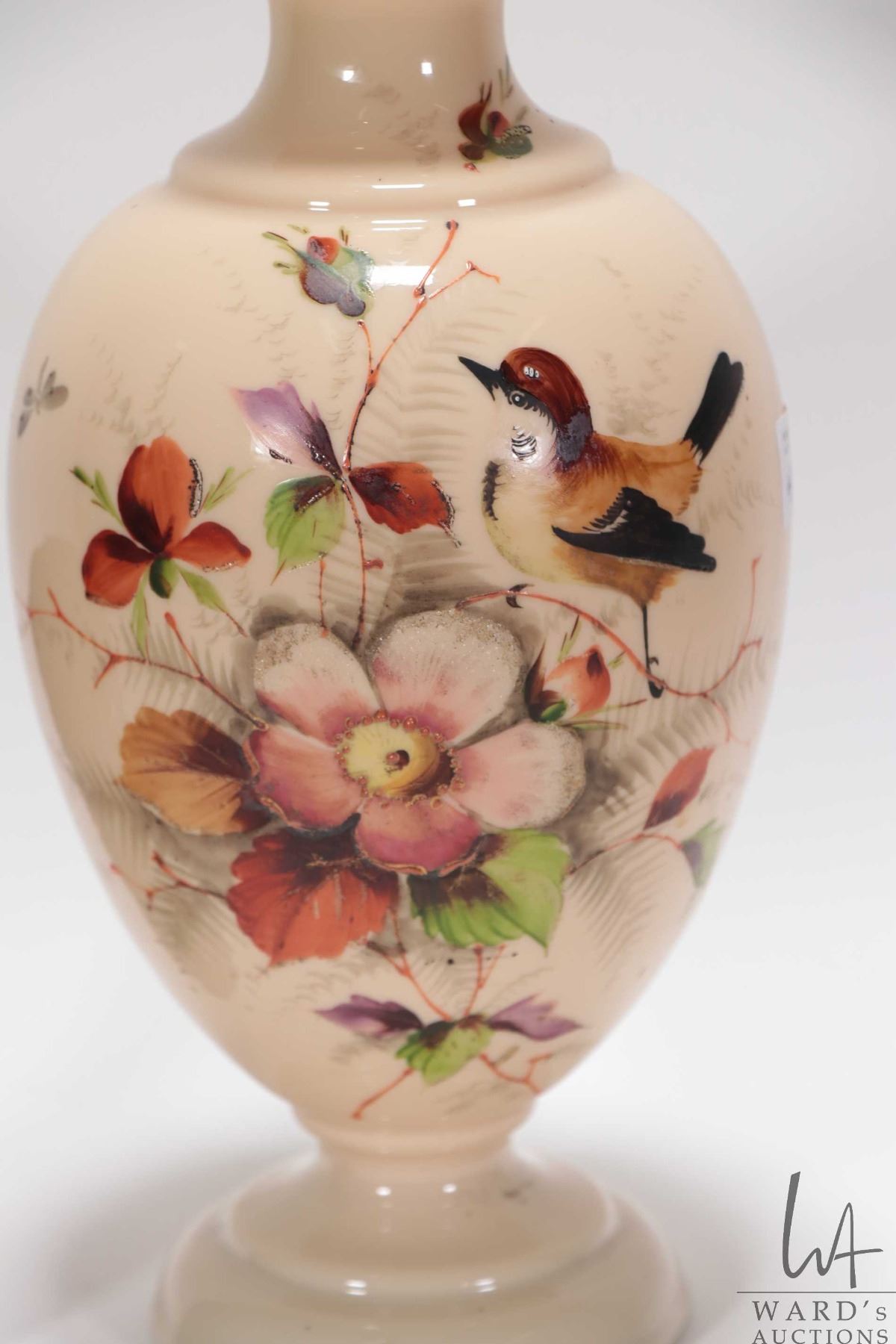 Antique hand painted Bristol glass vase with song bird, flowers and leaves, 10 1/2" in height