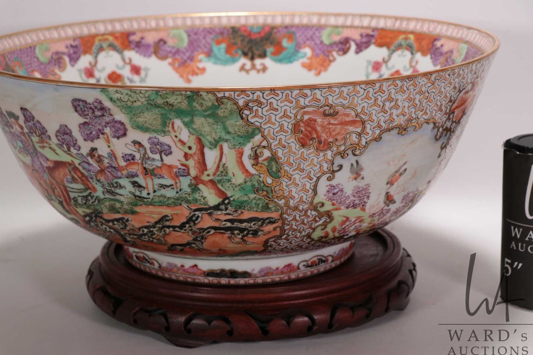 Antique hand painted Chinese punch bowl elaborate hunting scenes and detailed decoration, all hand painted. Created for the export market, circa late 1800's, 16 1/2" in diameter and includes wooden plinth