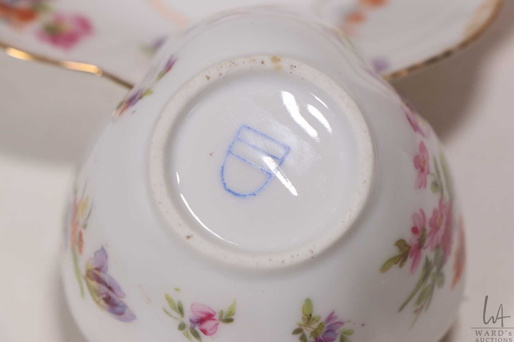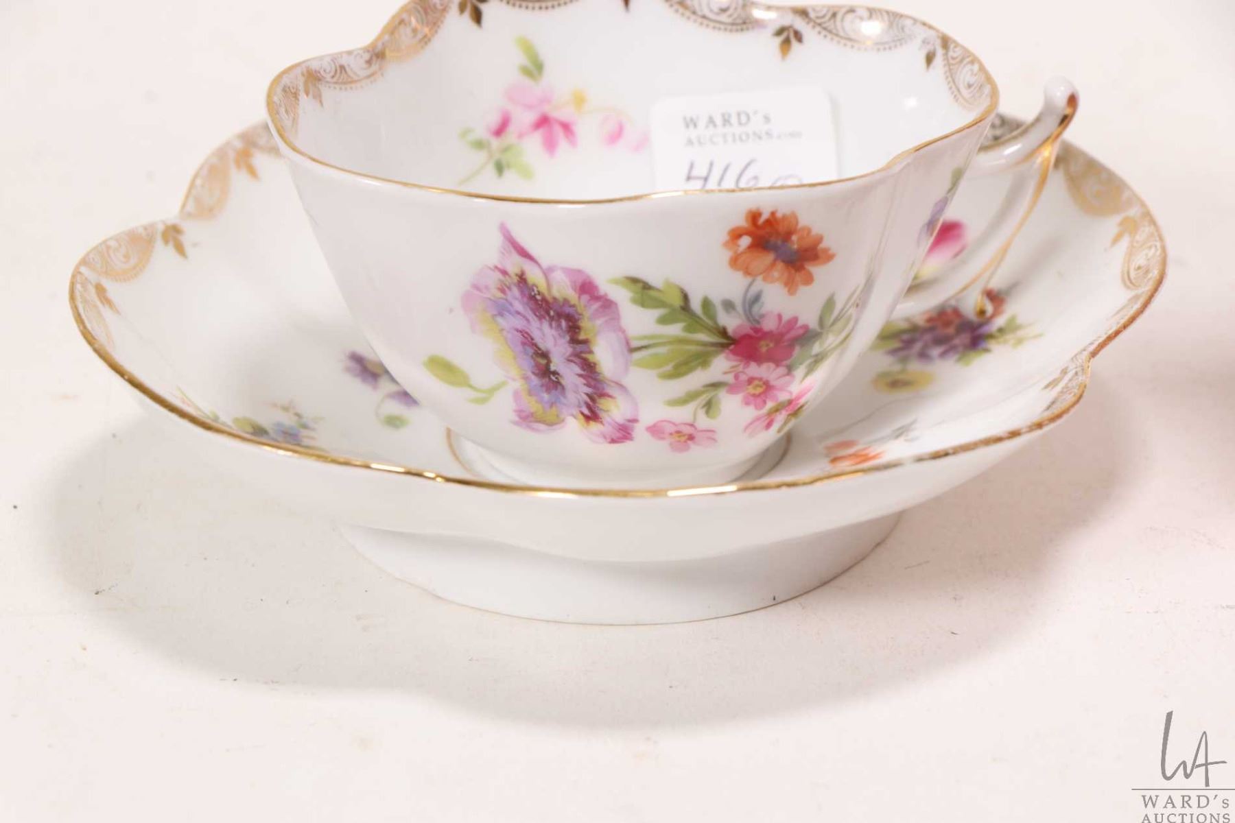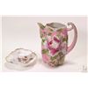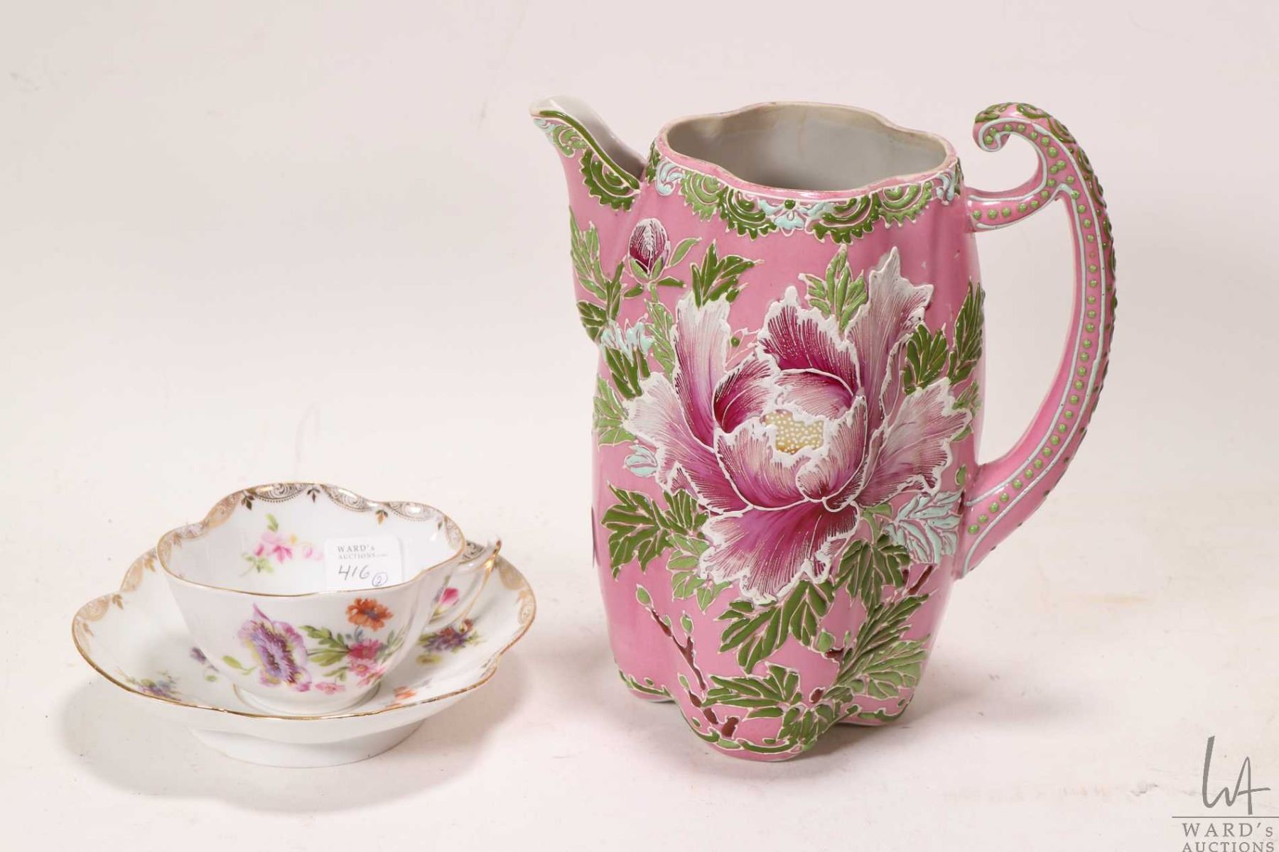 Antique hand painted unmarked Moriage 7 1/2" pitcher and a transfer ware floral tea cup and saucer bearing Royal Vienna markings