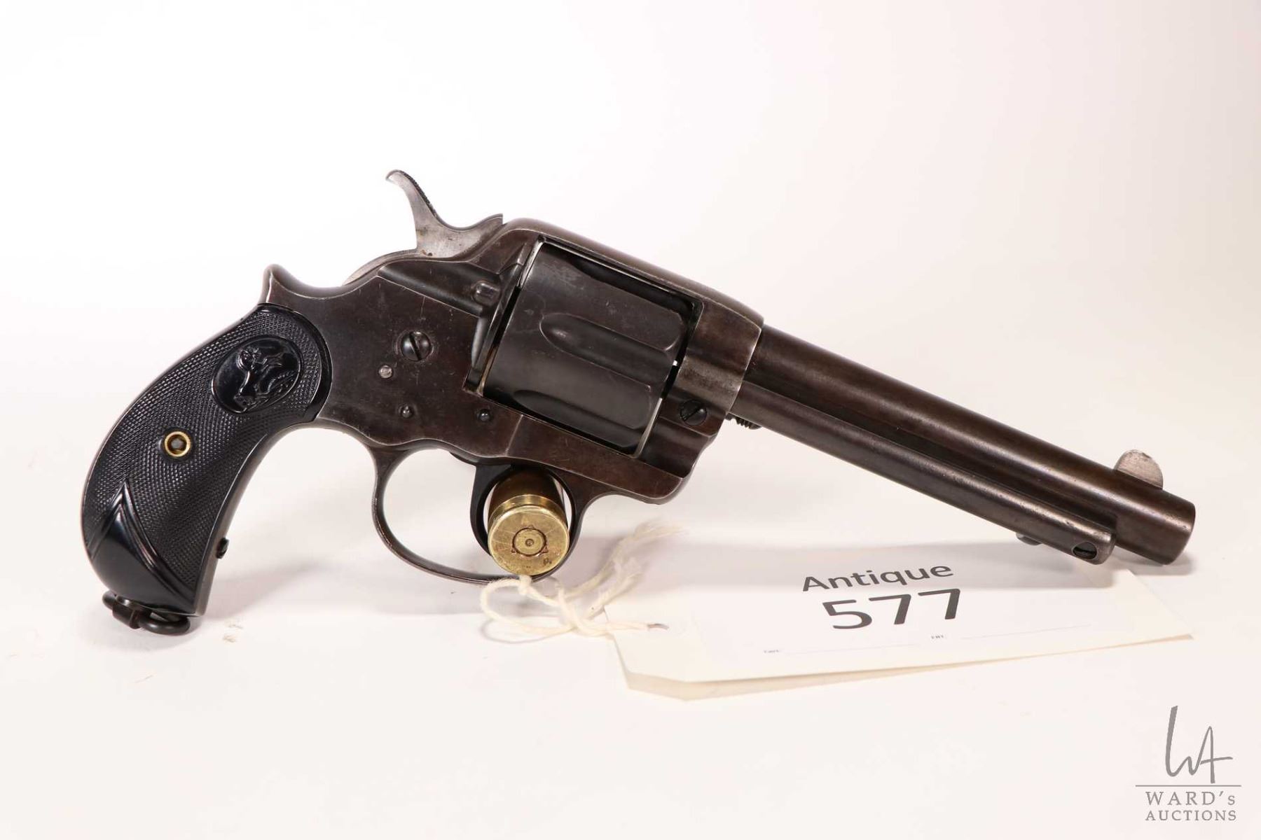 Antique handgun Colt model 1878 Frontier, .476 Rev six shot double action revolver, w/ bbl length 140mm [Blued finish with fixed sights. Branded checkered grips. Fitted with lanyard ring. Double and single action operation is reasonably smooth, including indexing. Cylinder lock up is loose. Expected use, handling and storage marks.] serial # 17000, No PAL required