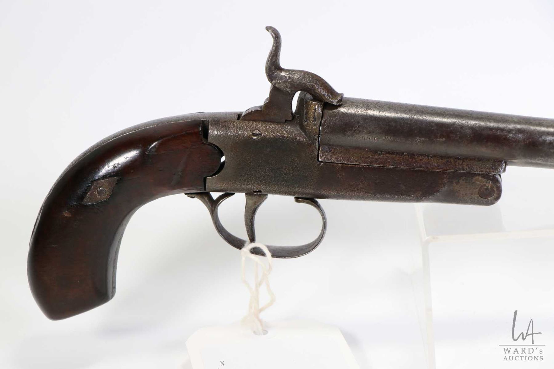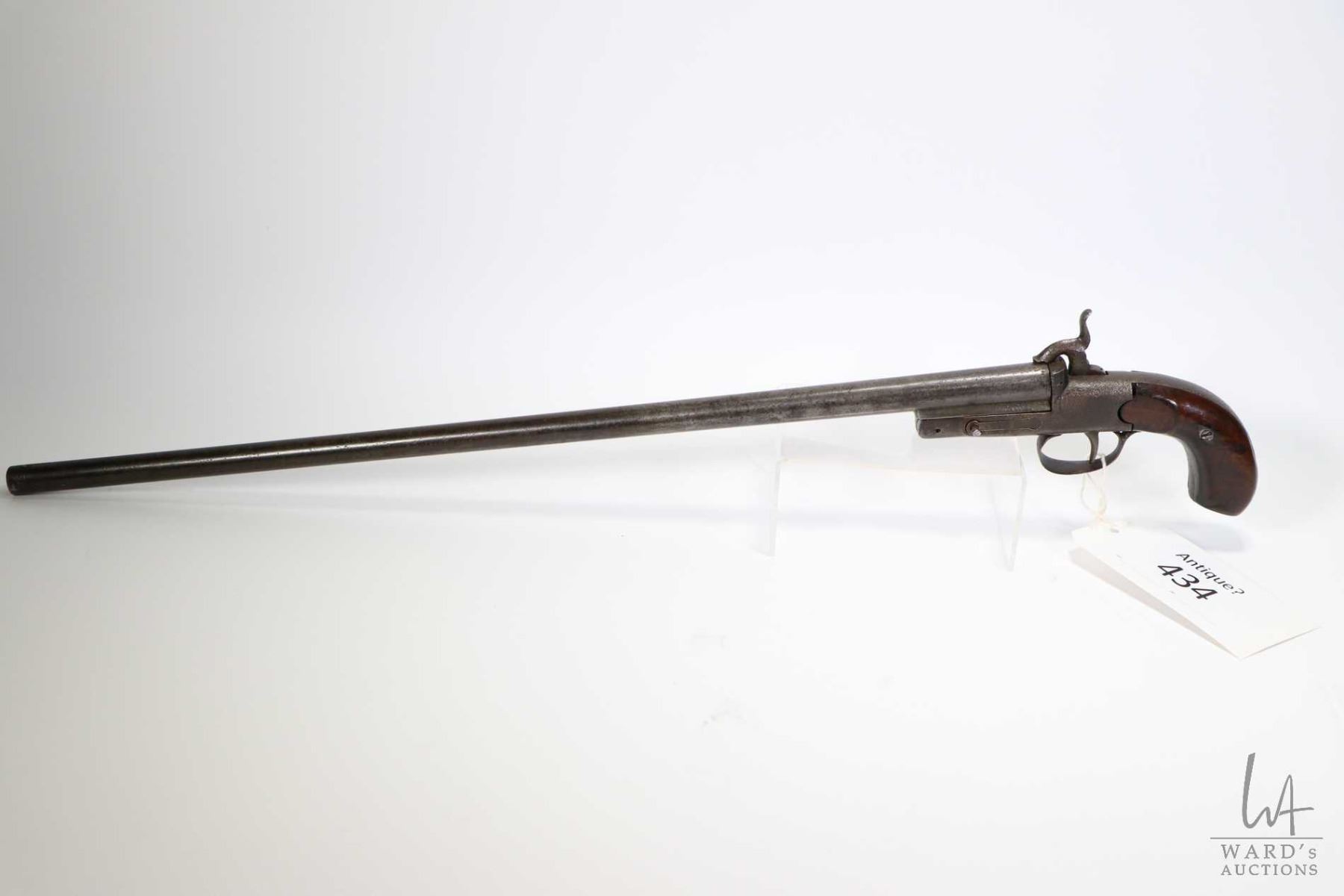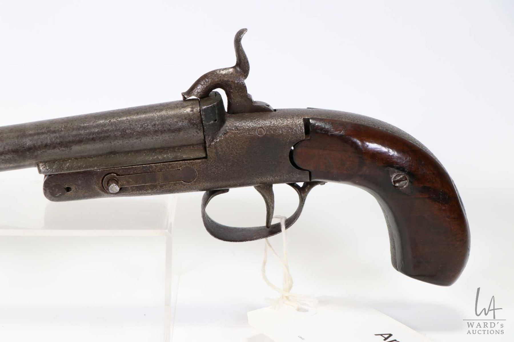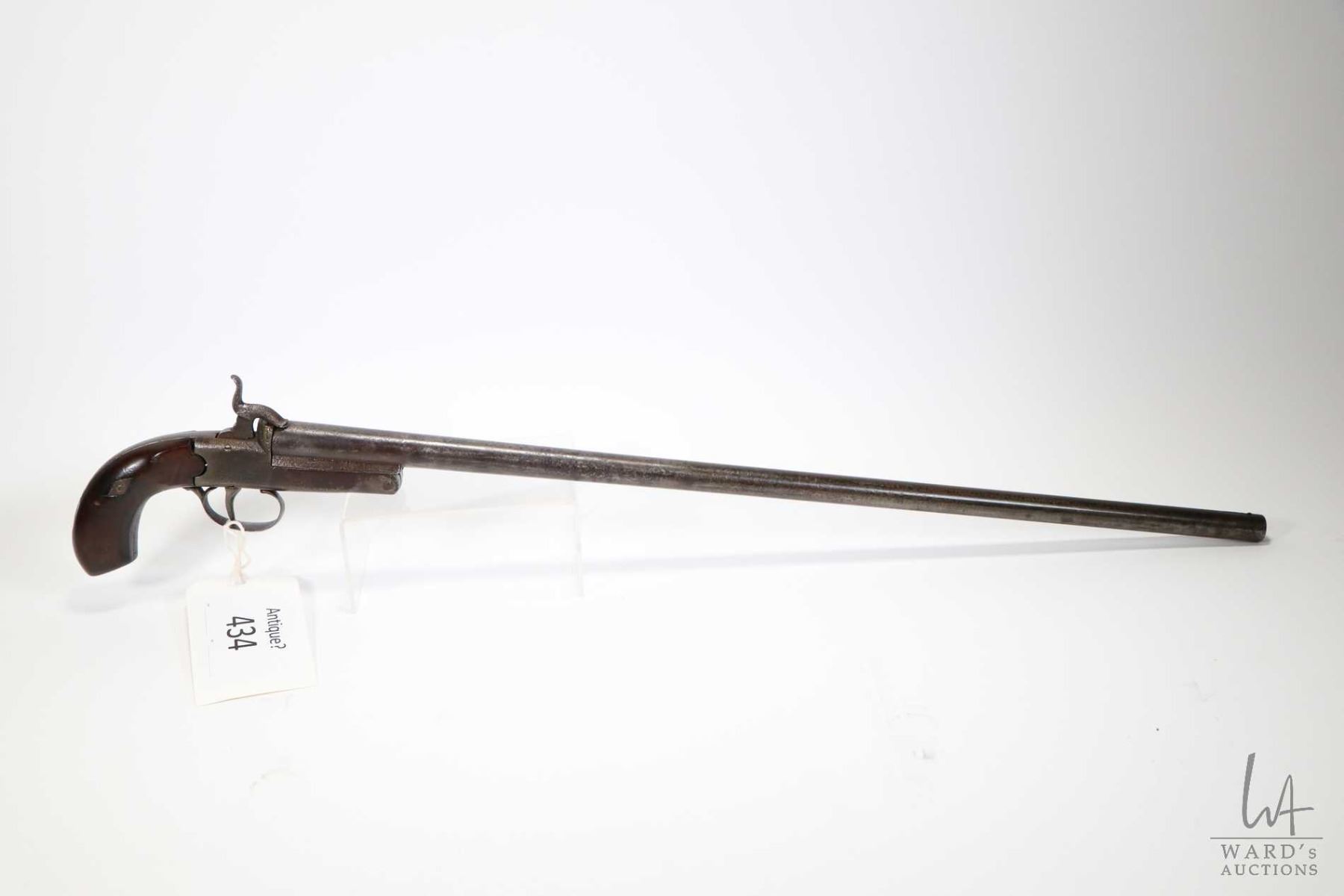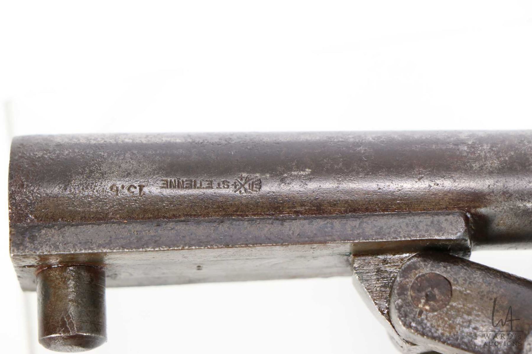 Antique handgun St. Etienne model Single shot, .28 gauge pinfire single shot hinge break, w/ bbl length 23 3/4" [Blued finish turned brown gray. Single bead front sight. Smooth wooden grips. Surface pitting, mostly to frame. Signs of age including tooling marks on screws, loose hinge, non-original release button etc. Hammer does lock and release. Interesting conversation piece with expected wear on wood and metal.] serial # NIL , No PAL required
