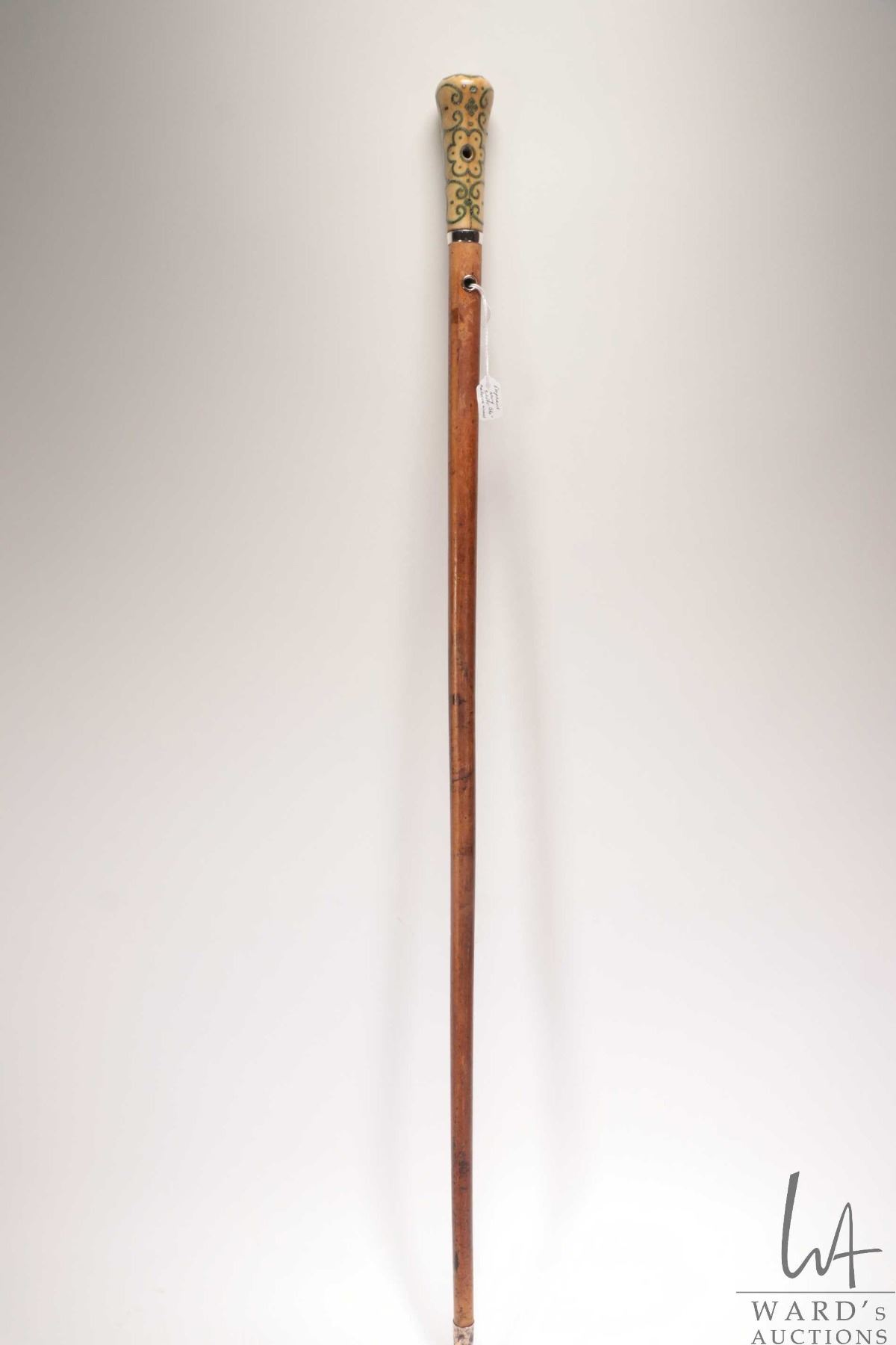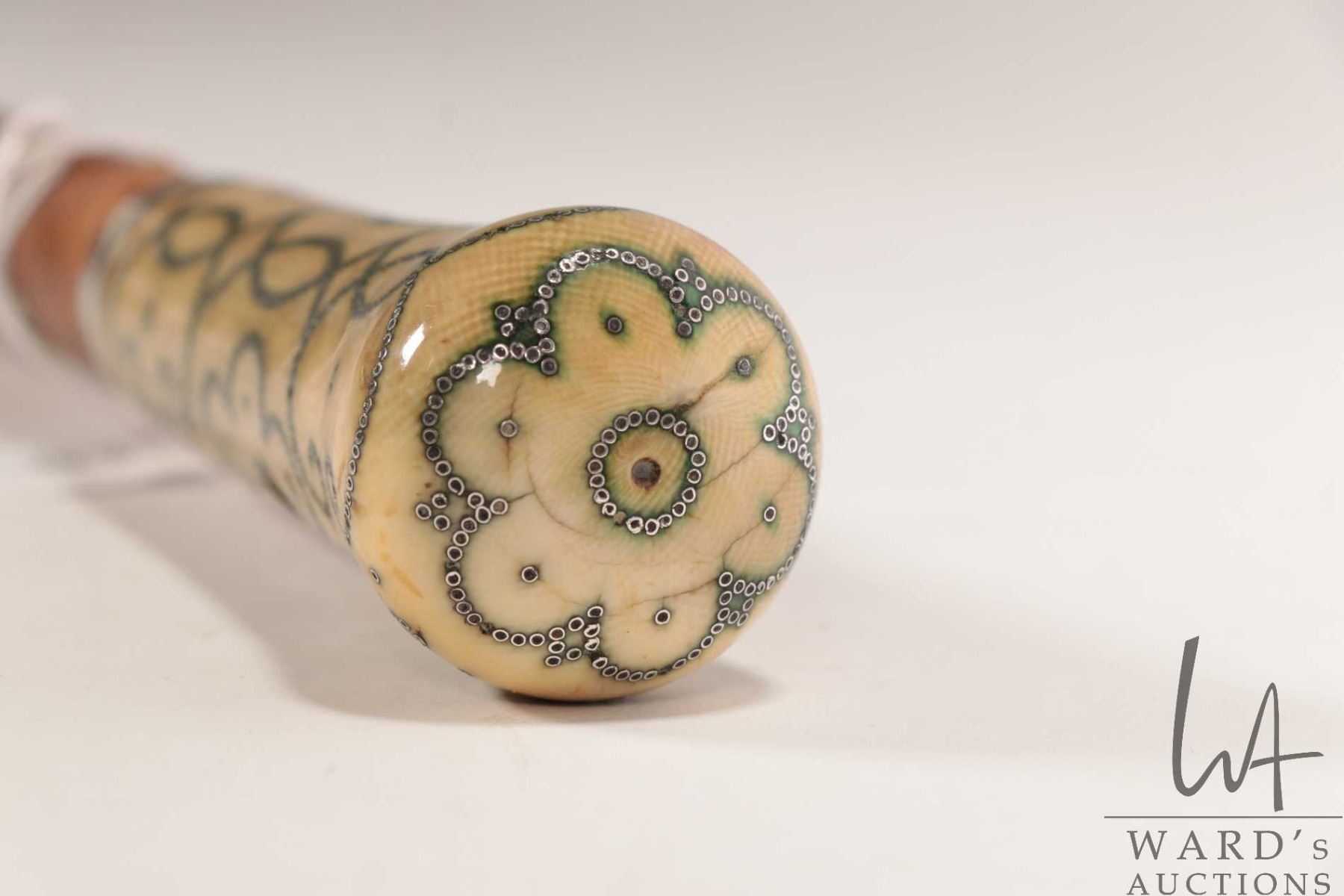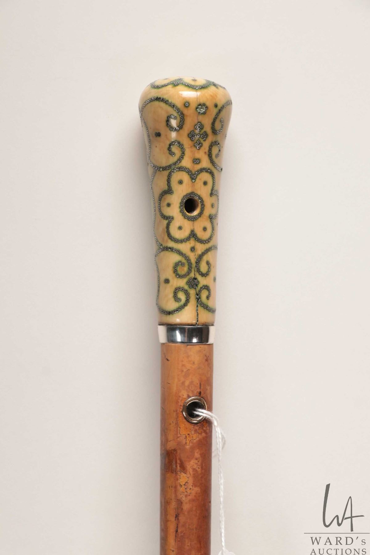 Antique, late 17th/ early 18th century malacca wood walking stick with Elephant Ivory top with inlai
