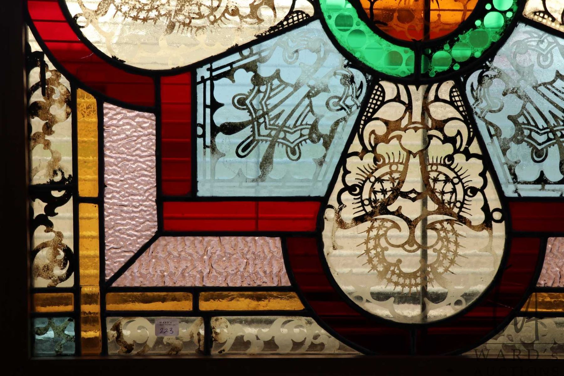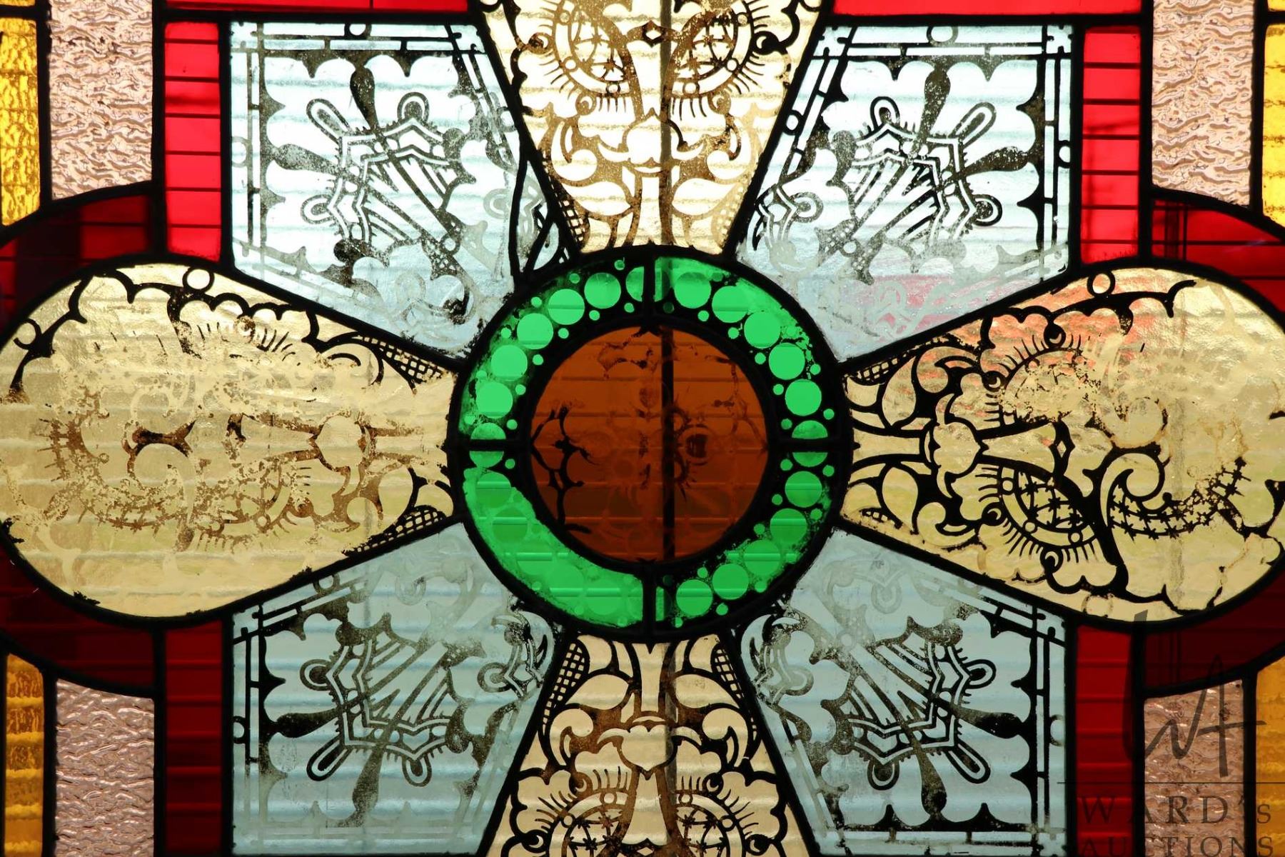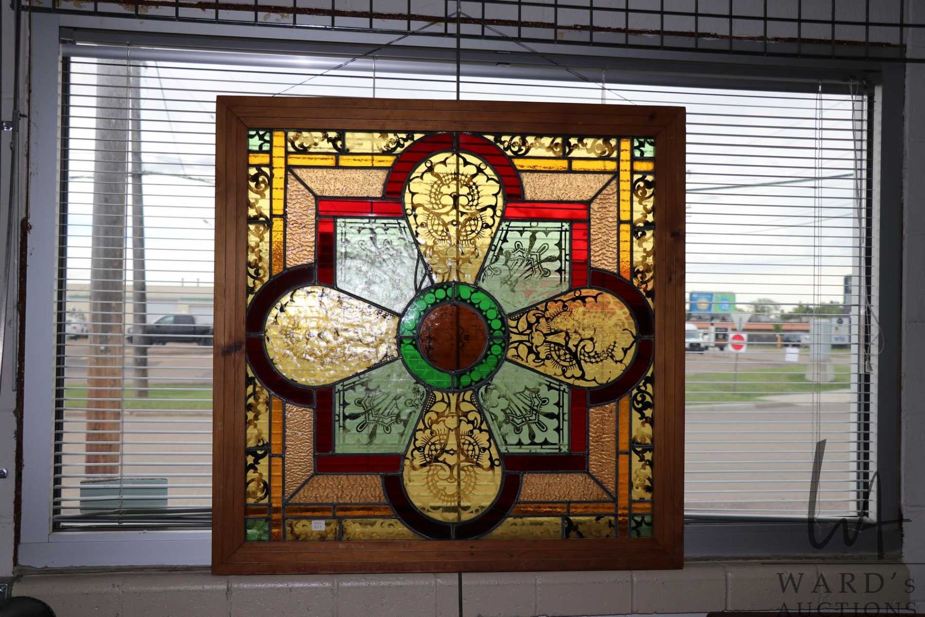 Antique leaded, painted and stained framed glass panel, purportedly from an Italian church, outside dimensions 36" square. Note: This is too large to ship. Local pickup only