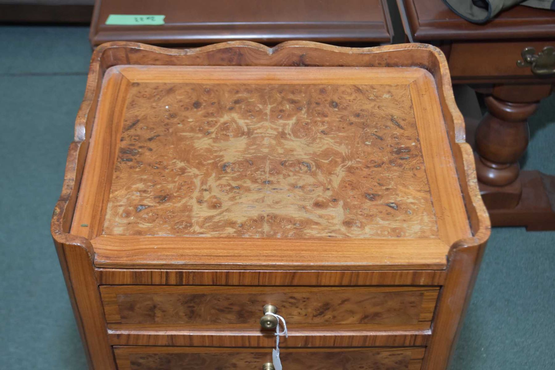 Antique mahogany and burl walnut three drawer bedside table with attached ormolu foot capped decoration
