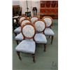 Antique mahogany balloon back dining chairs with blue velvet and Chinese willow patterned upholstery, each with porcelain castors