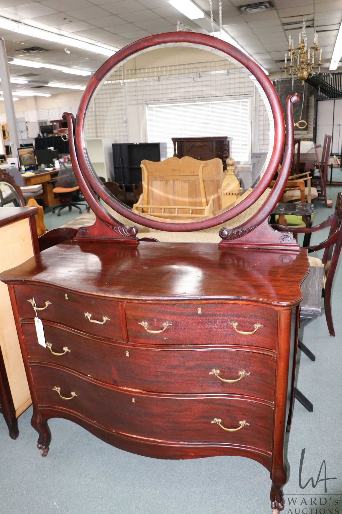 Antique mahogany four drawer dresser with oval beveled mirror, 36" H X 46" W X 24" D, 70" to top of mirror