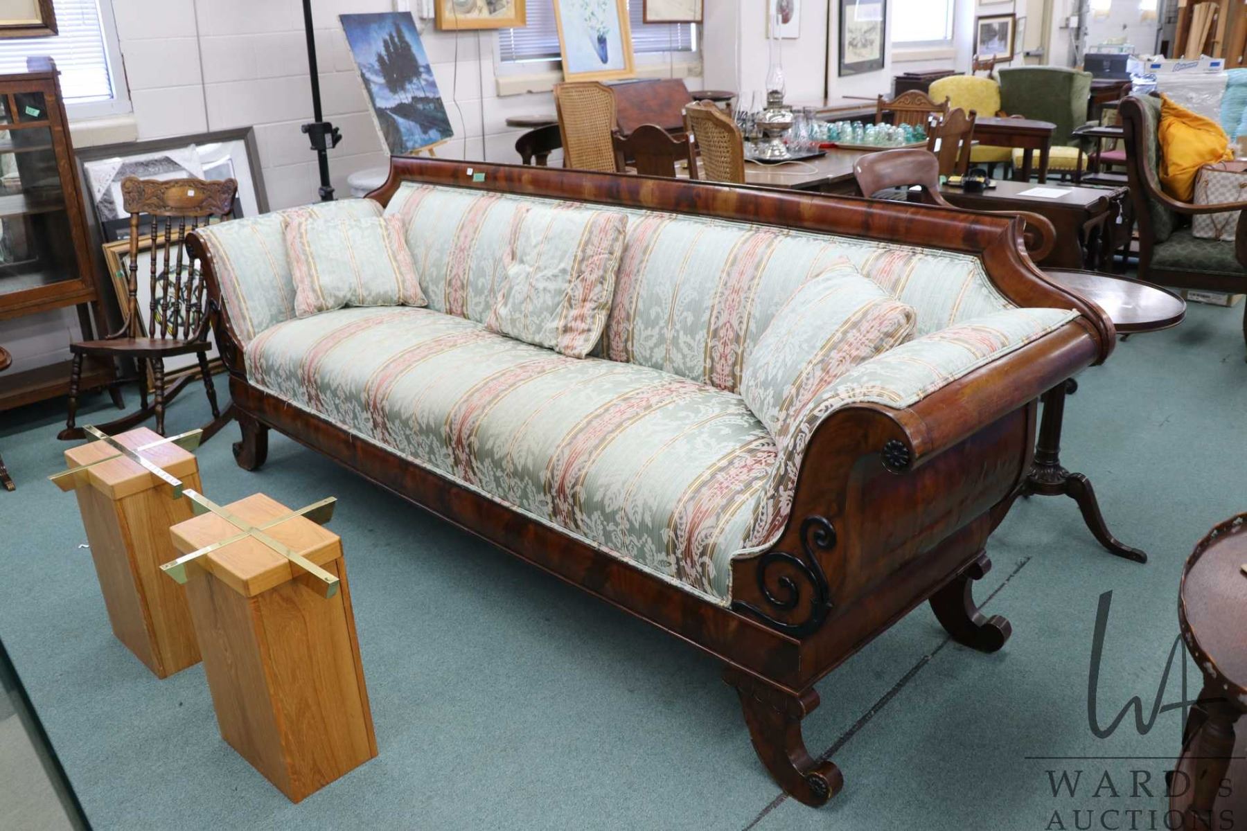 Antique mahogany framed Regency sofa, refinished and re-upholstered. Includes three matching throw pillows, 38" H X 106" W X 29" D