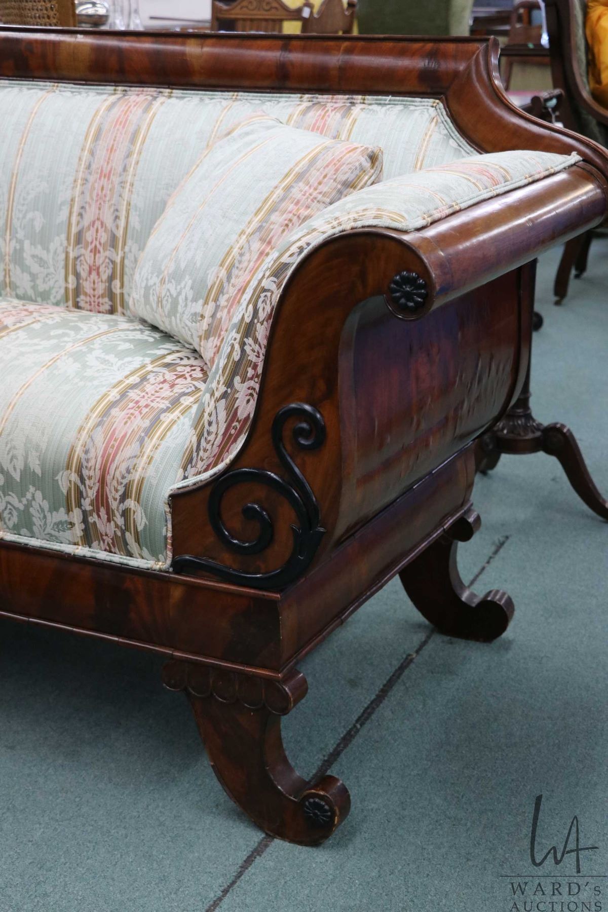 Antique mahogany framed Regency sofa, refinished and re-upholstered. Includes three matching throw p