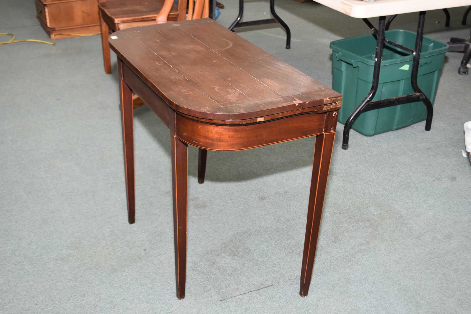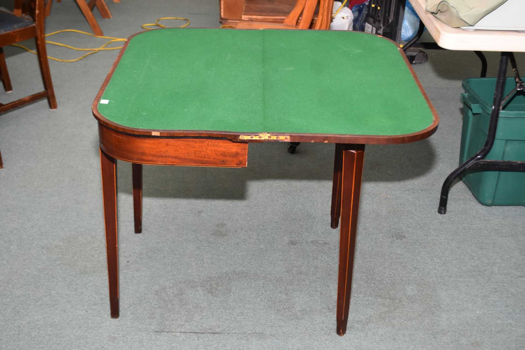Antique mahogany gate leg fold over games table with felt playing surface and inlaid satin wood banding on skirt