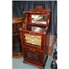 Antique mahogany music cabinet with glazed door displaying and exposing labled music storage and a tip front lower compartment with divided music storage and decorative carved panel on lower door and carved backboard, 49" H X 20" W X 16" D
