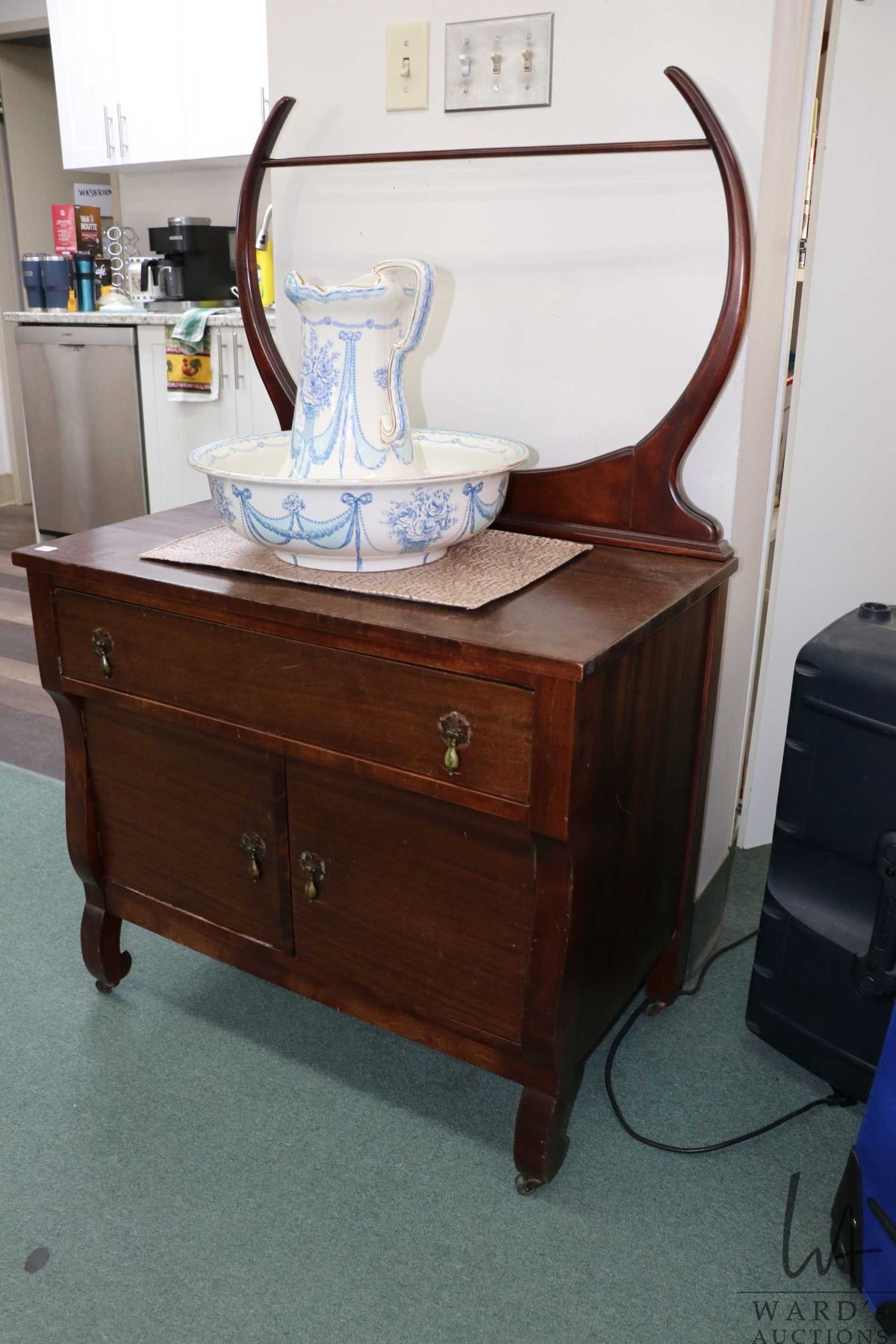 Antique mahogany, two door, one drawer Empire styl washstand with demi lune harp, 28" H, not includi