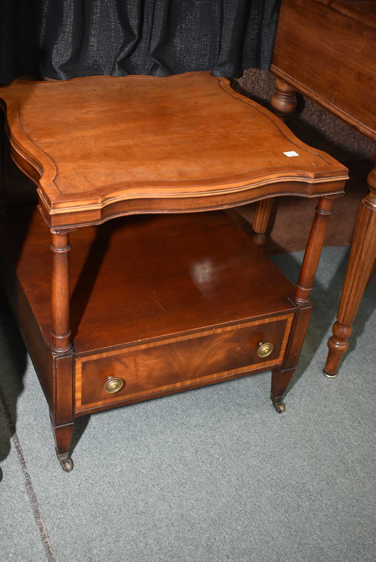 Antique mahogany two tier side table with single drawer and brass castors