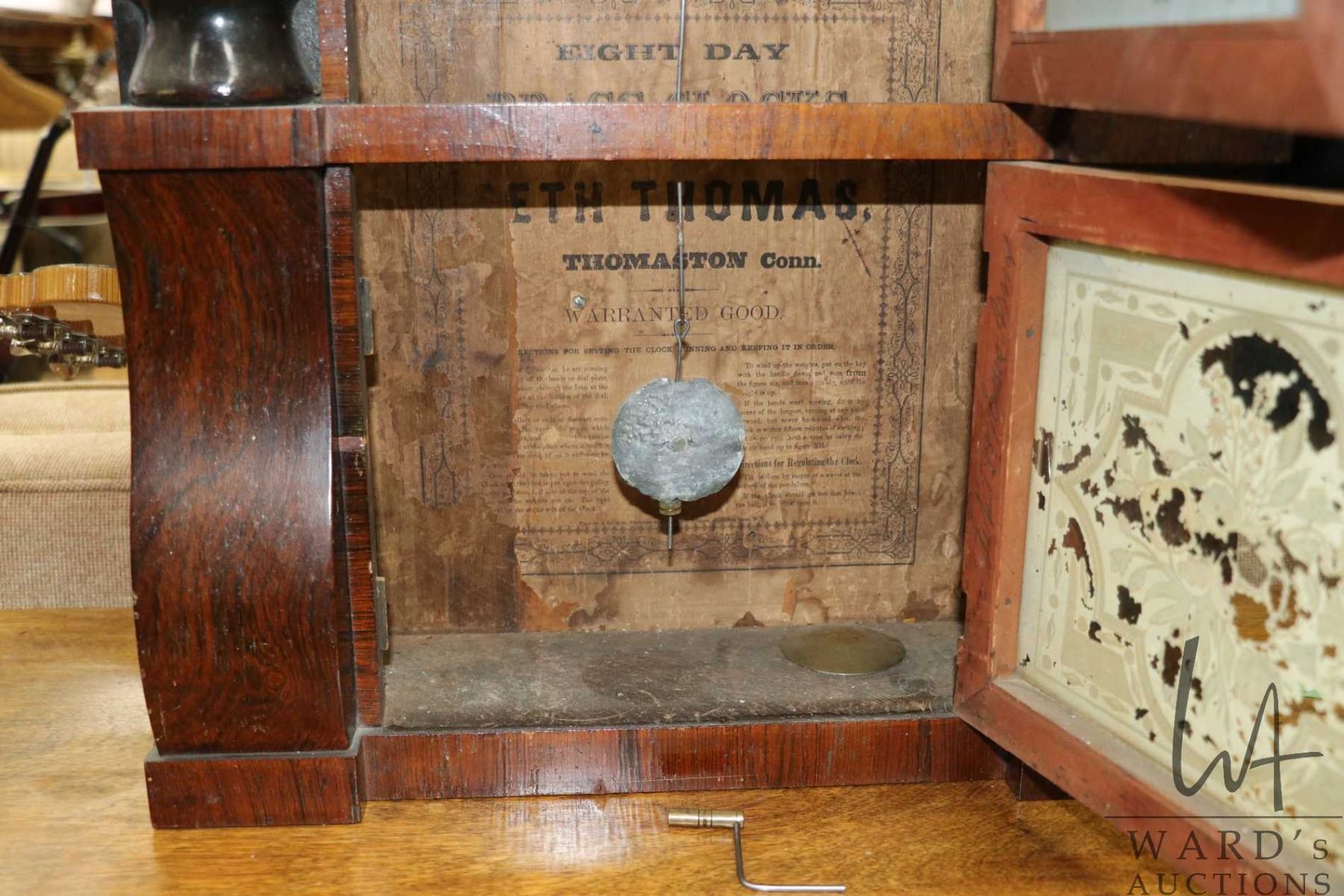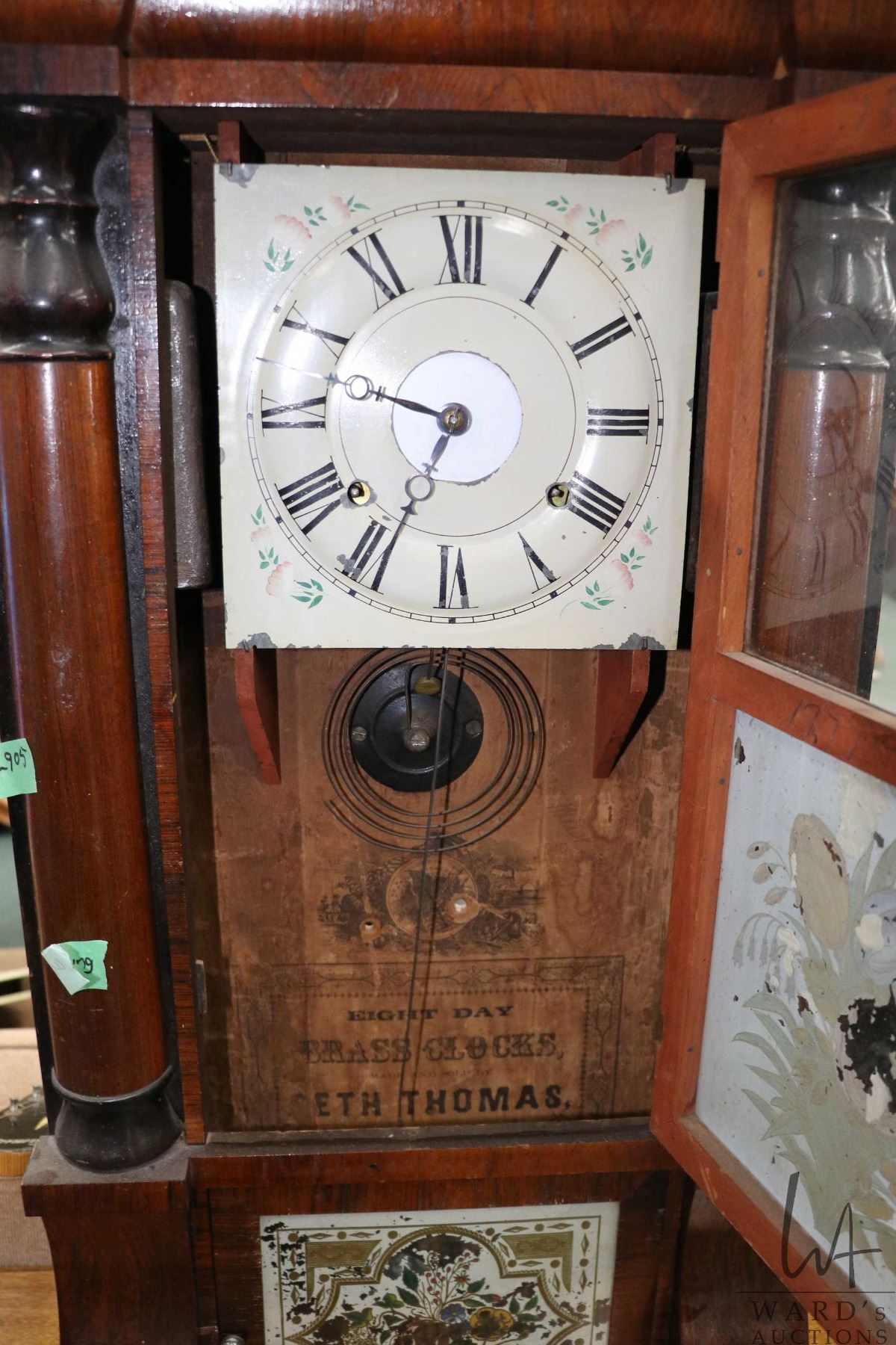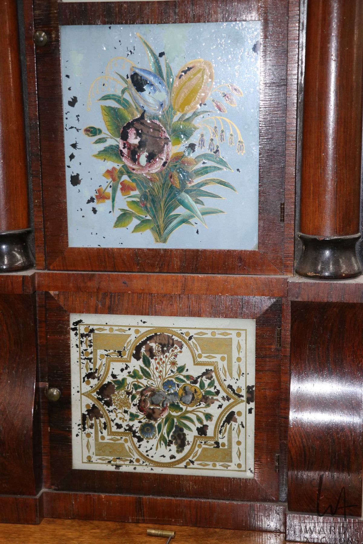 Antique mantle clock with reverse painted glass doors, eight door movement and faux columns, made by Seth Thomas, working at time of cataloguing