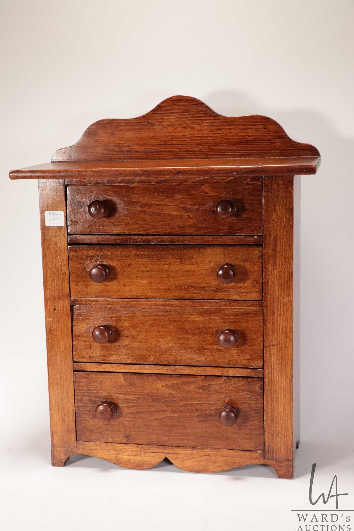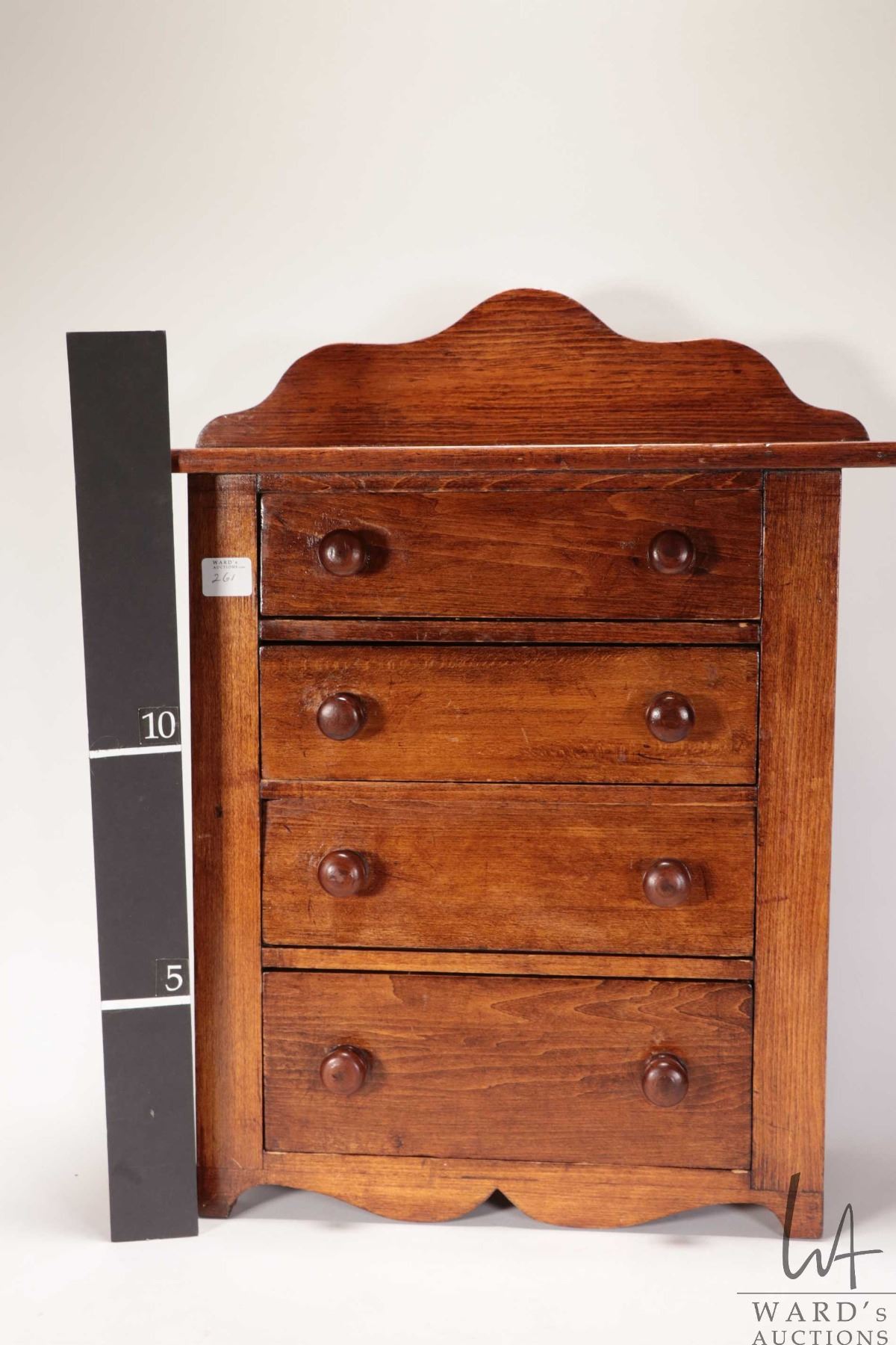 Antique miniature table top dresser with four drawers and original hardware, 19" including backboard