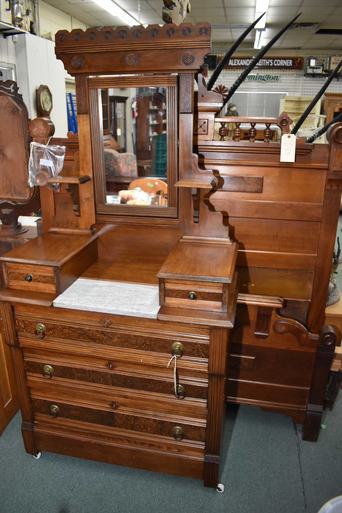 Antique mirrored dresser with candle shelves, six drawers and small marble section for top and tailing plus 54" headboard, footboard and rails