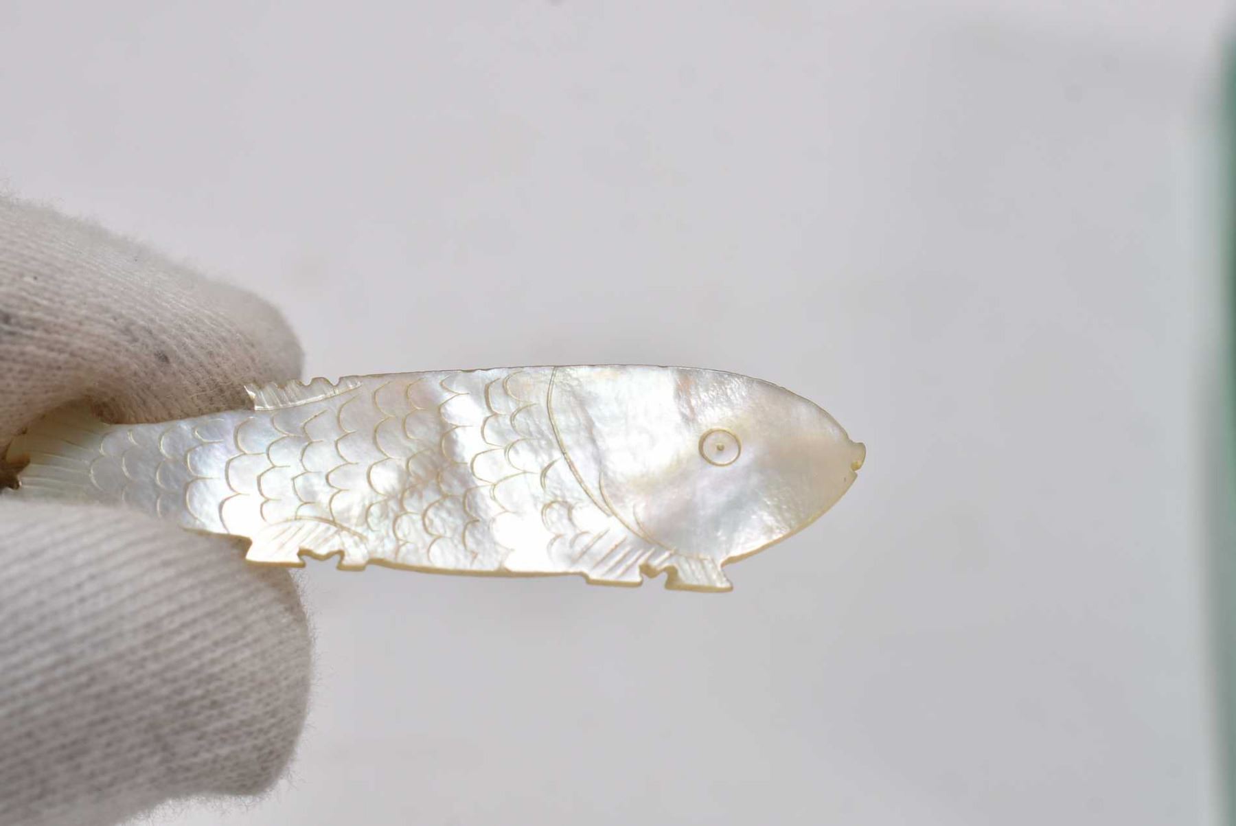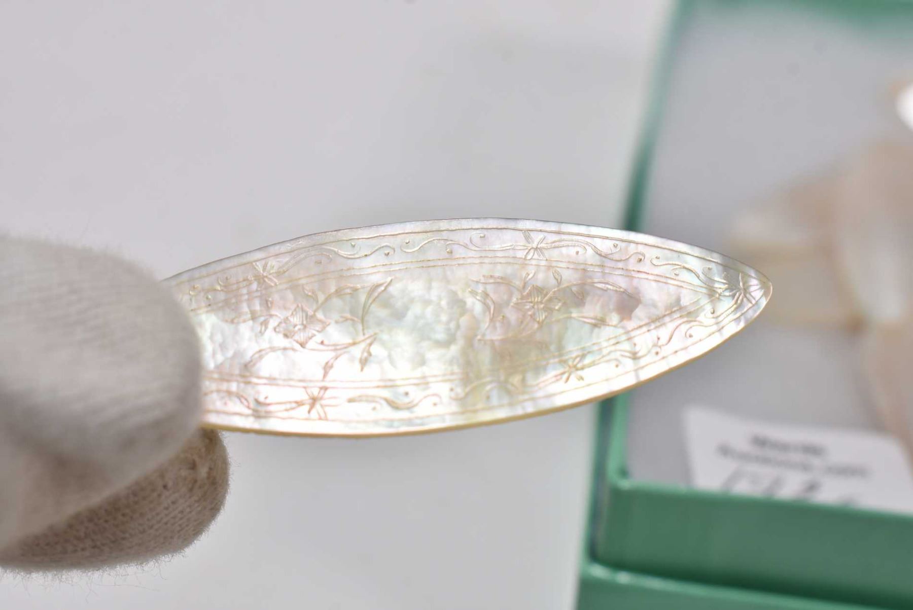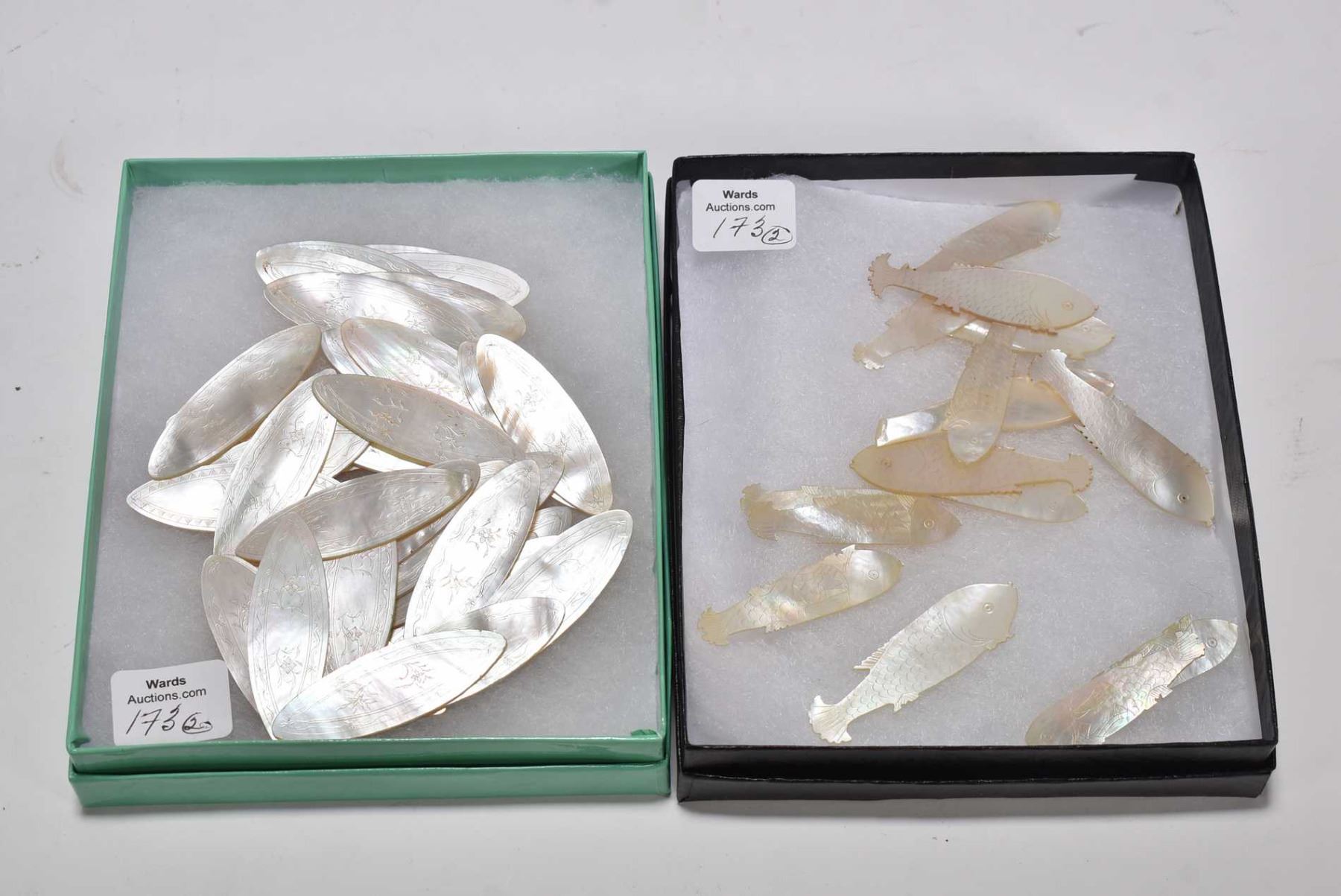 Antique mother-of-pearl gaming counters including fourteen fish and forty petal shaped, all intricately engraved