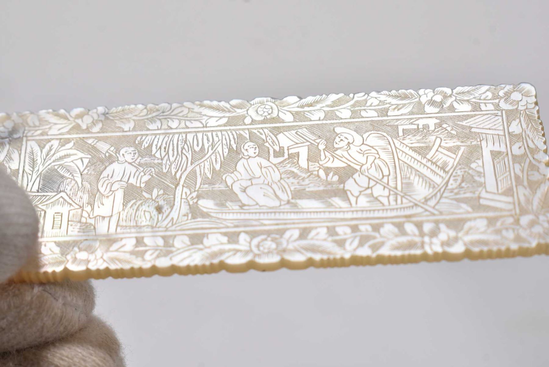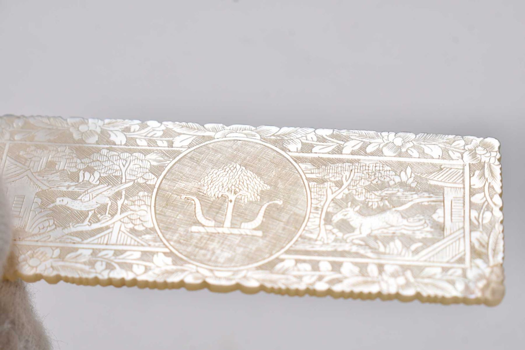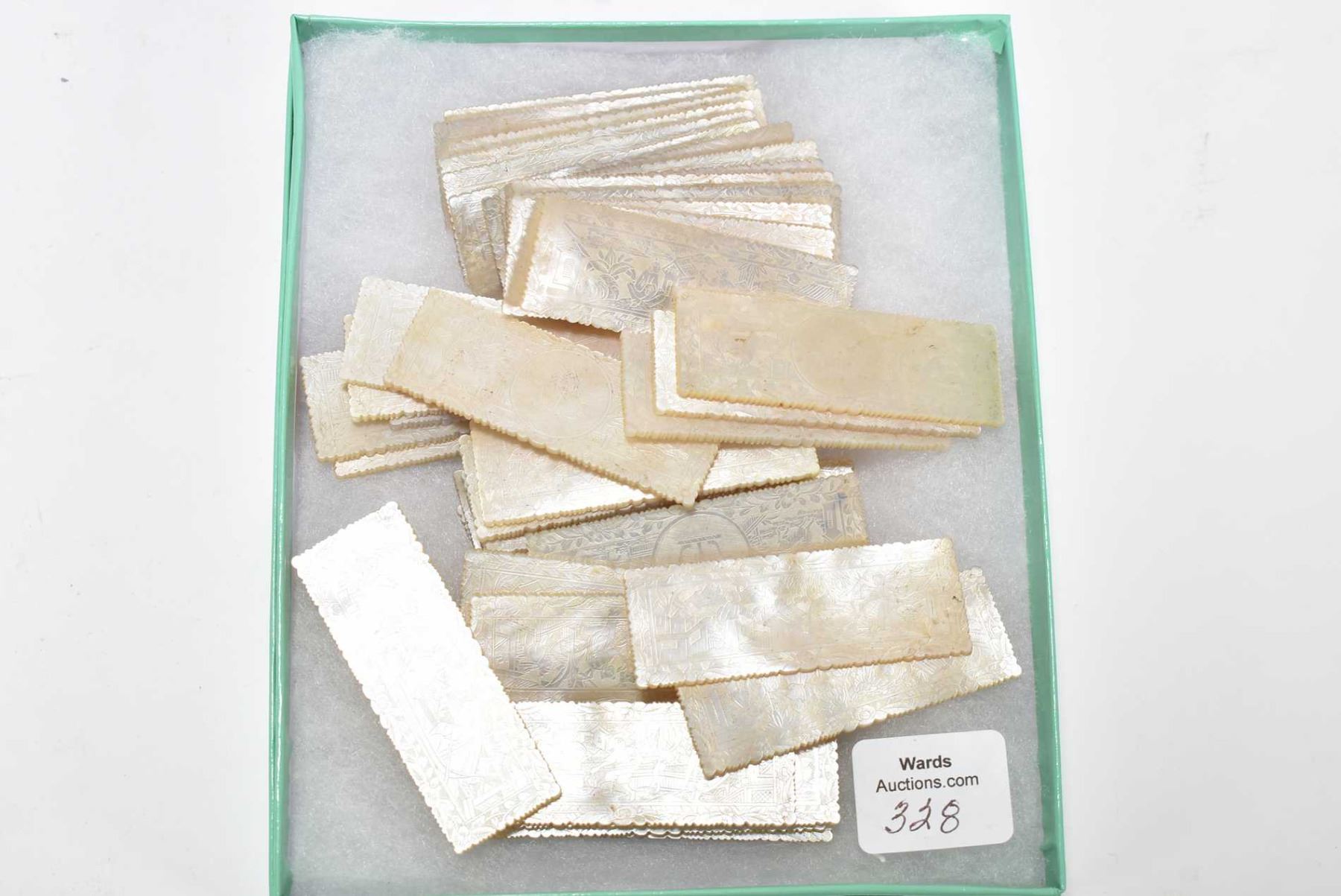 Antique mother-of-pearl gaming counters with pagoda and courtyard scenes, approximately forty