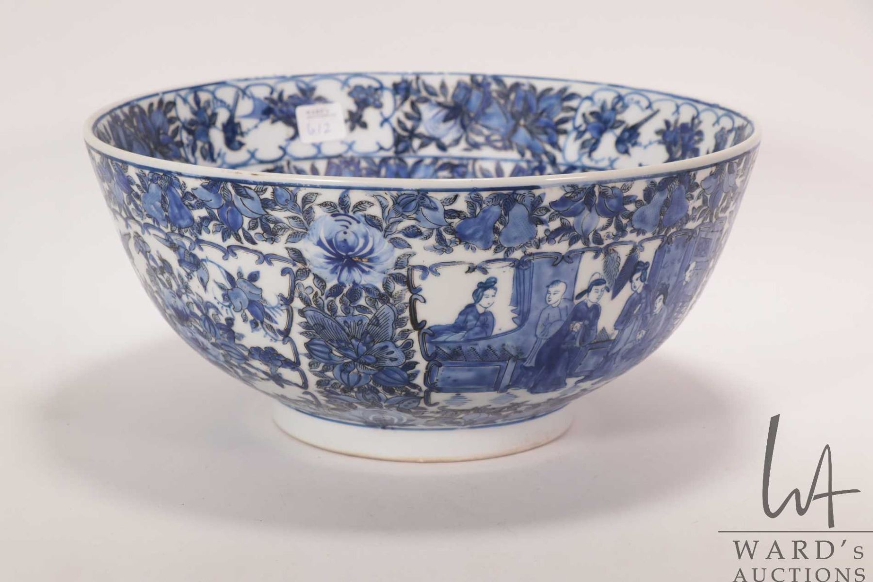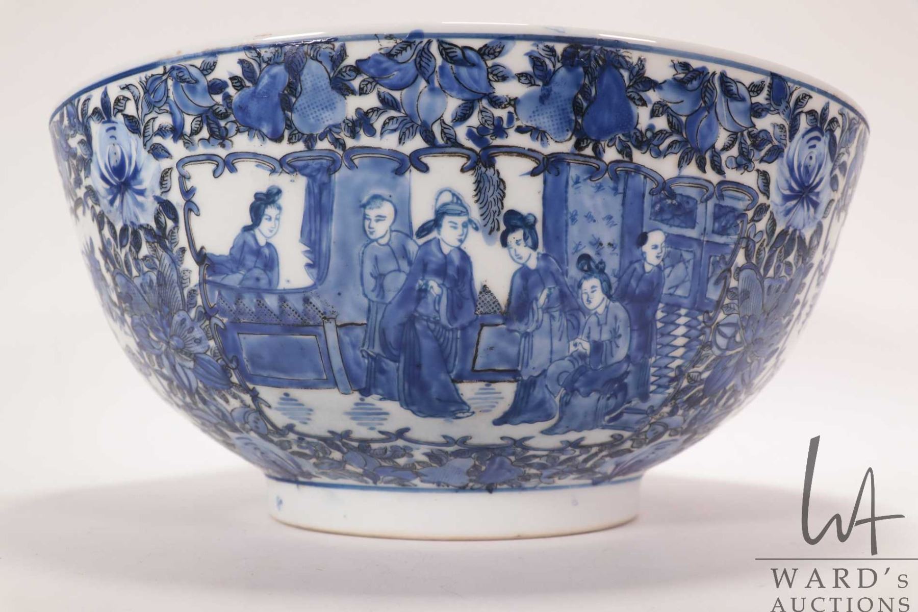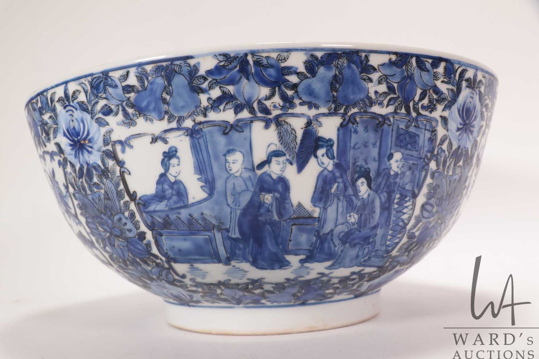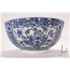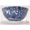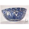 Antique nineteen century blue and white Chinese bowl with hand painted flowers, bird and court scene, 12" in diameter X 5 1/2" in height