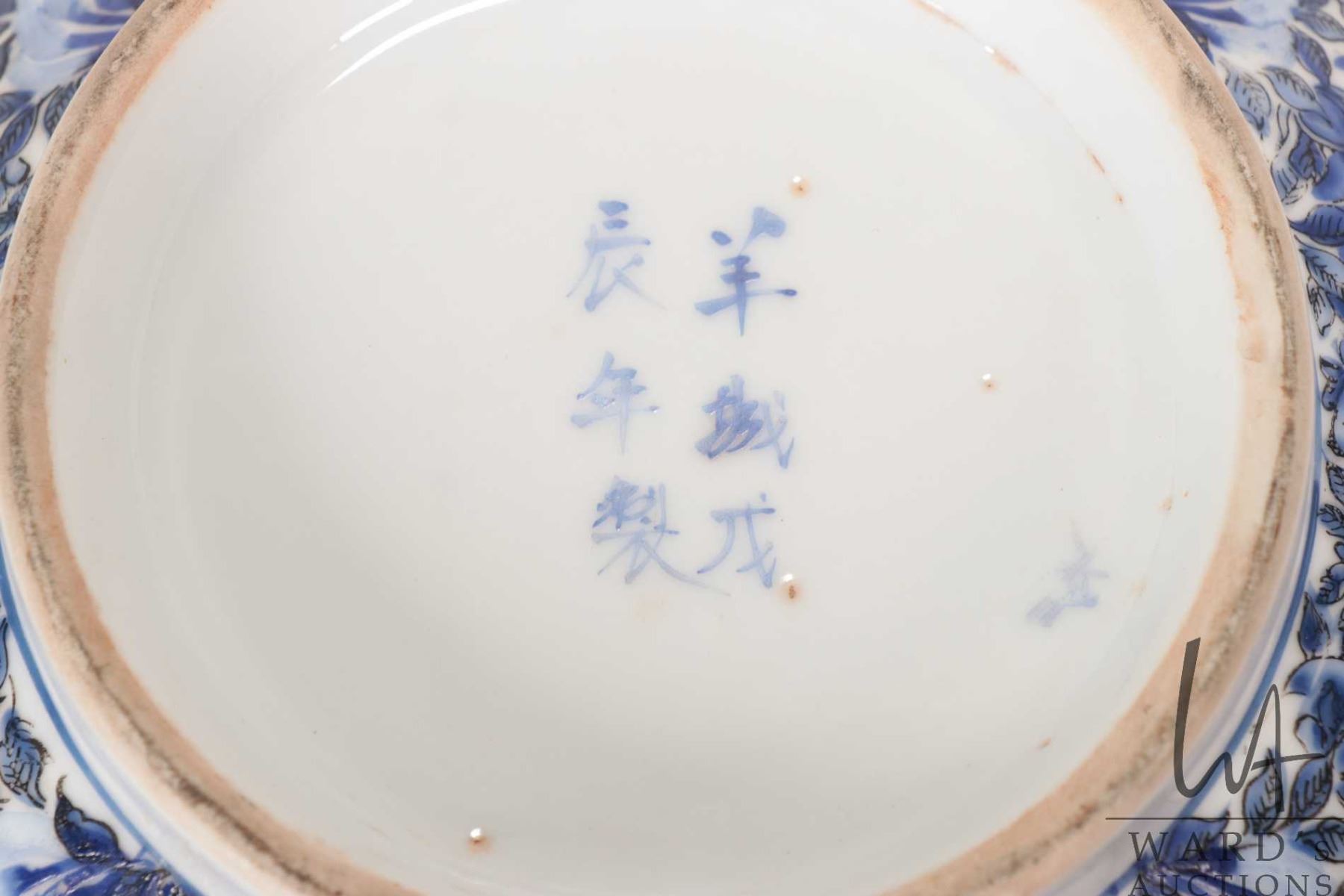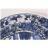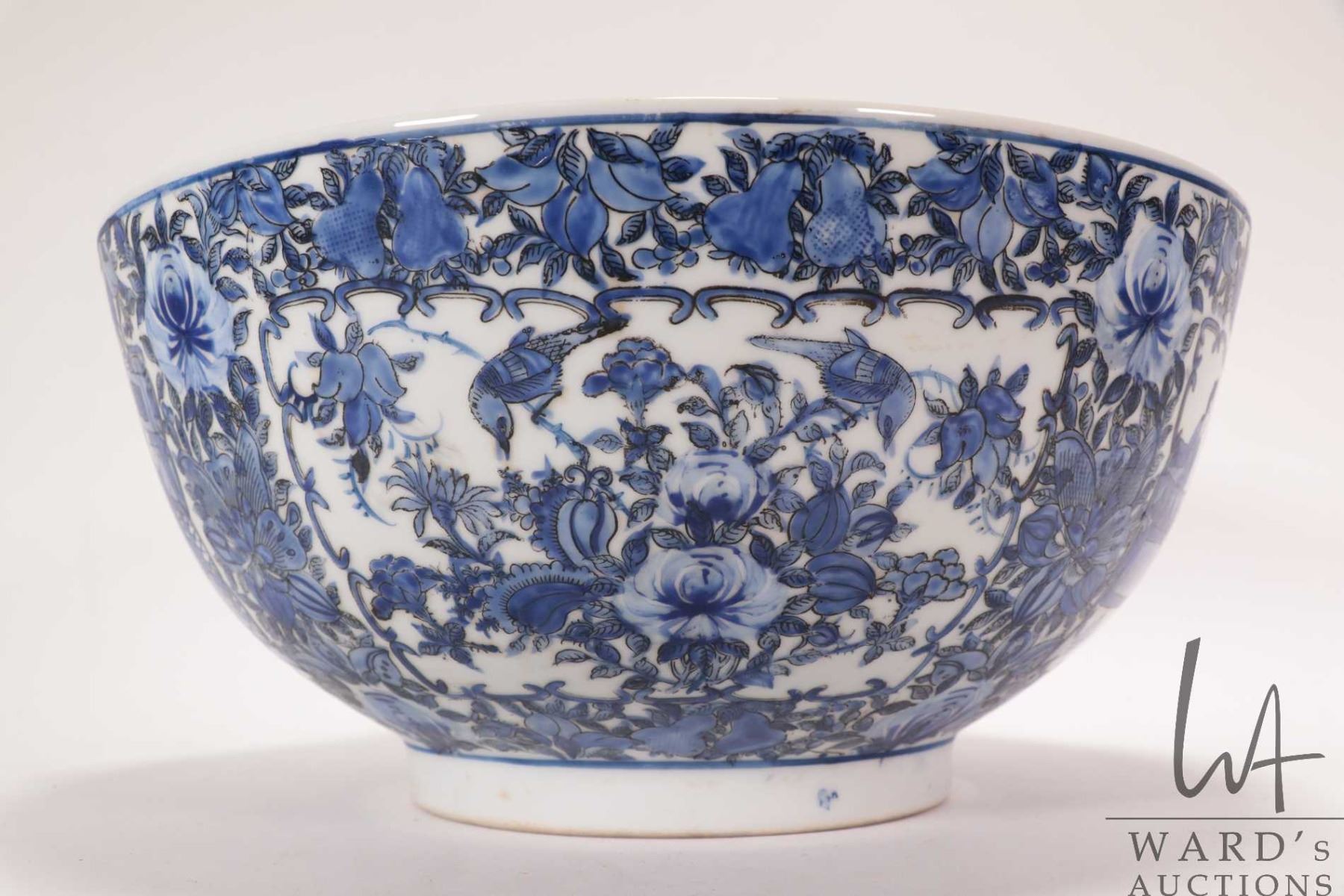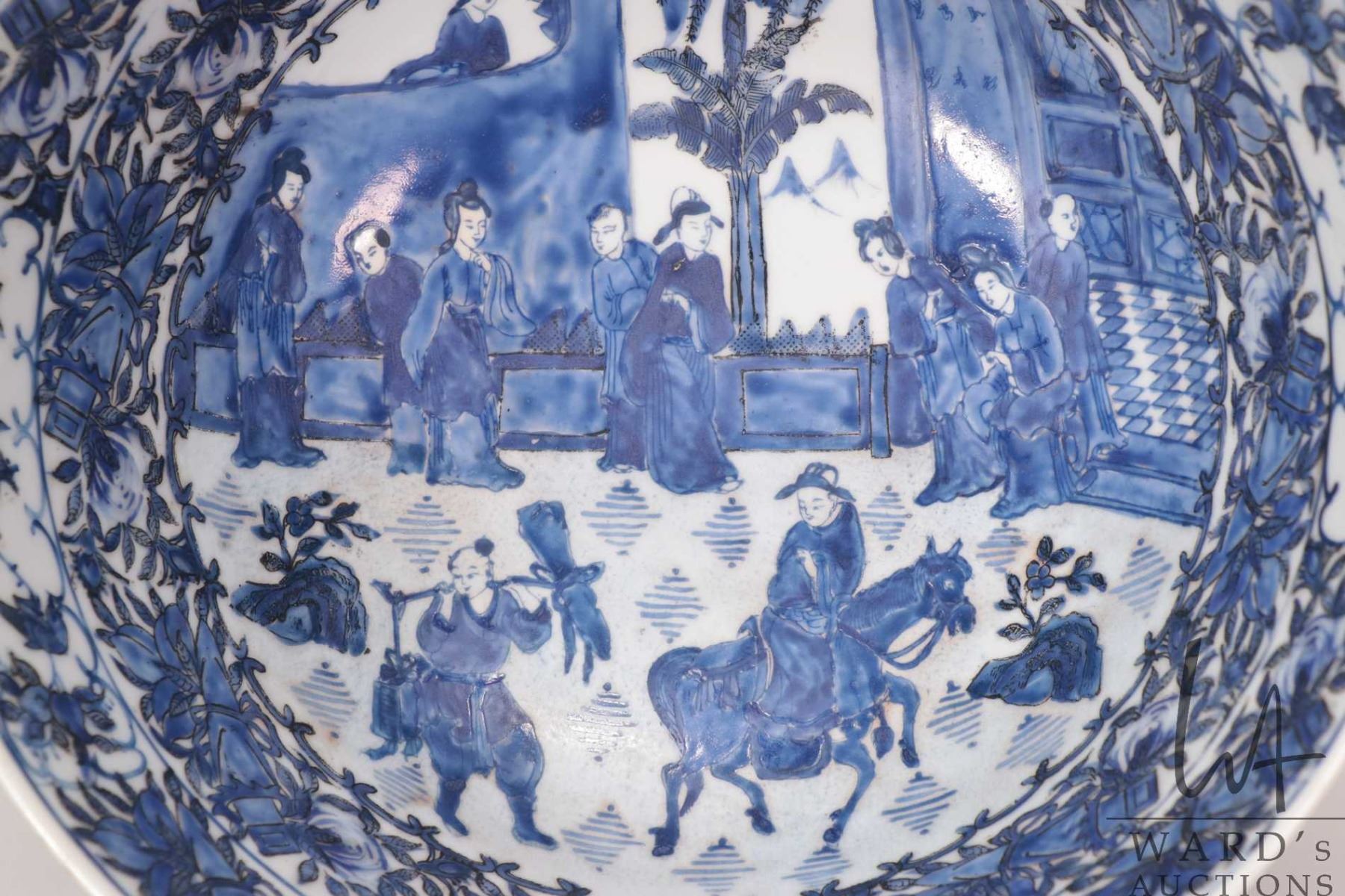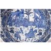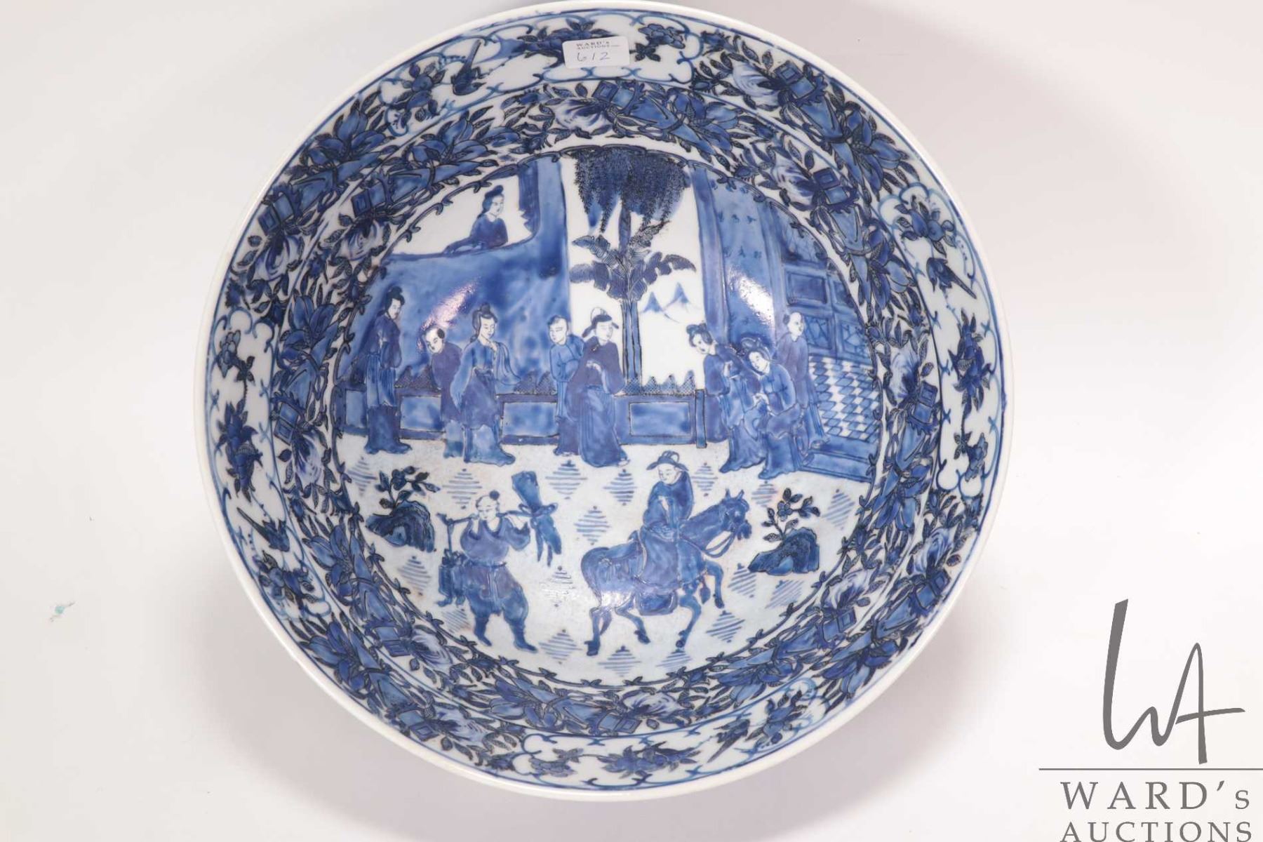 Antique nineteen century blue and white Chinese bowl with hand painted flowers, bird and court scene, 12" in diameter X 5 1/2" in height