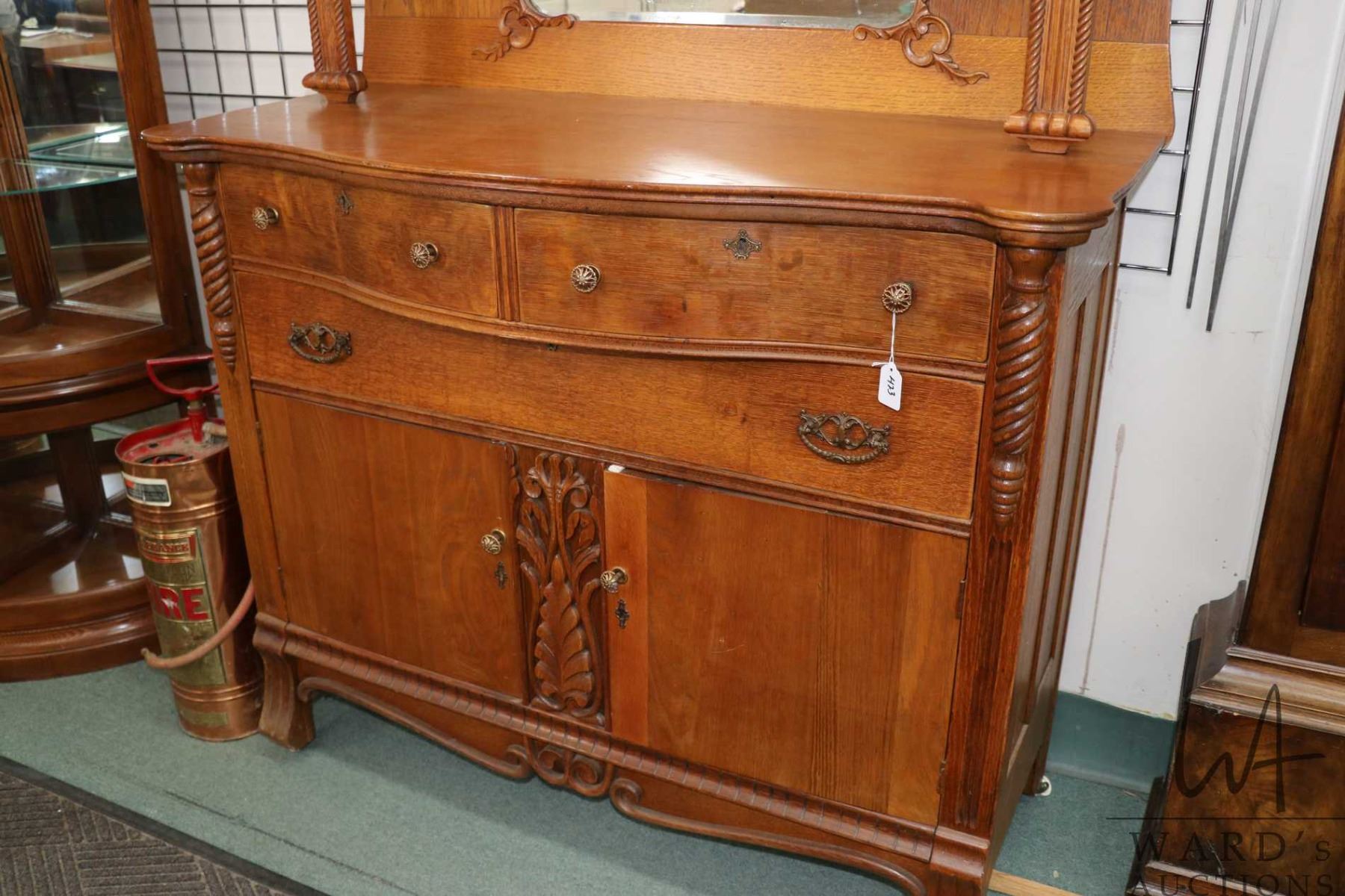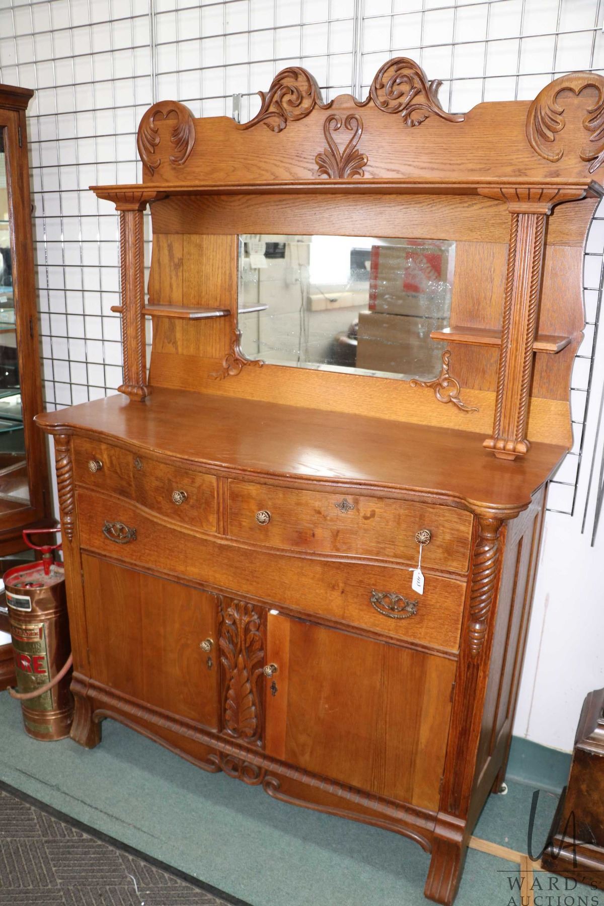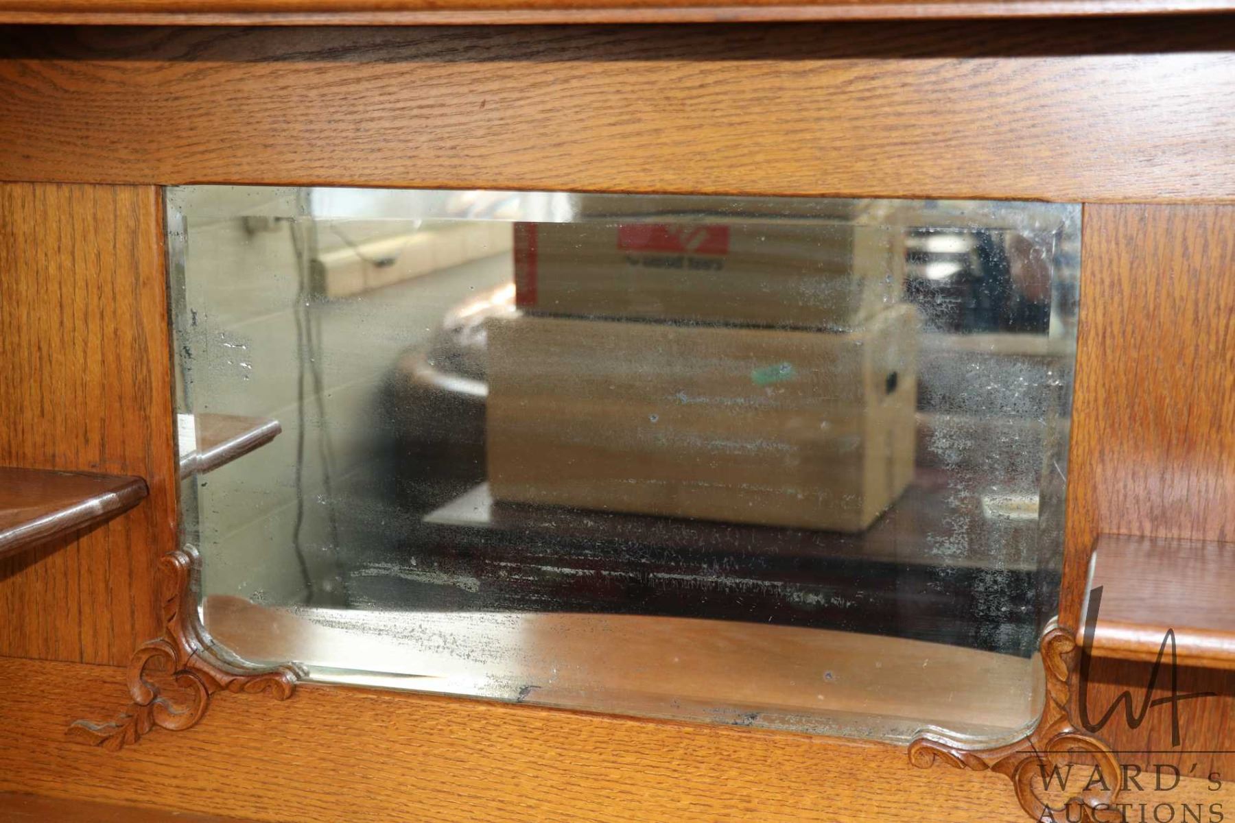 Antique oak Canadian sideboard with tall backboard, beveled mirror and attached carved decoration, 4