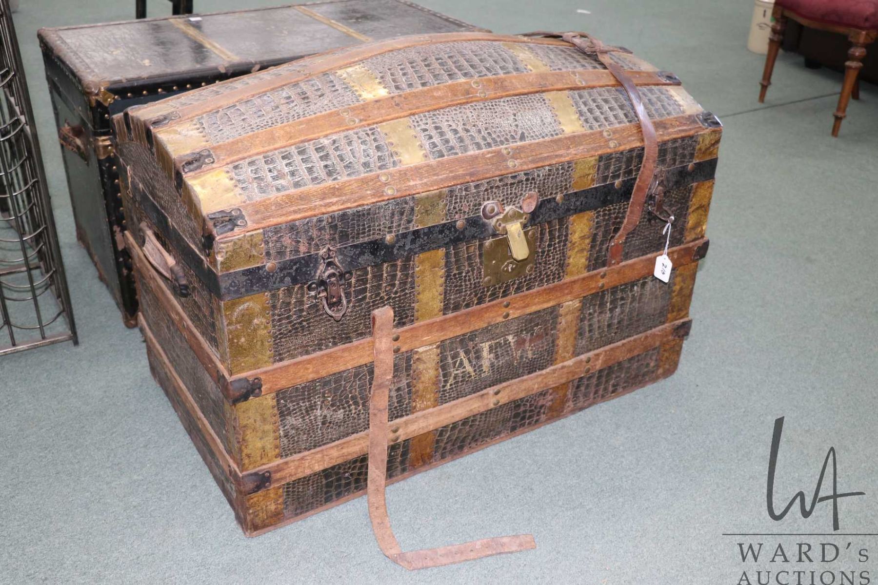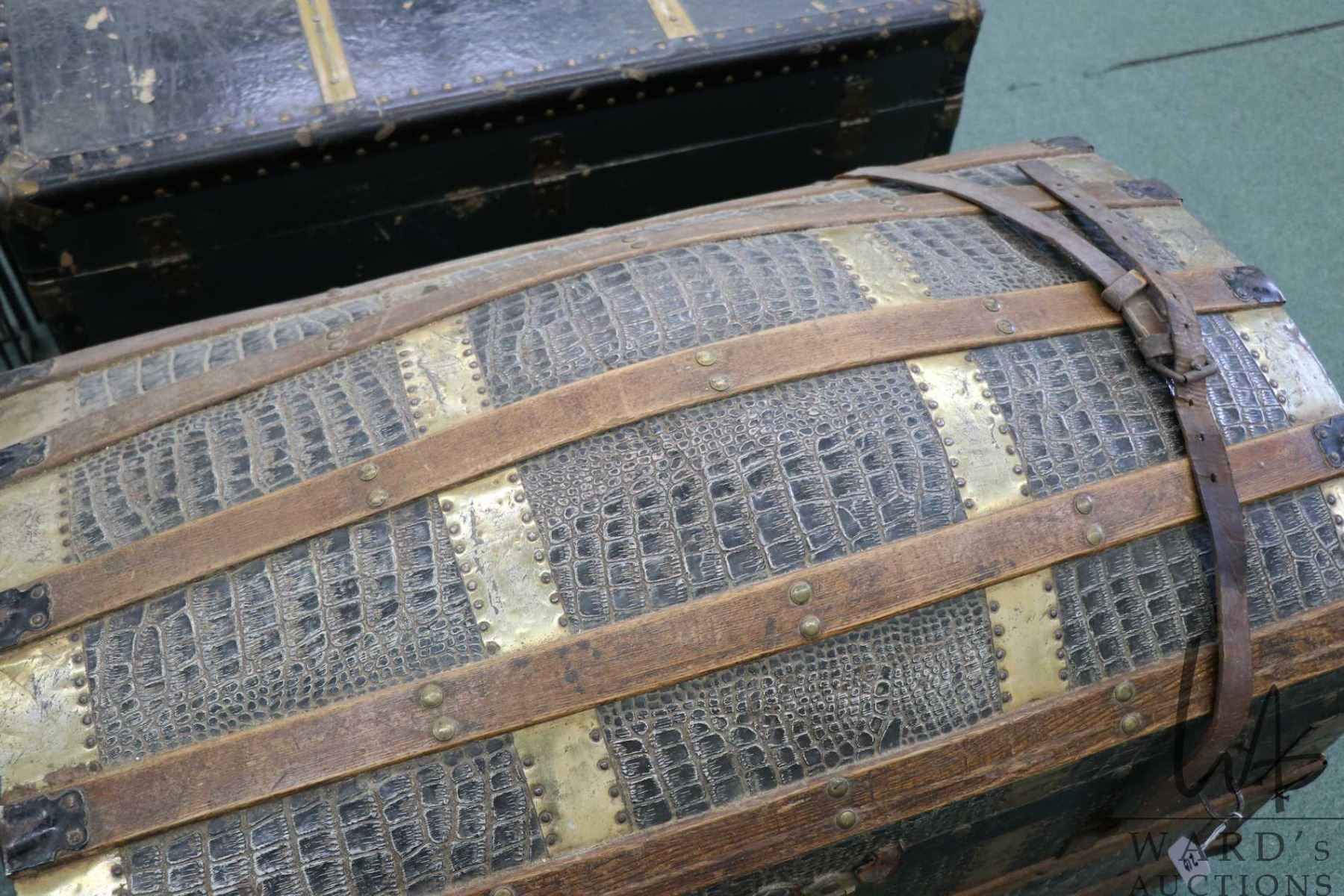 Antique oak and leather bound metal wrapped dome top steamer trunk, note: part of leather strap is i