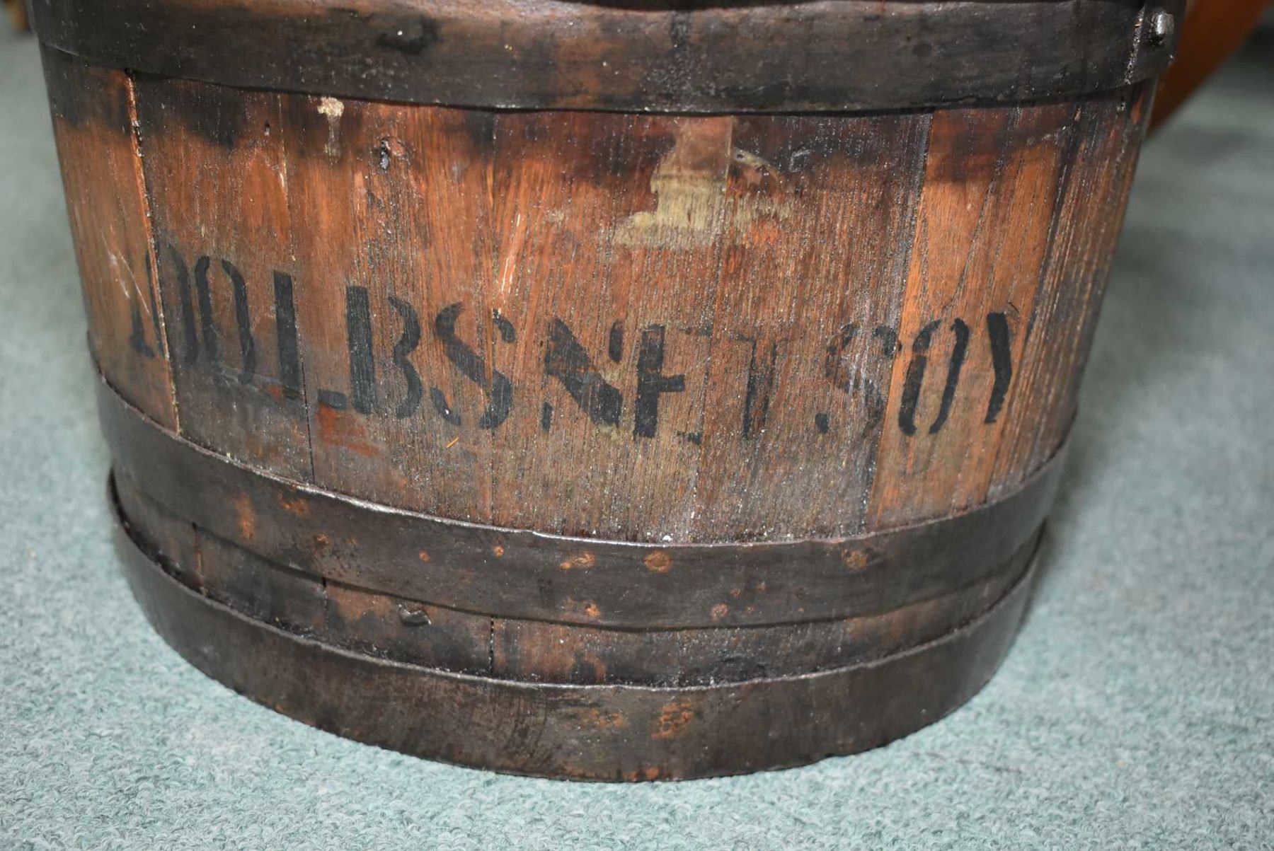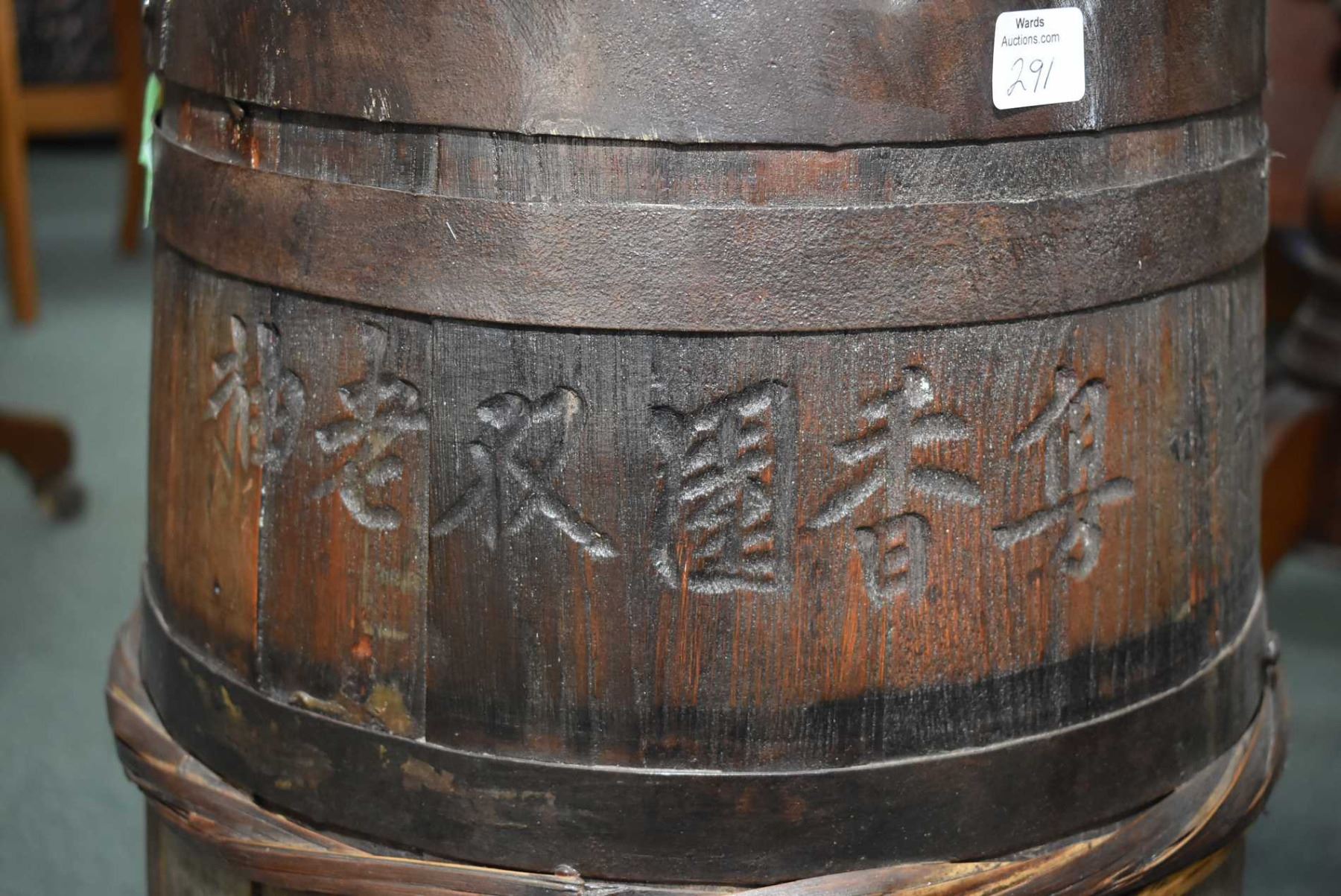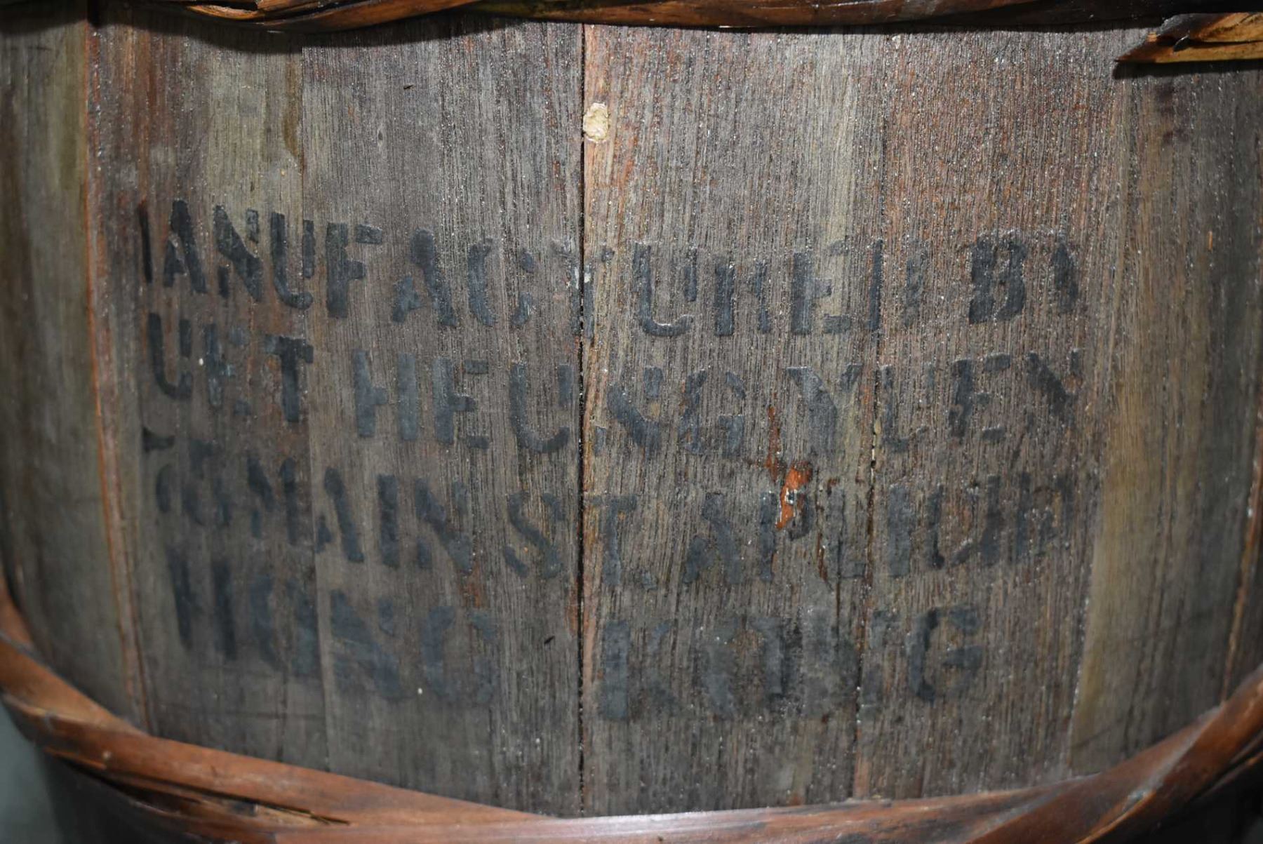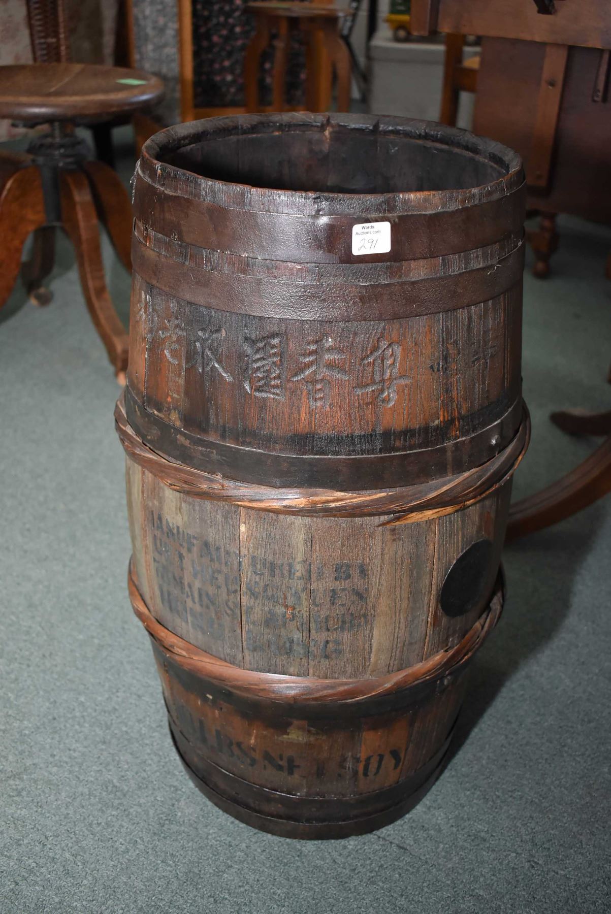 Antique oak and metal bound barrel with Oriental carved script and stamped Hong Kong etc. 24" in height