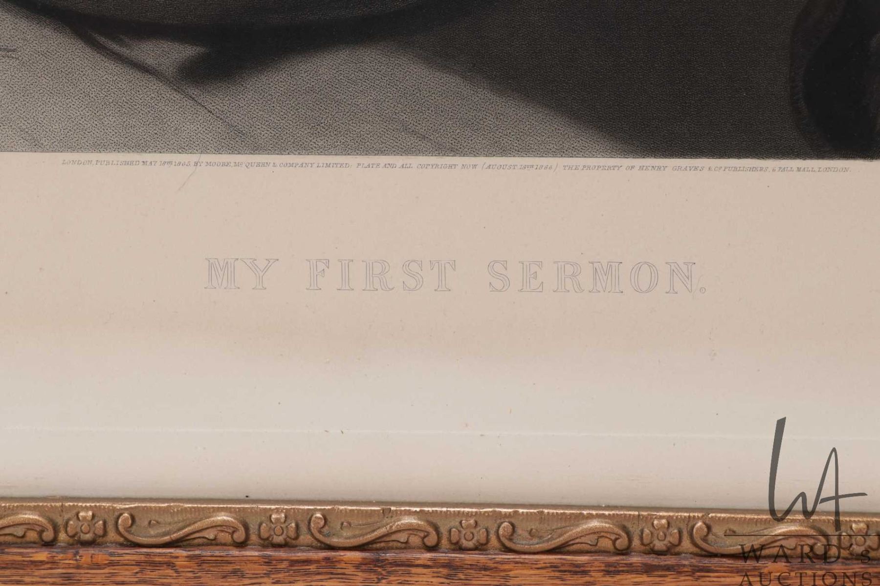 Antique oak framed etched print titled "My First Sermon", outside dimensions including oak frame 32"