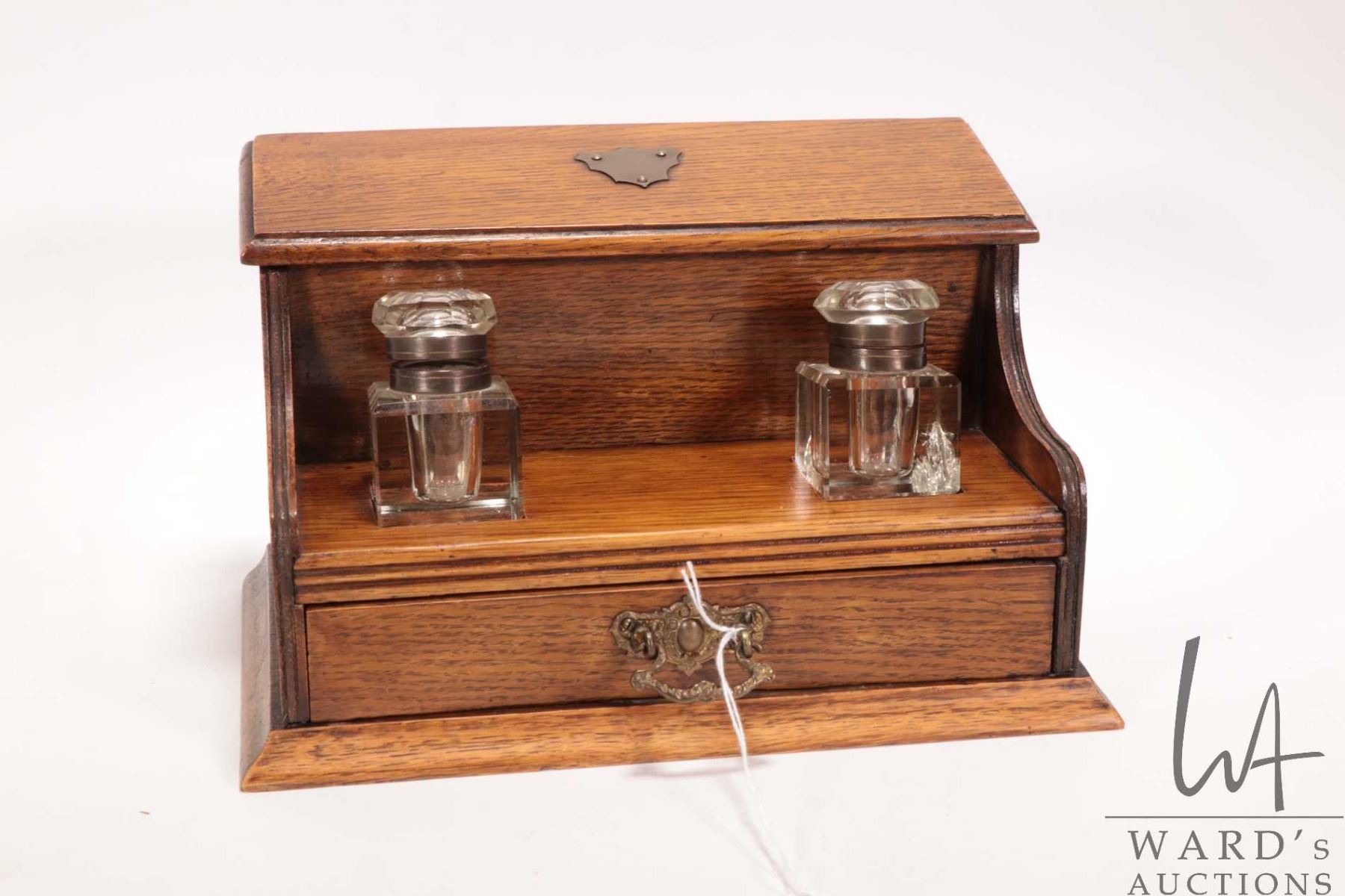 Antique oak letter stand with pen holders in pull out drawer and flip up stationary storage, included to hinged lid glass inkwells that don't quite fit, note: one has chipped corner, 6"H X 10" W X 6 1/2" D