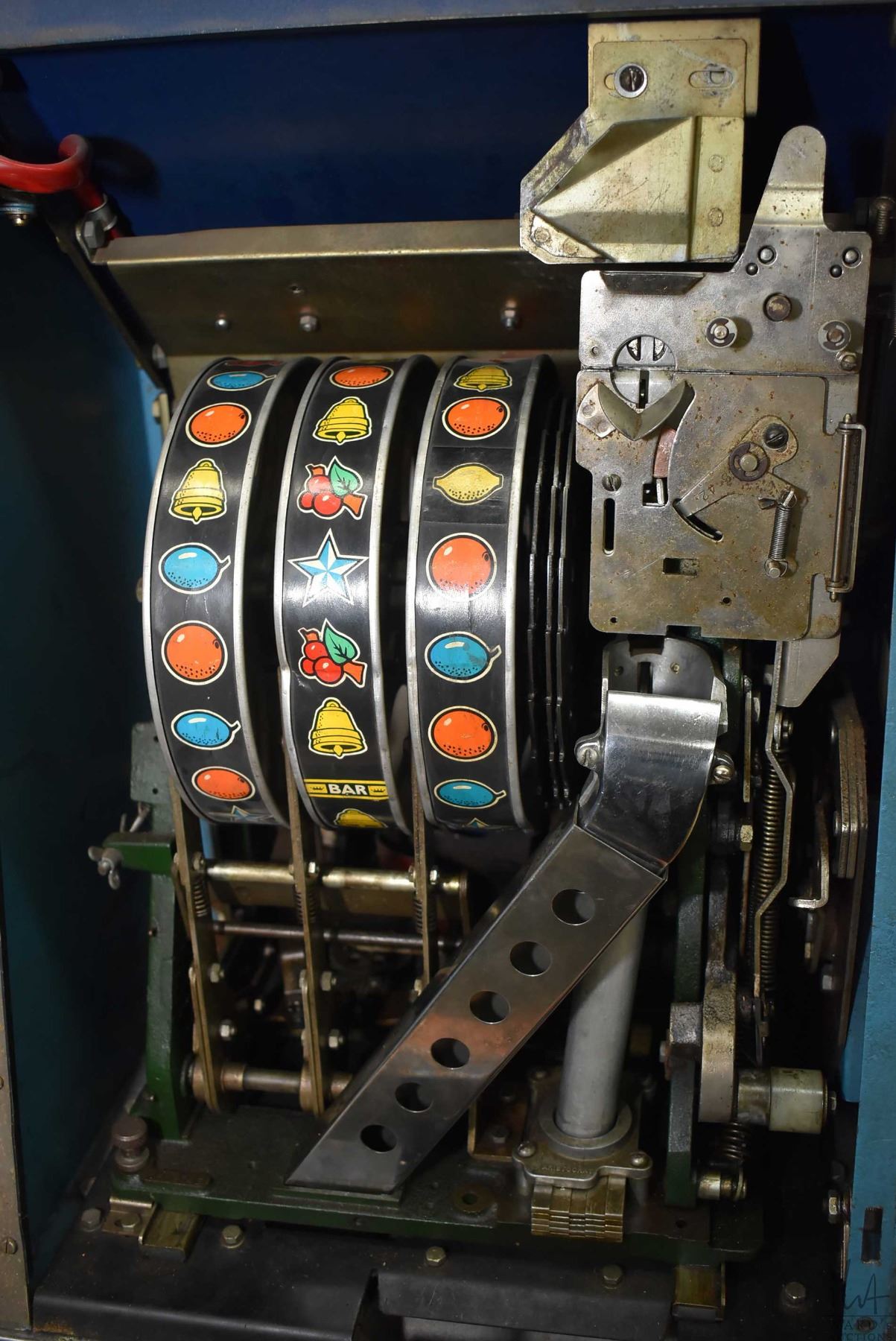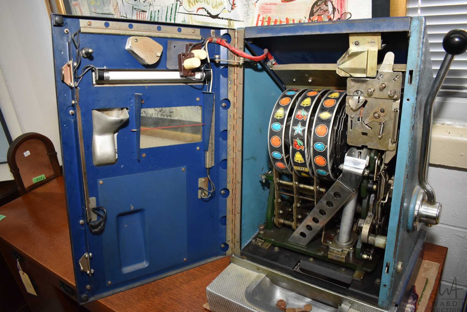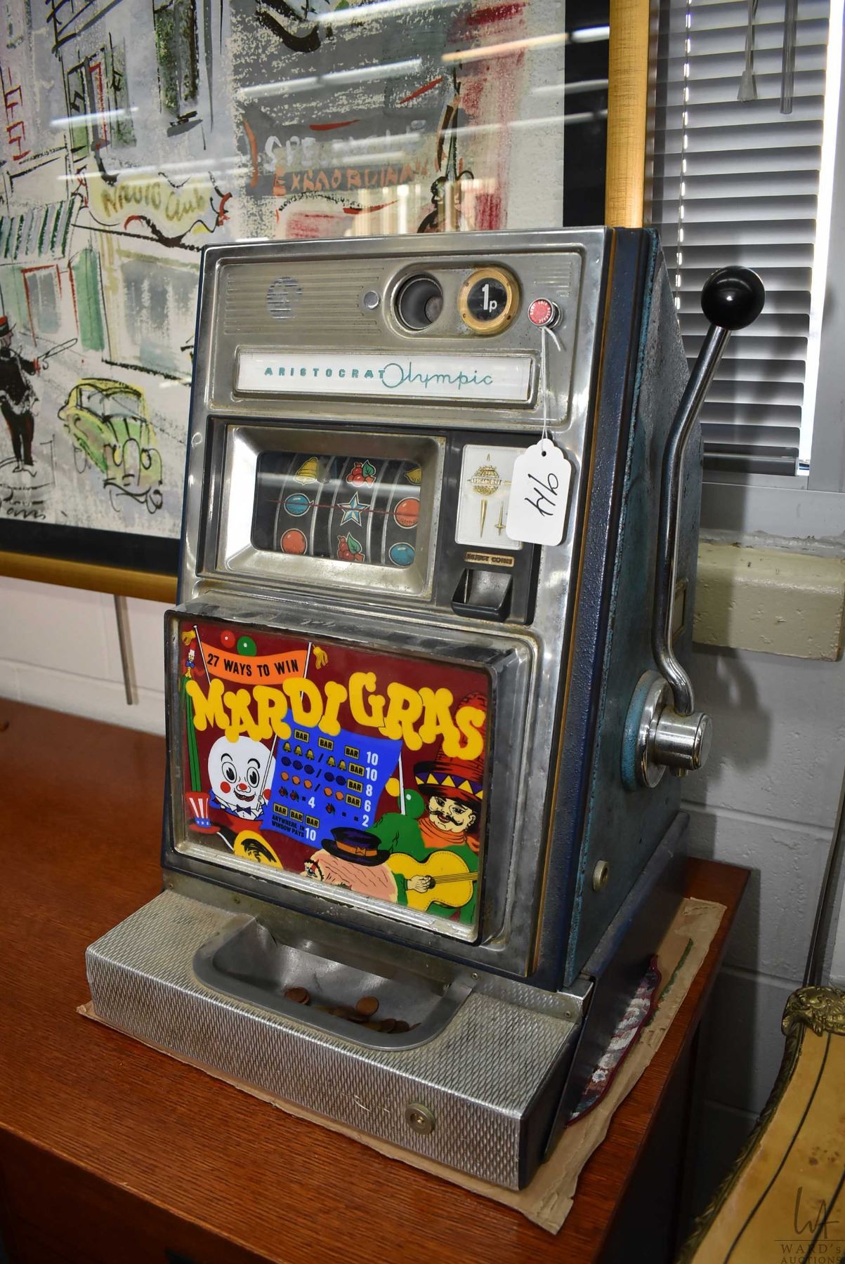 Antique one penny "Mardi gras" slot machine made by Aristrocrat Olympic, trying to work during time of cataloguing, for sure needs service, cleaning ? Note: This lot cannot be shipped. Local pickup only.