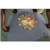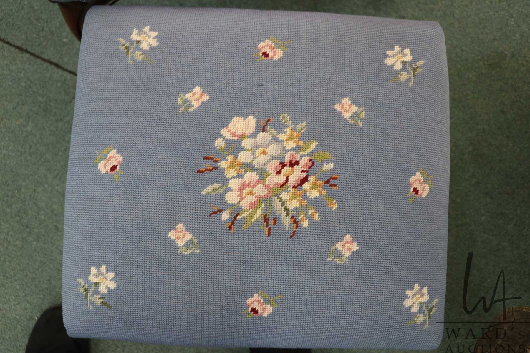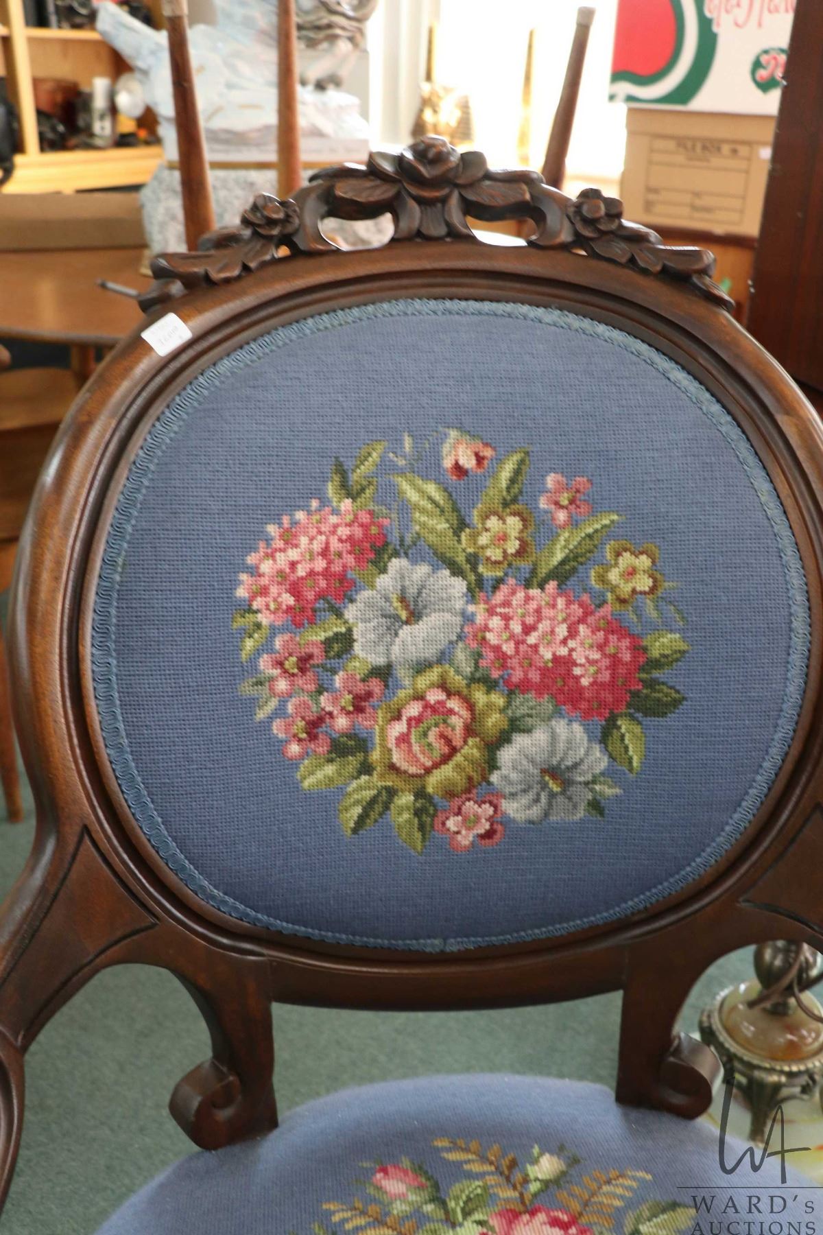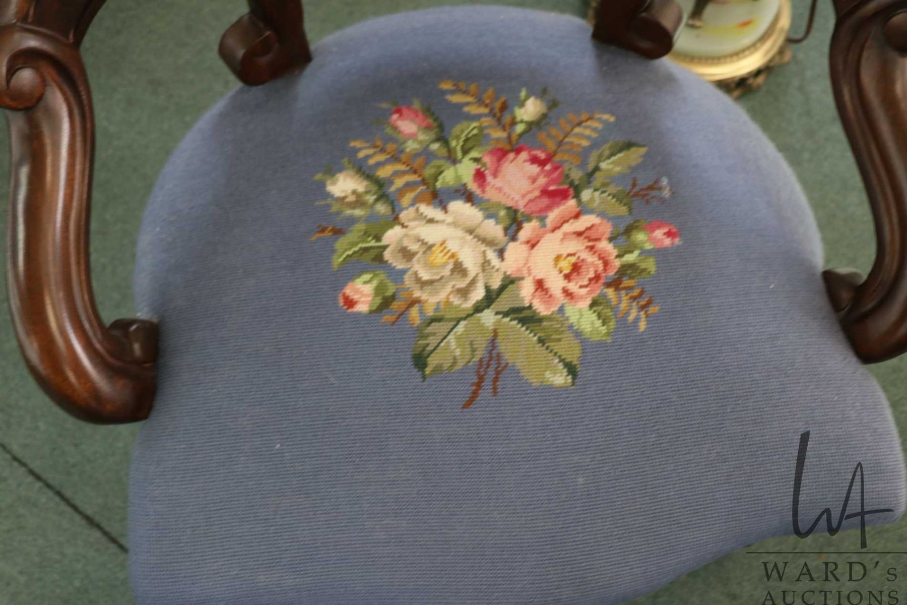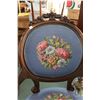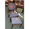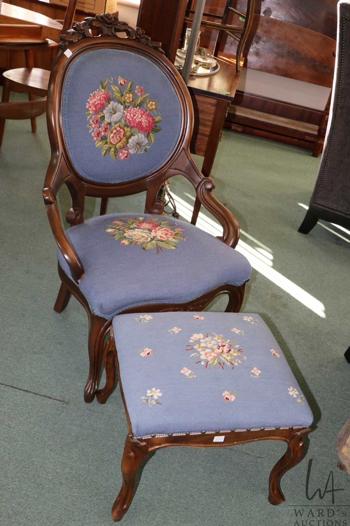 Antique open arm parlor chair w/ matching ottoman featuring decorative show wood and needlepoint upholstery