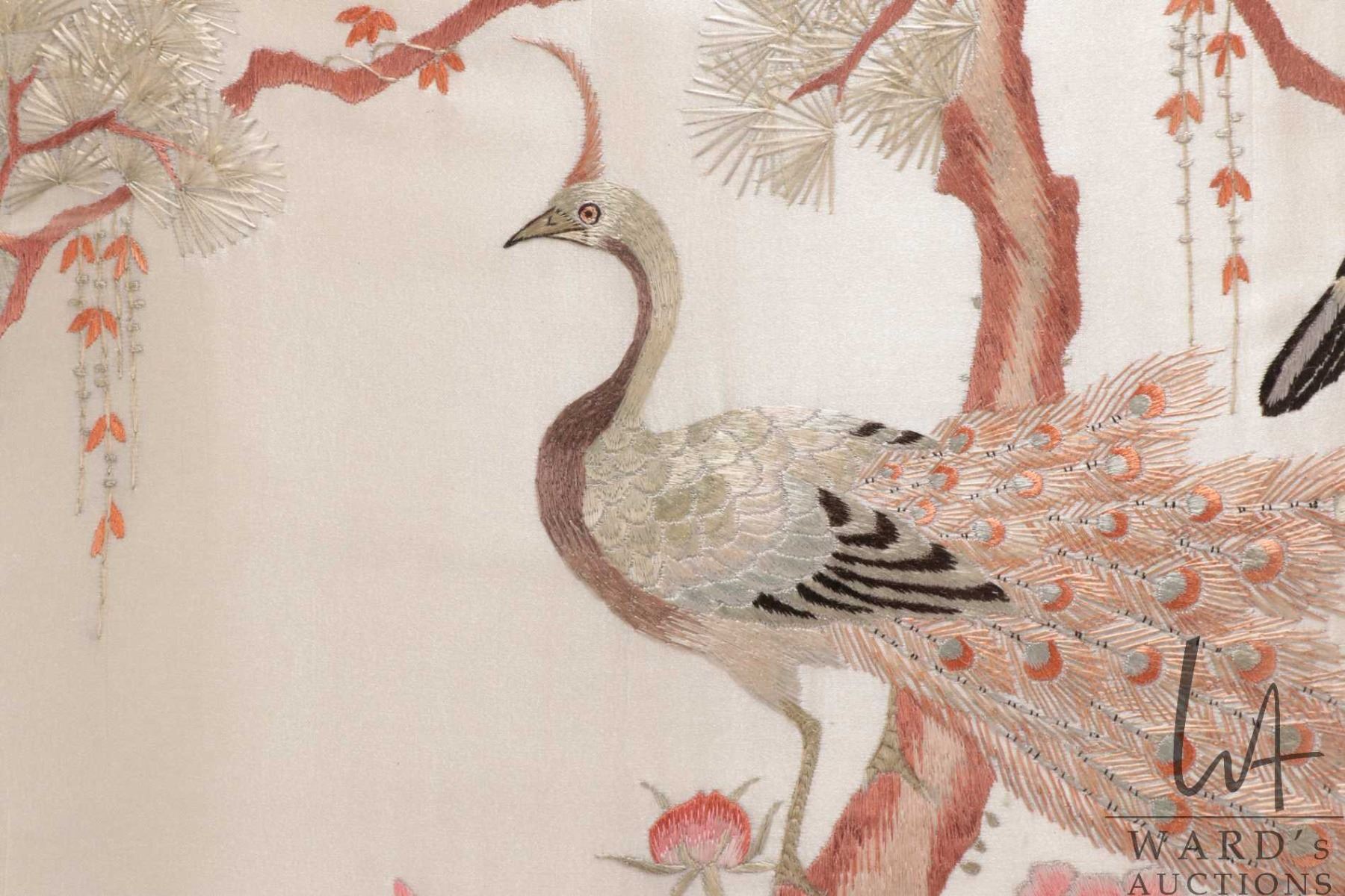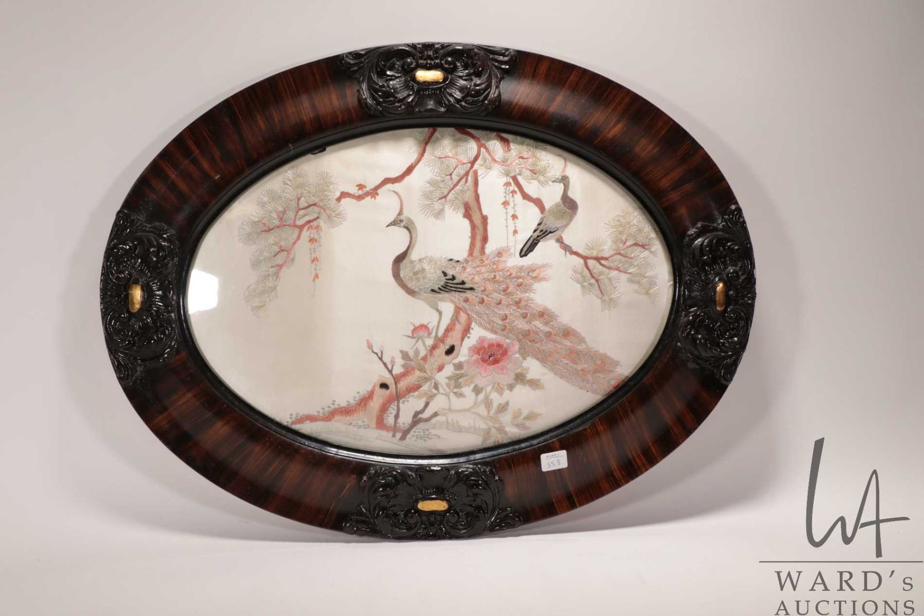 Antique oval convex glass frame with silk embroidered peacock, outside dimension 19" X 25"
