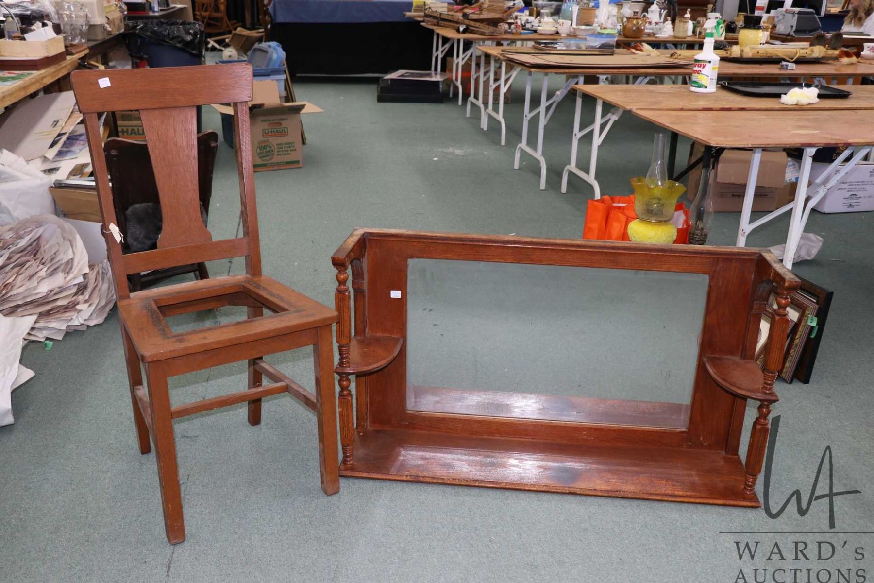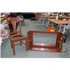 Antique over mantle with beveled mirror 23" H X 41" W X 10" D plus a t-back side chair, in need of new seat