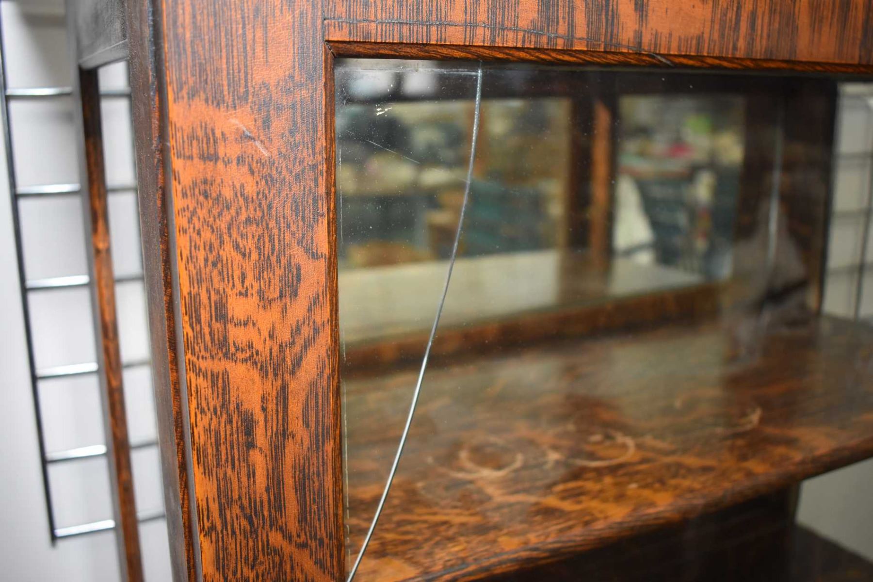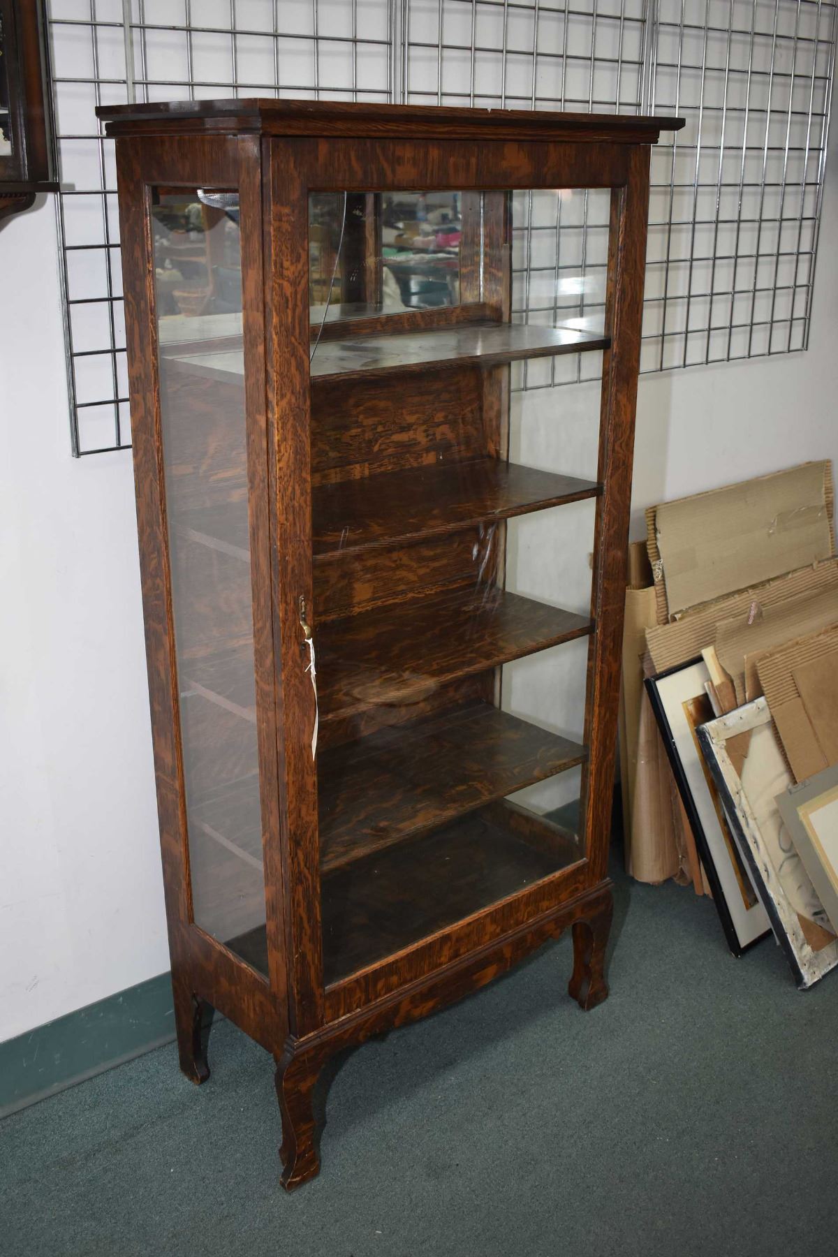 Antique painted oak Canadian single door curio cabinet with four shelves, mirrored back section and glazed side panels, note top left door glass cracked