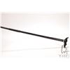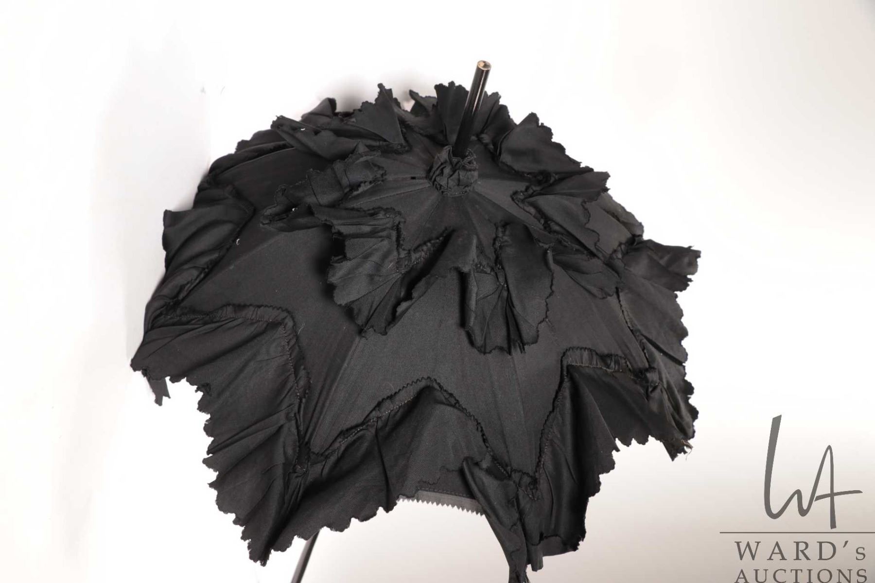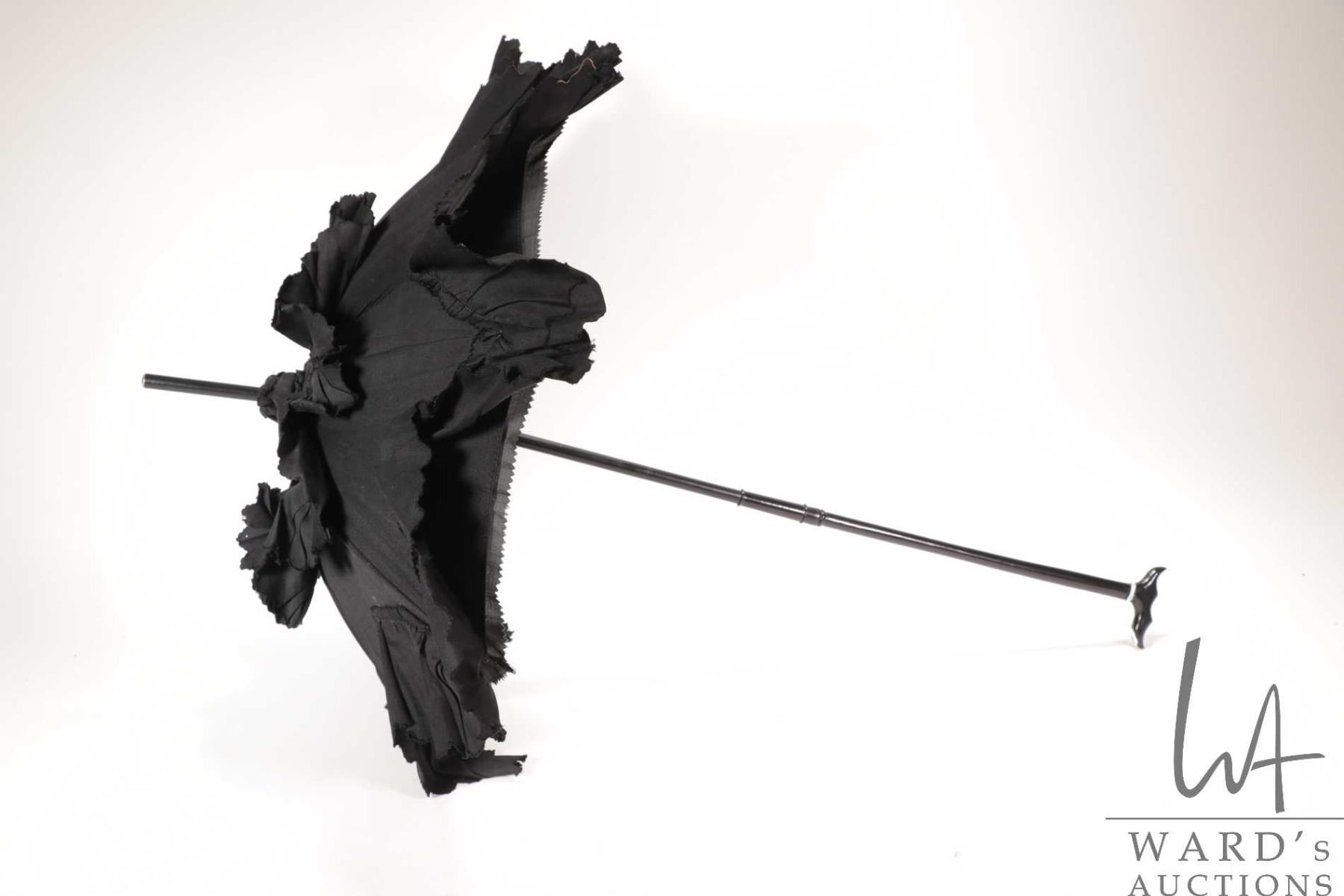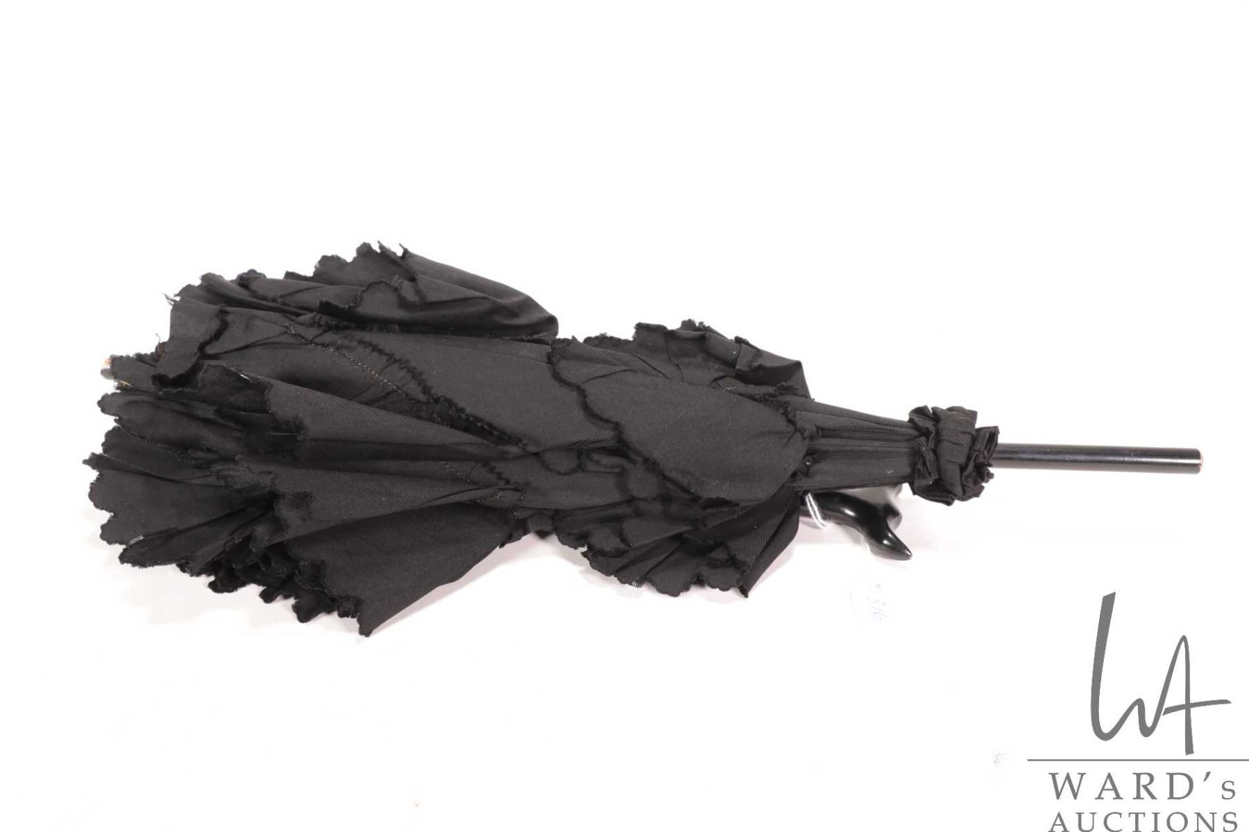 Antique parasol with ruffled cover and ebonized wooden collapsable handle, 27" full length