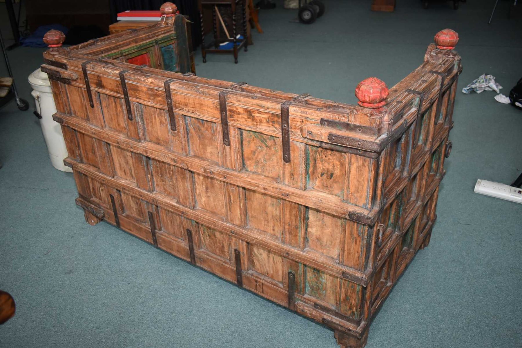 Antique, purportedly 19th century, large wooden bench with hand tooled hardware and flip top storage, note hand cut copper washers and beautiful patina to old paint, seat latches appear to be newer. 61" wide, 32" deep, 29" high very heavy