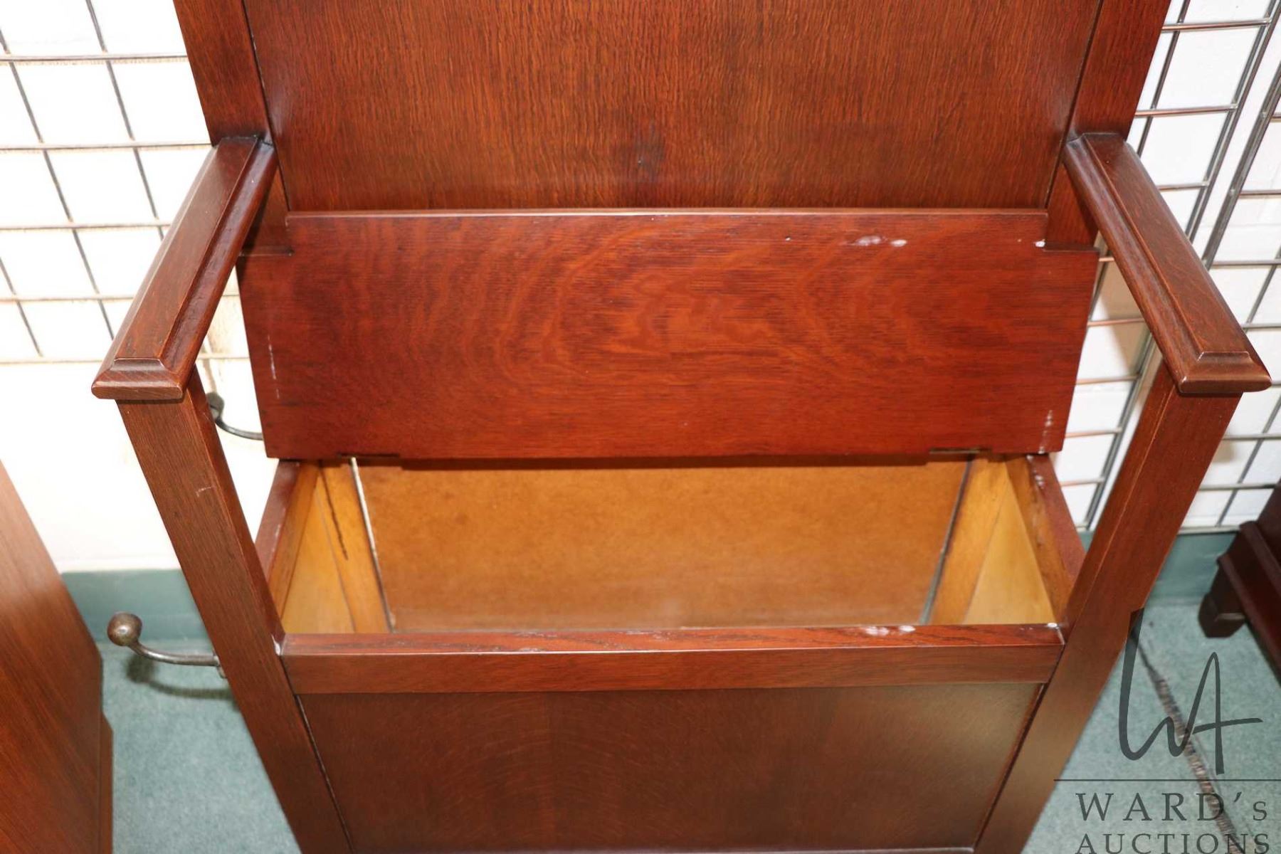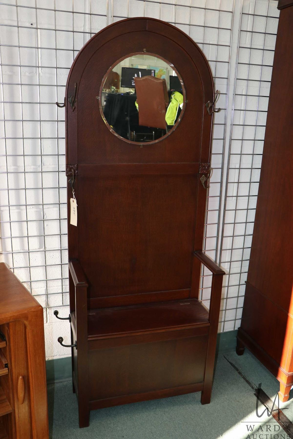 Antique quarter cut oak English hall stand with under seat storage, beveled mirror and attached hooks, 74" in height and 27" wide