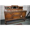 Antique quarter cut oak English sideboard with carved grape and leaf decoration and triple mirrored backboard, note two of the pulls are not original