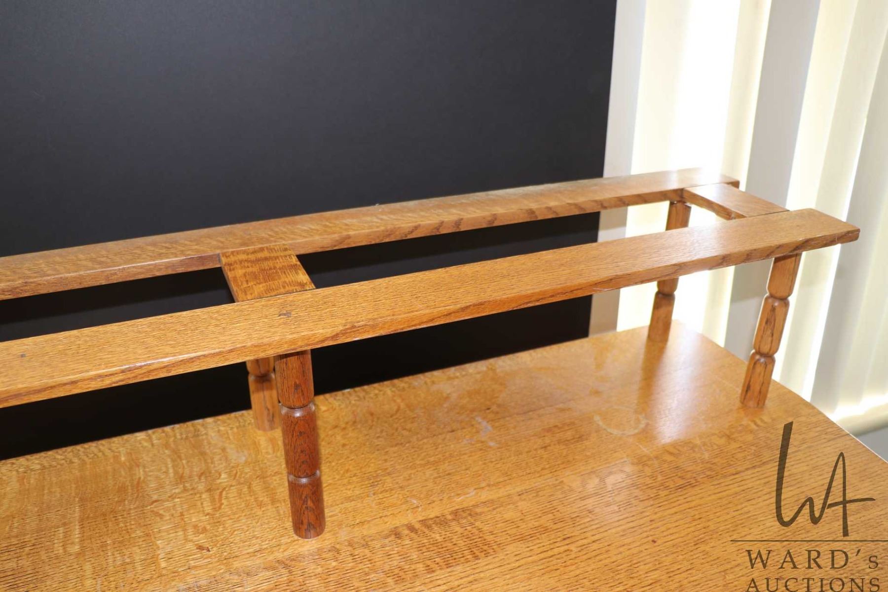 Antique quarter cut oak, Mission style clerks/ standing desk with topper, height to top of desk 45" plus 9" topper, 66" wide X 30" deep, note: two spindles for the topper are missing