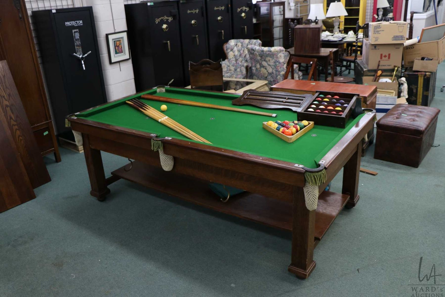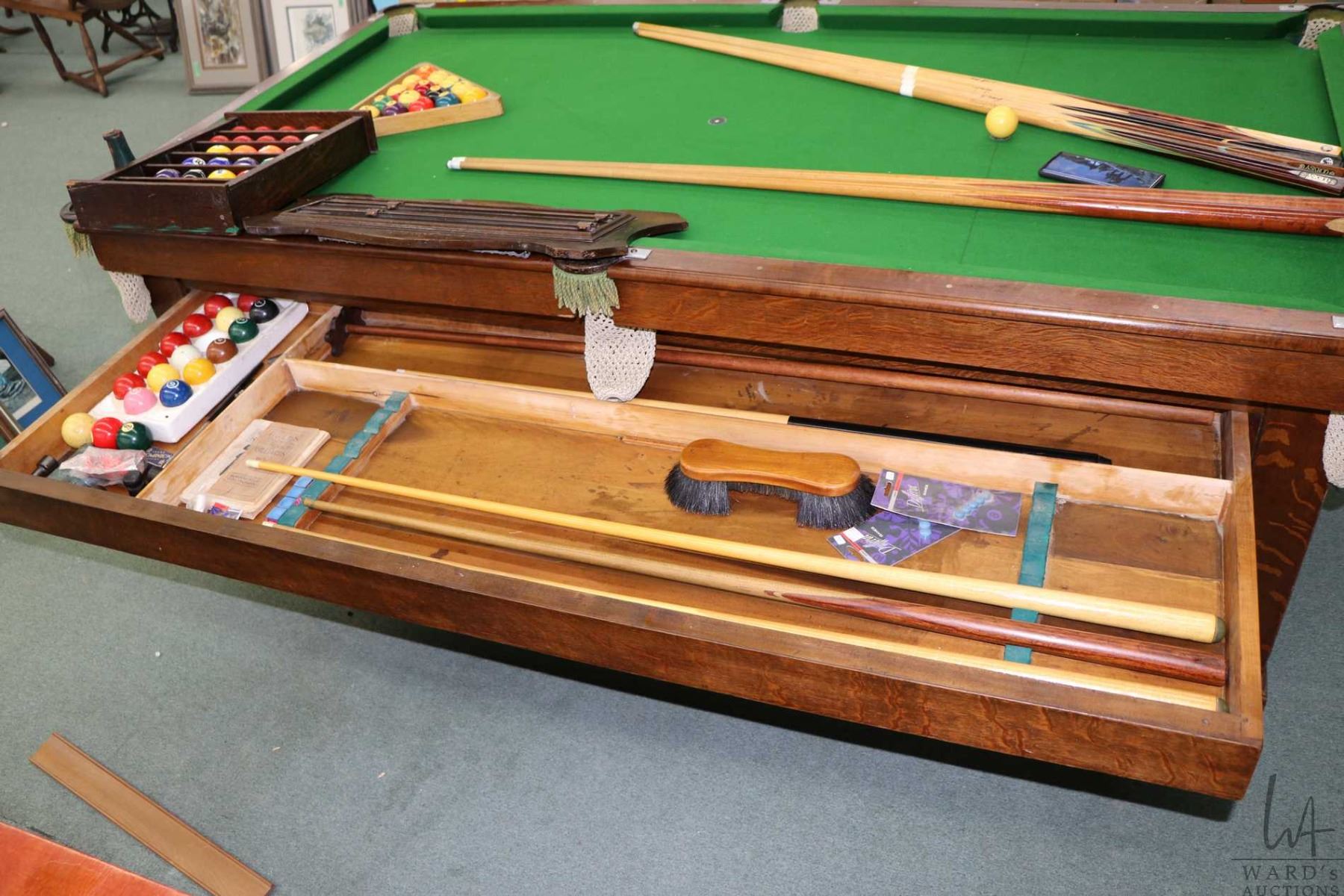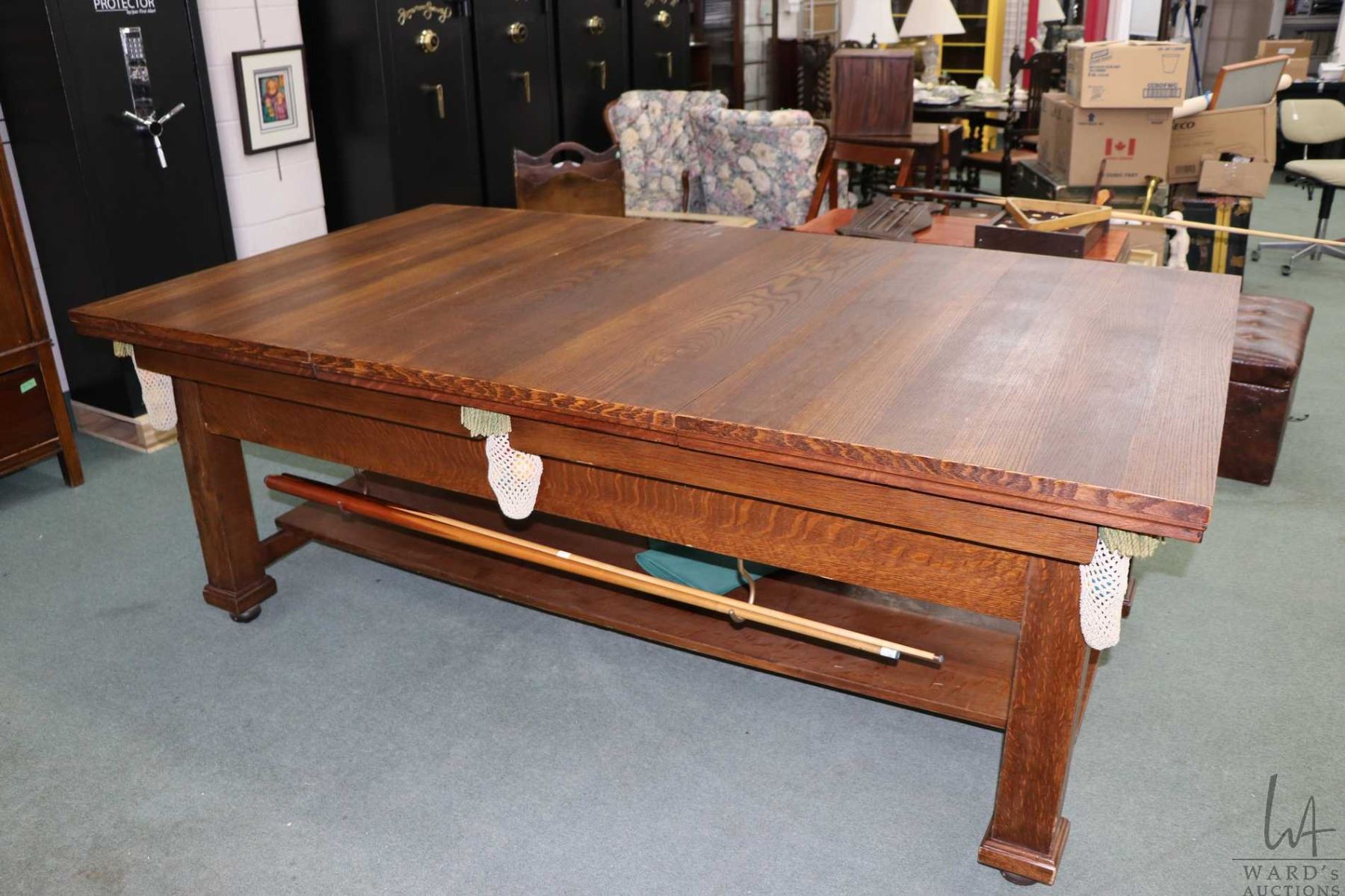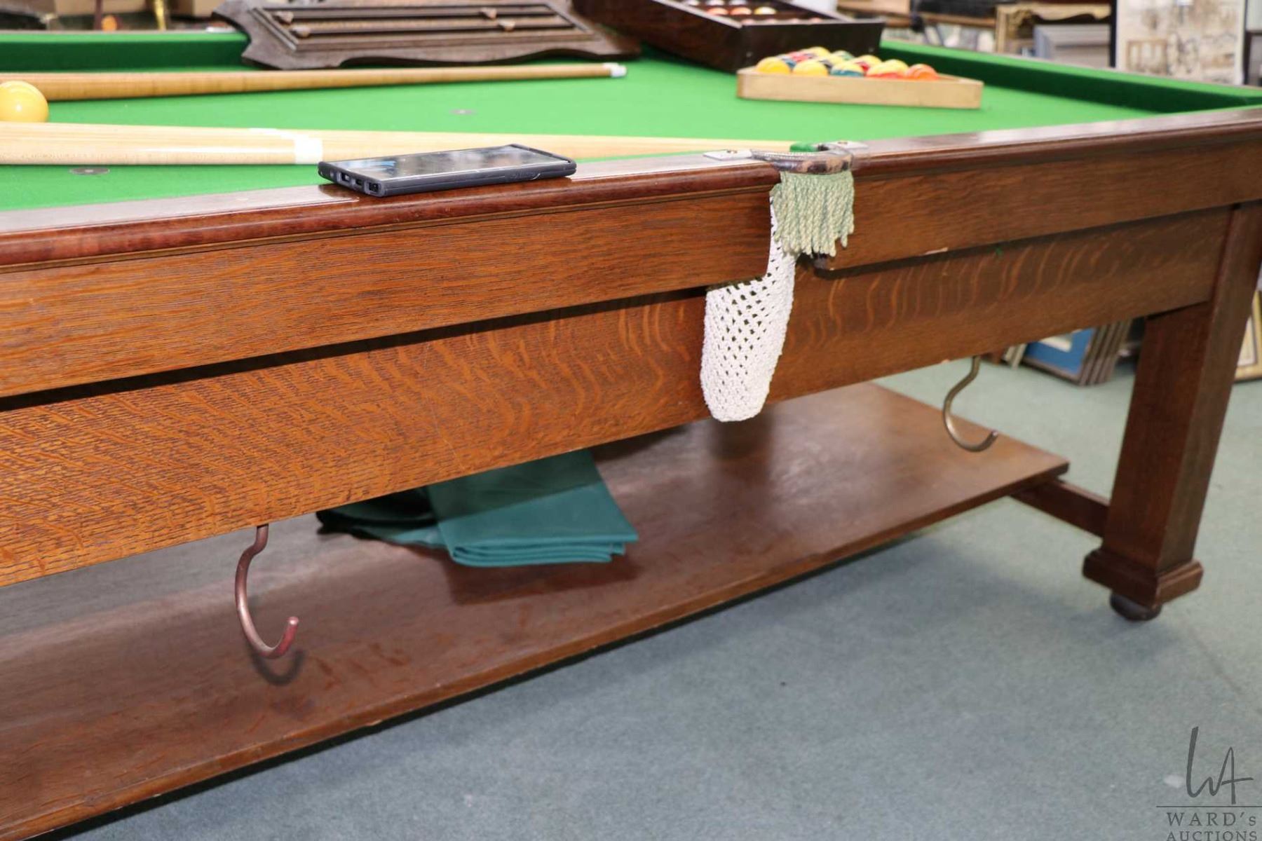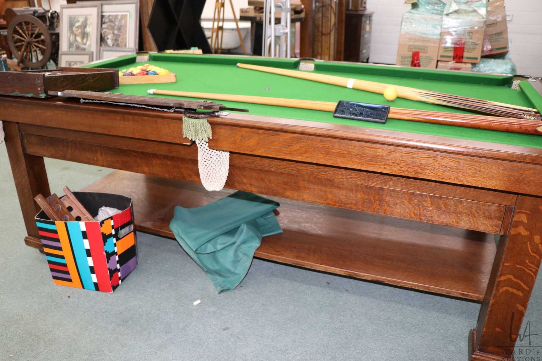 Antique quarter cut oak Mission style pool table with slate top, knitted pockets, cue hangers, full length storage drawer and under shelf. Bumper to bumper dimensions are 76 1/2" X 38 3/8", made by The Brunswick- Balke-Collender Co. Includes selection of cues, balls, wall mounted ball storage, wall mount score board marked Riley Ltd. plus other small accessories and custom made three piece oak top to convert it to a dining table