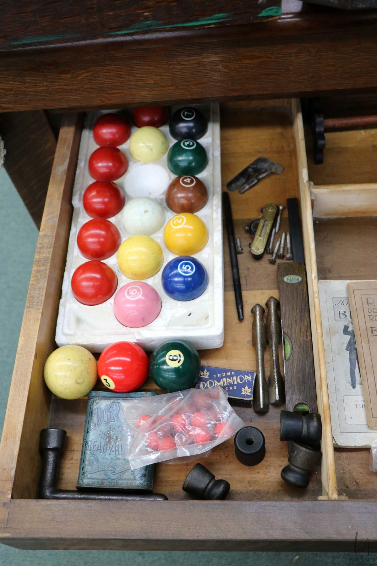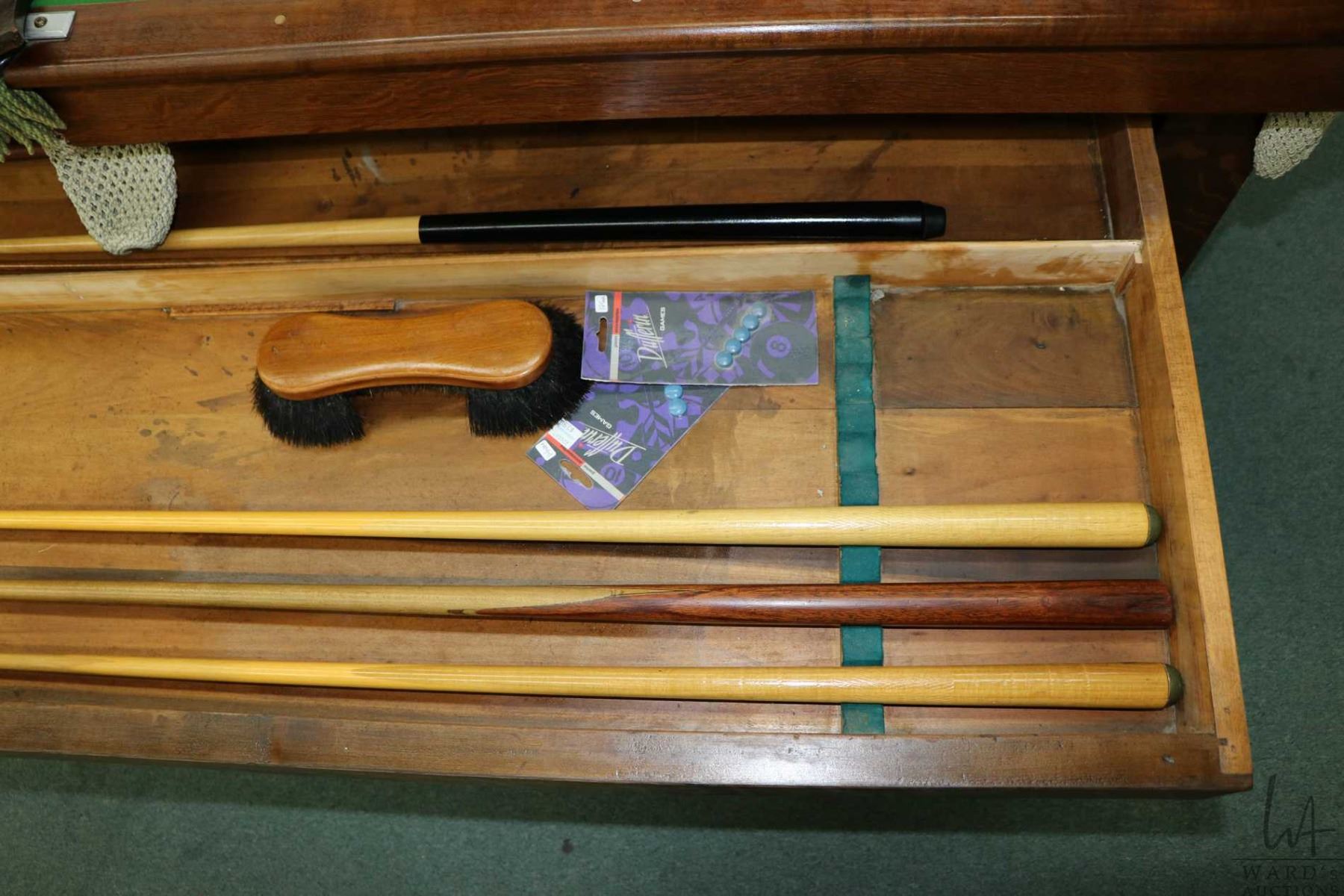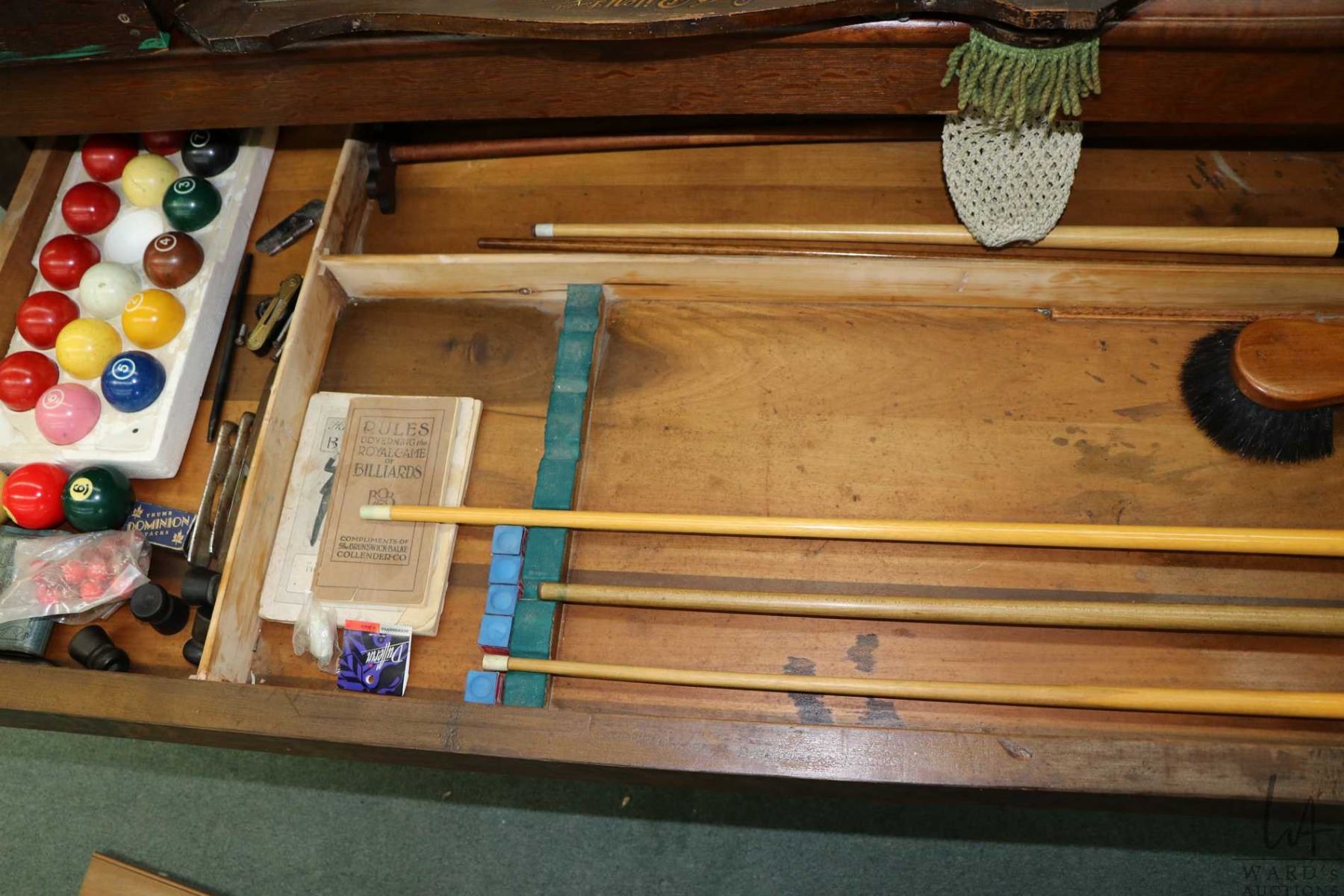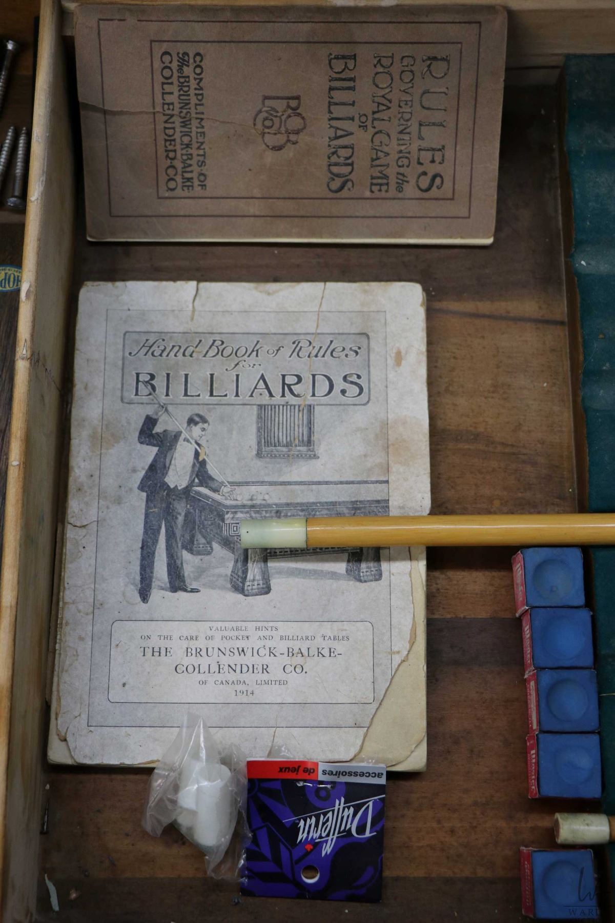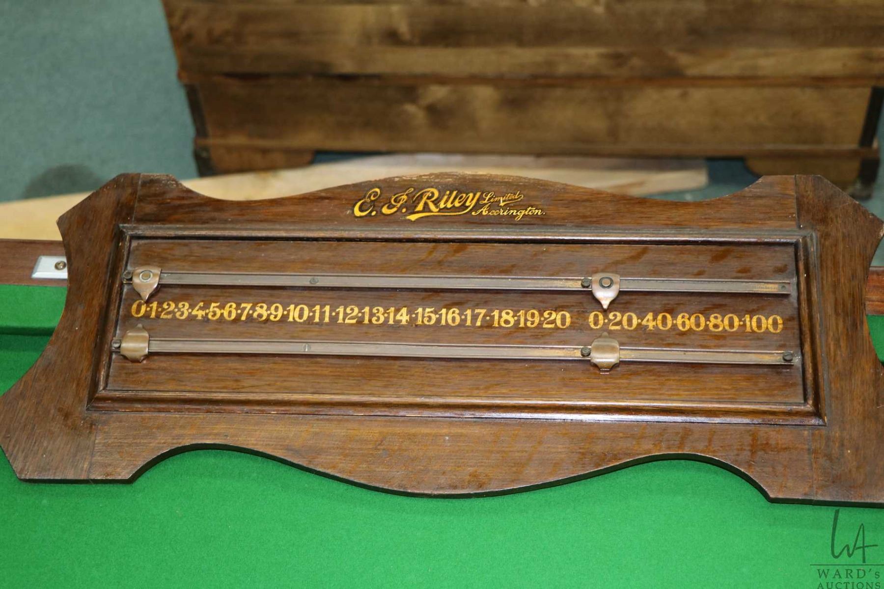 Antique quarter cut oak Mission style pool table with slate top, knitted pockets, cue hangers, full length storage drawer and under shelf. Bumper to bumper dimensions are 76 1/2" X 38 3/8", made by The Brunswick- Balke-Collender Co. Includes selection of cues, balls, wall mounted ball storage, wall mount score board marked Riley Ltd. plus other small accessories and custom made three piece oak top to convert it to a dining table
