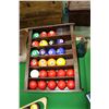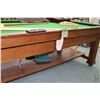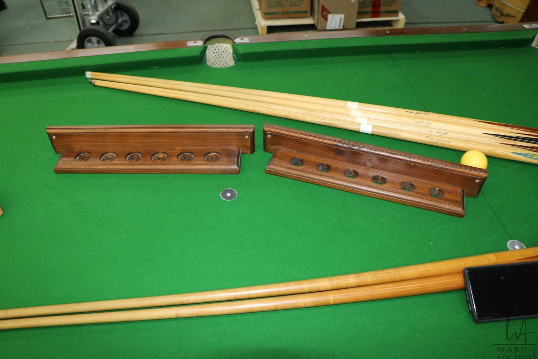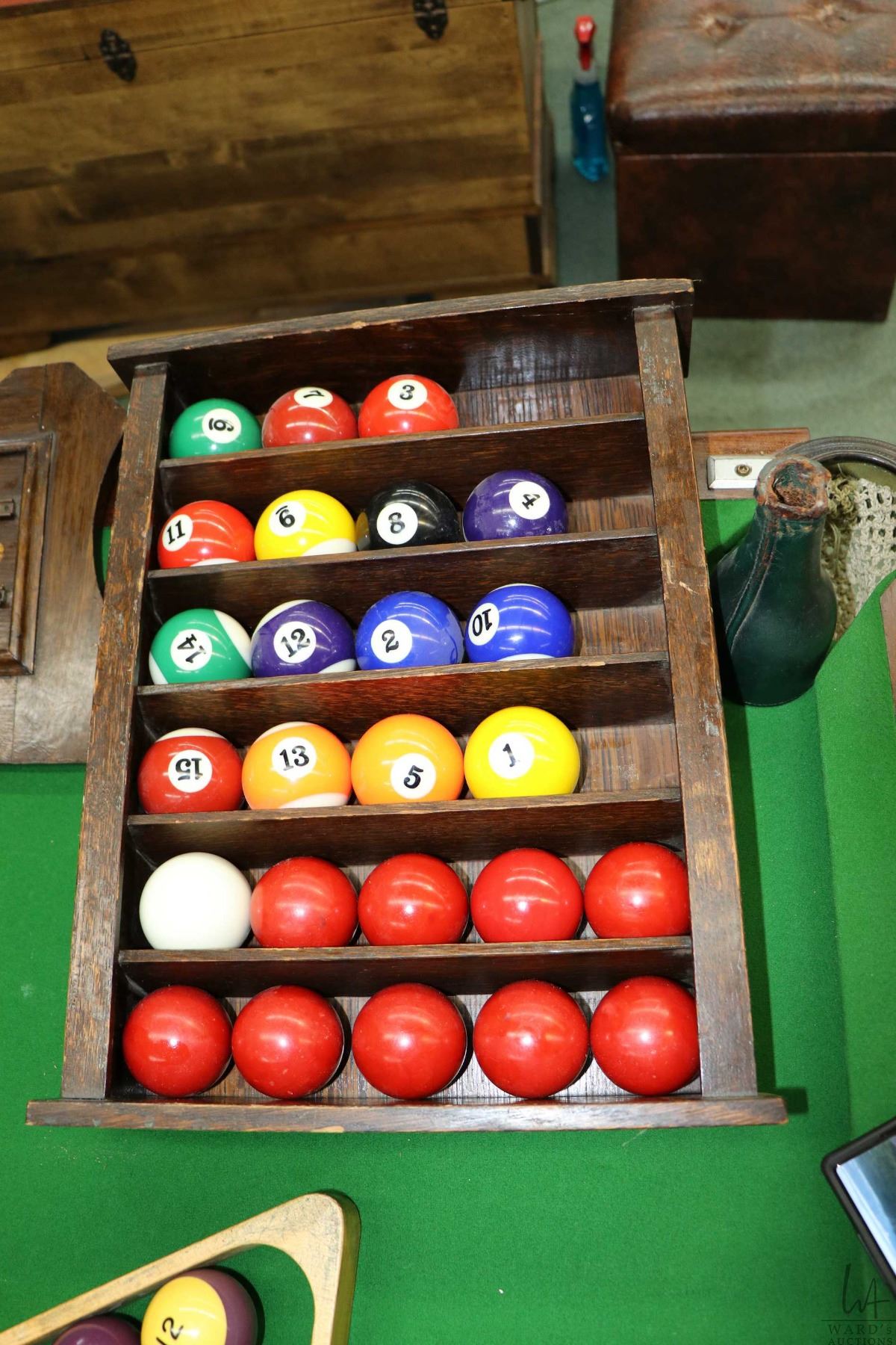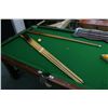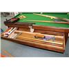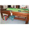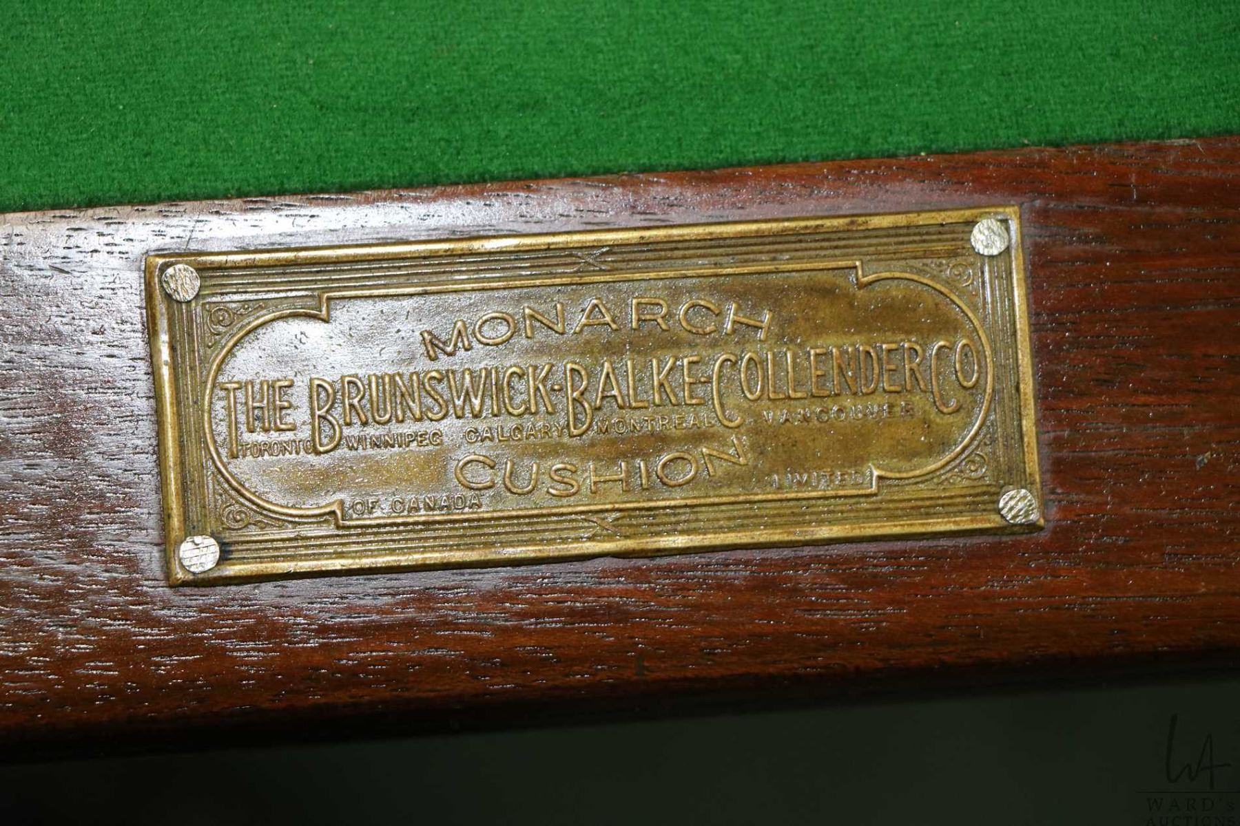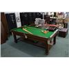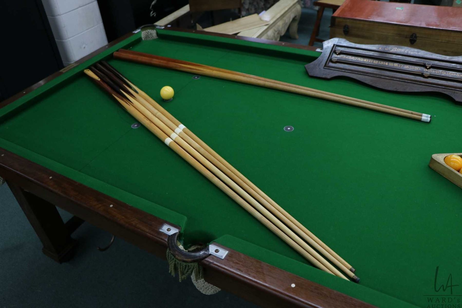 Antique quarter cut oak Mission style pool table with slate top, knitted pockets, cue hangers, full length storage drawer and under shelf. Bumper to bumper dimensions are 76 1/2" X 38 3/8", made by The Brunswick- Balke-Collender Co. Includes selection of cues, balls, wall mounted ball storage, wall mount score board marked Riley Ltd. plus other small accessories and custom made three piece oak top to convert it to a dining table