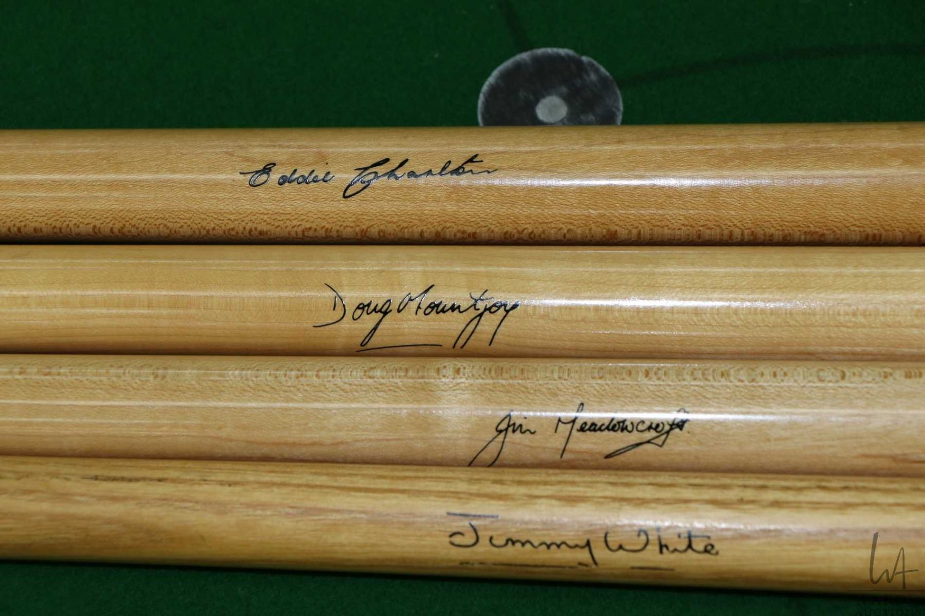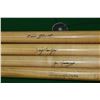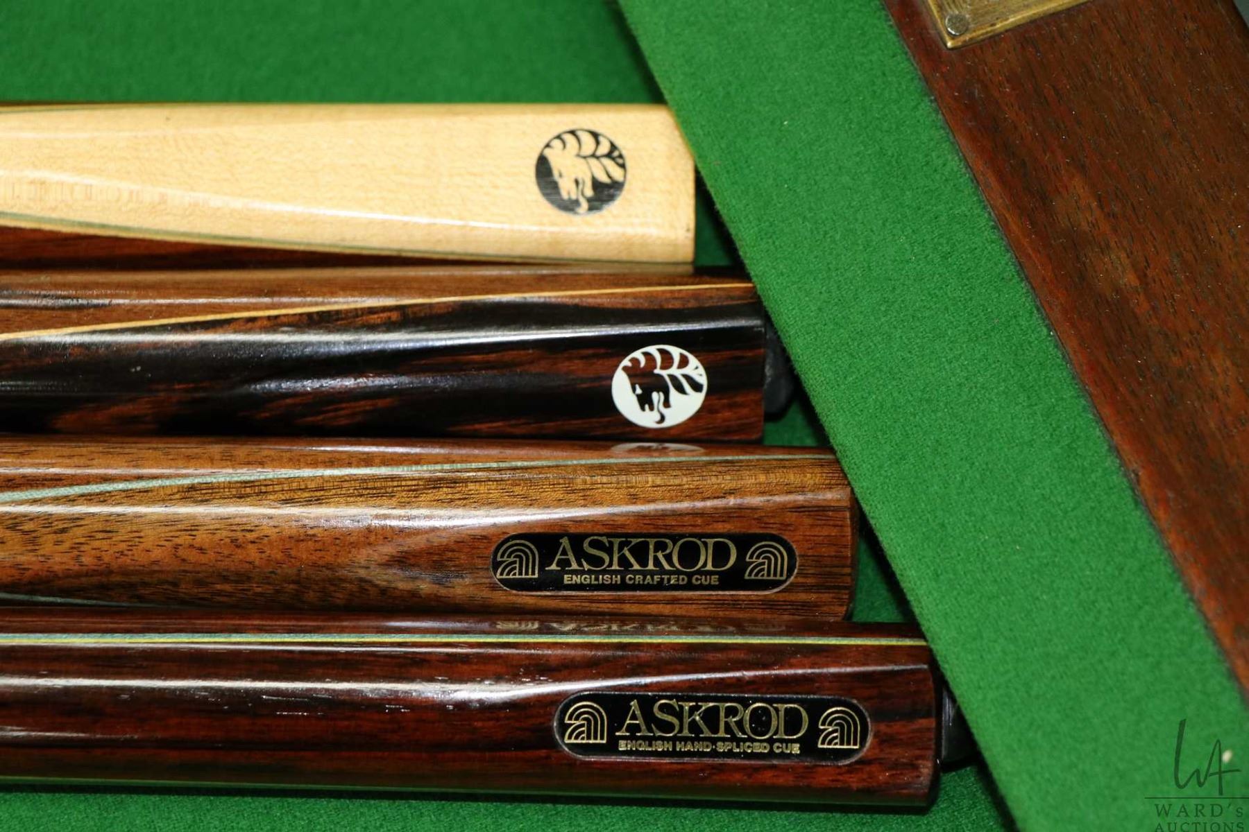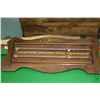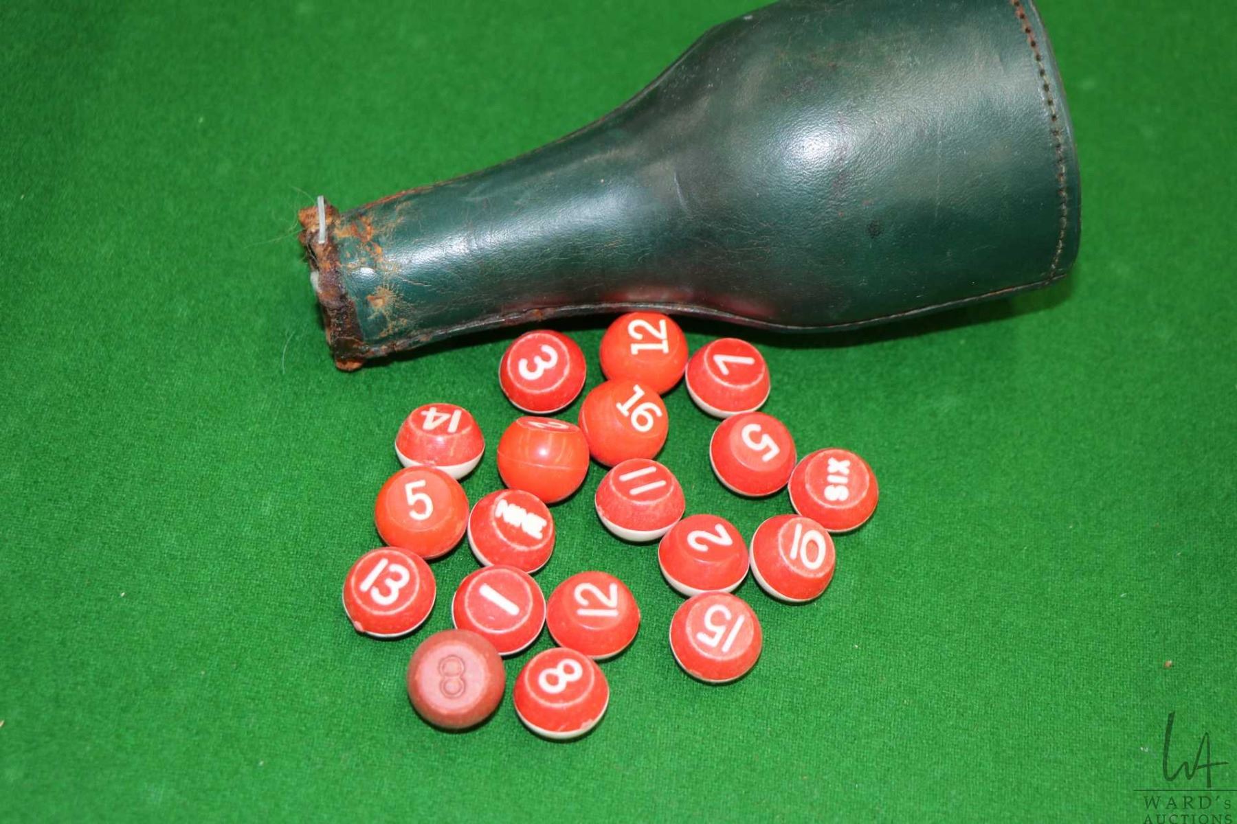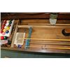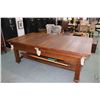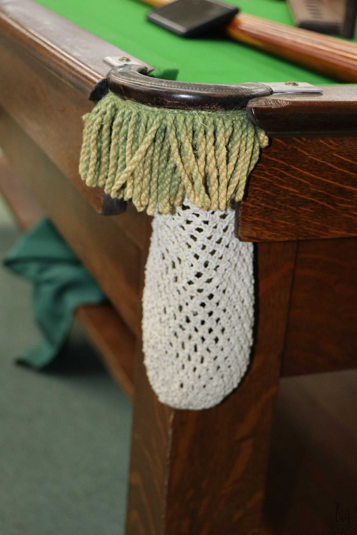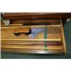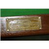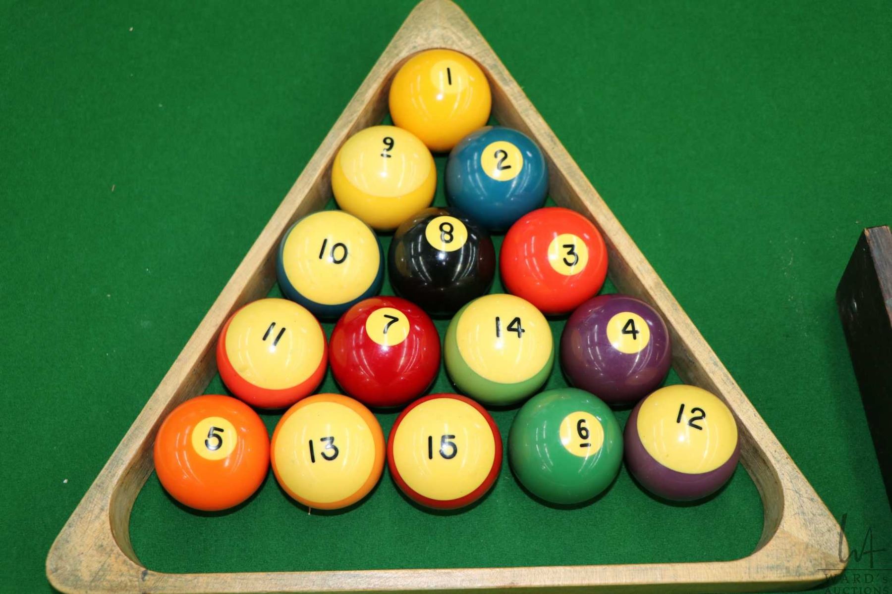Antique quarter cut oak Mission style pool table with slate top, knitted pockets, cue hangers, full length storage drawer and under shelf. Bumper to bumper dimensions are 76 1/2" X 38 3/8", made by The Brunswick- Balke-Collender Co. Includes selection of cues, balls, wall mounted ball storage, wall mount score board marked Riley Ltd. plus other small accessories and custom made three piece oak top to convert it to a dining table