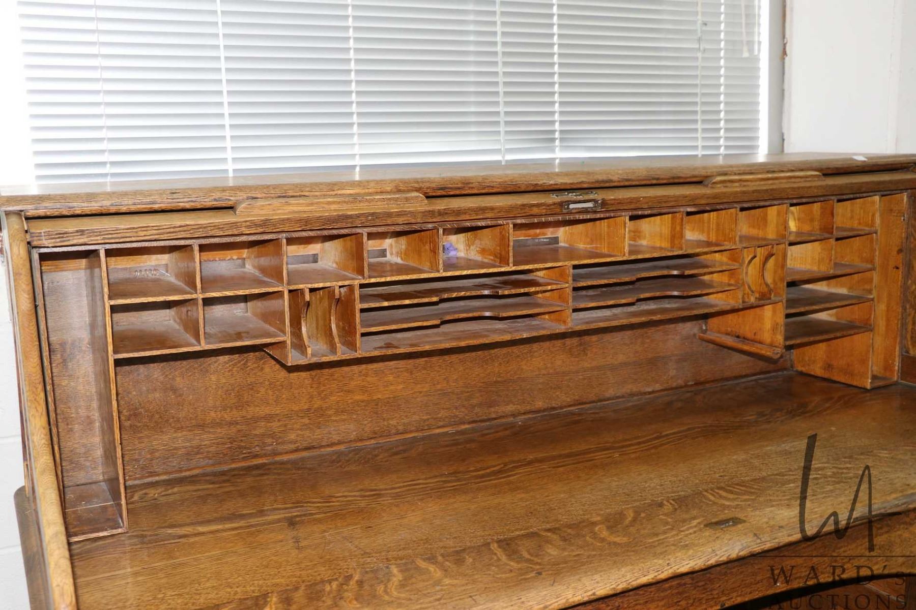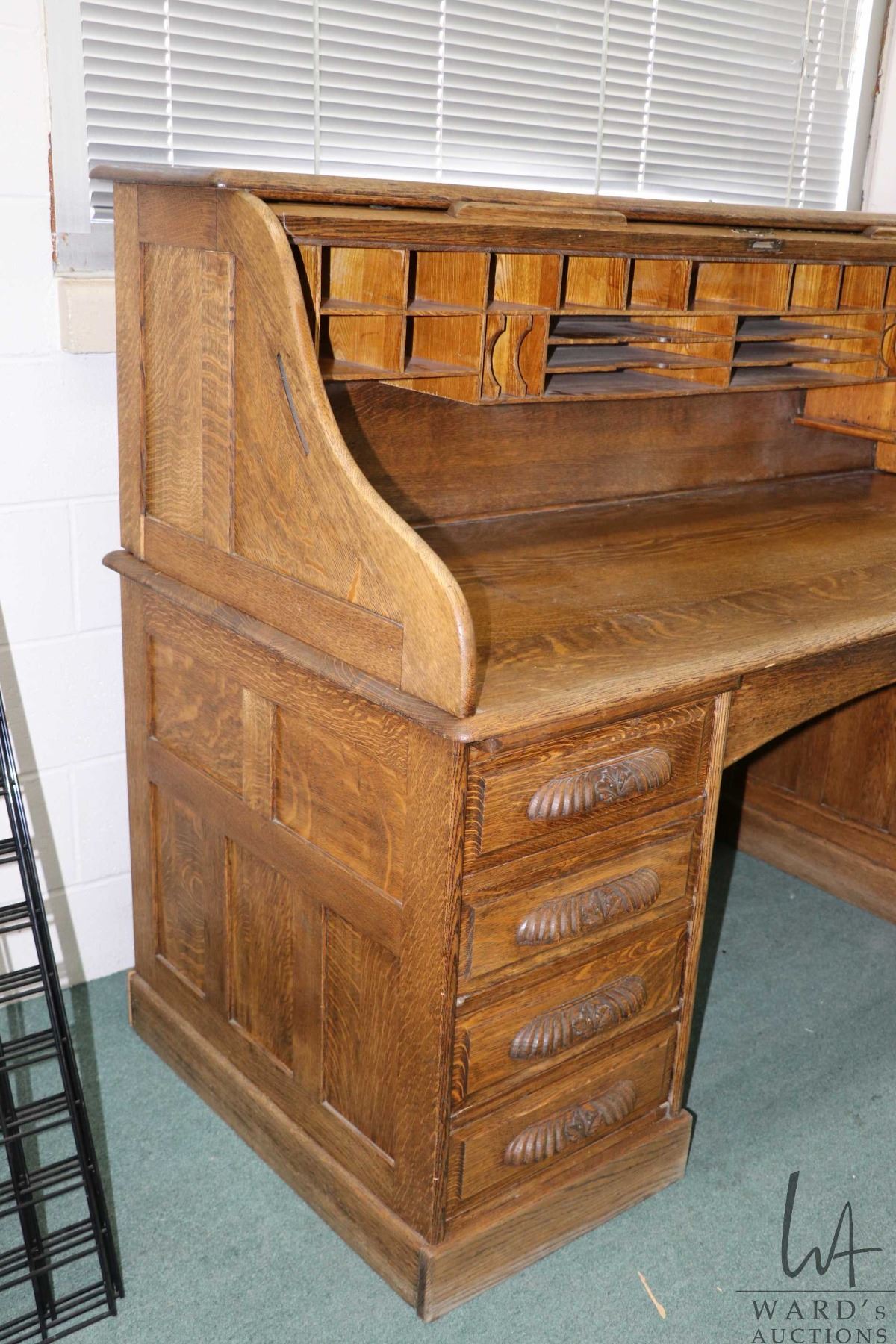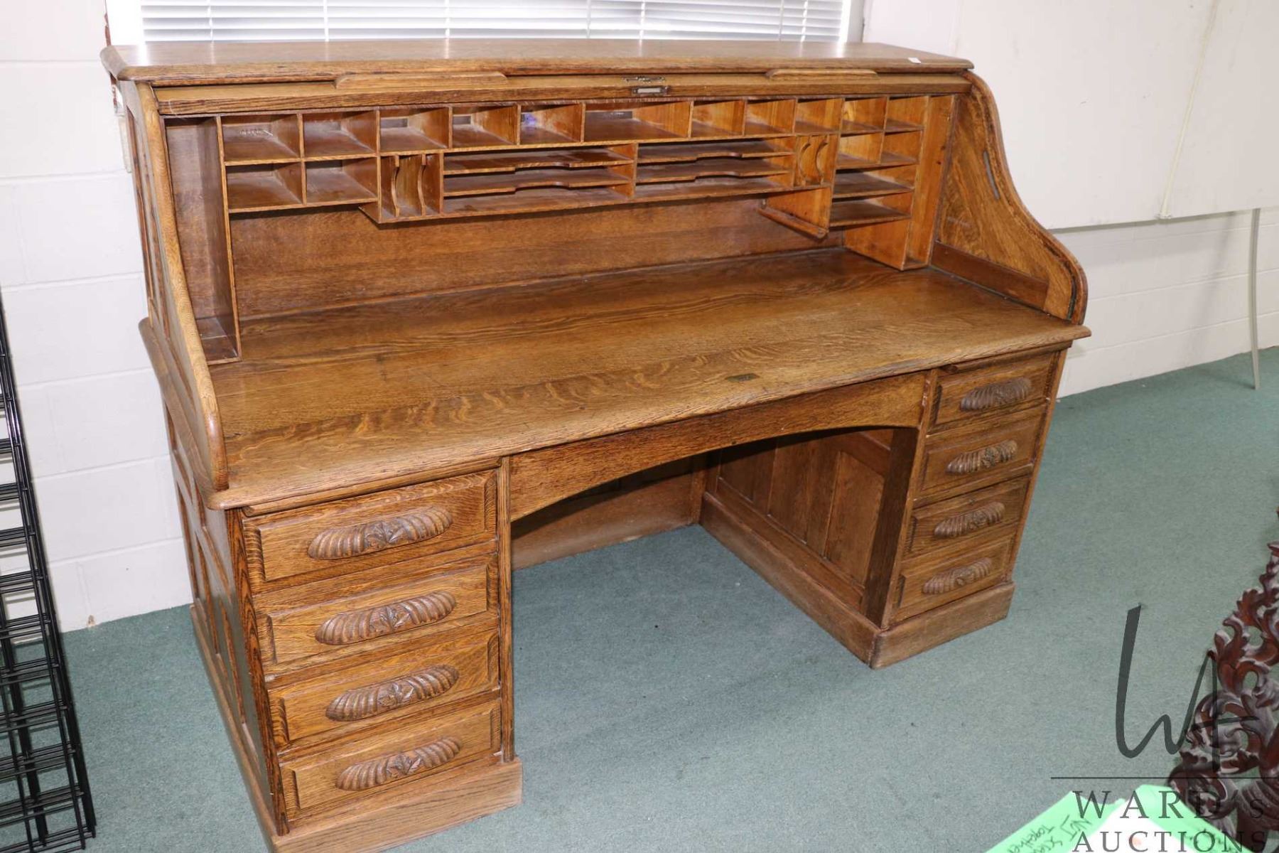 Antique quarter cut oak, S curve, double pedestal roll top desk with fitted interior, 49" H X 71" W X 31" D, note: was disassembled for transport, can't confirm that the mechanism will work perfectly