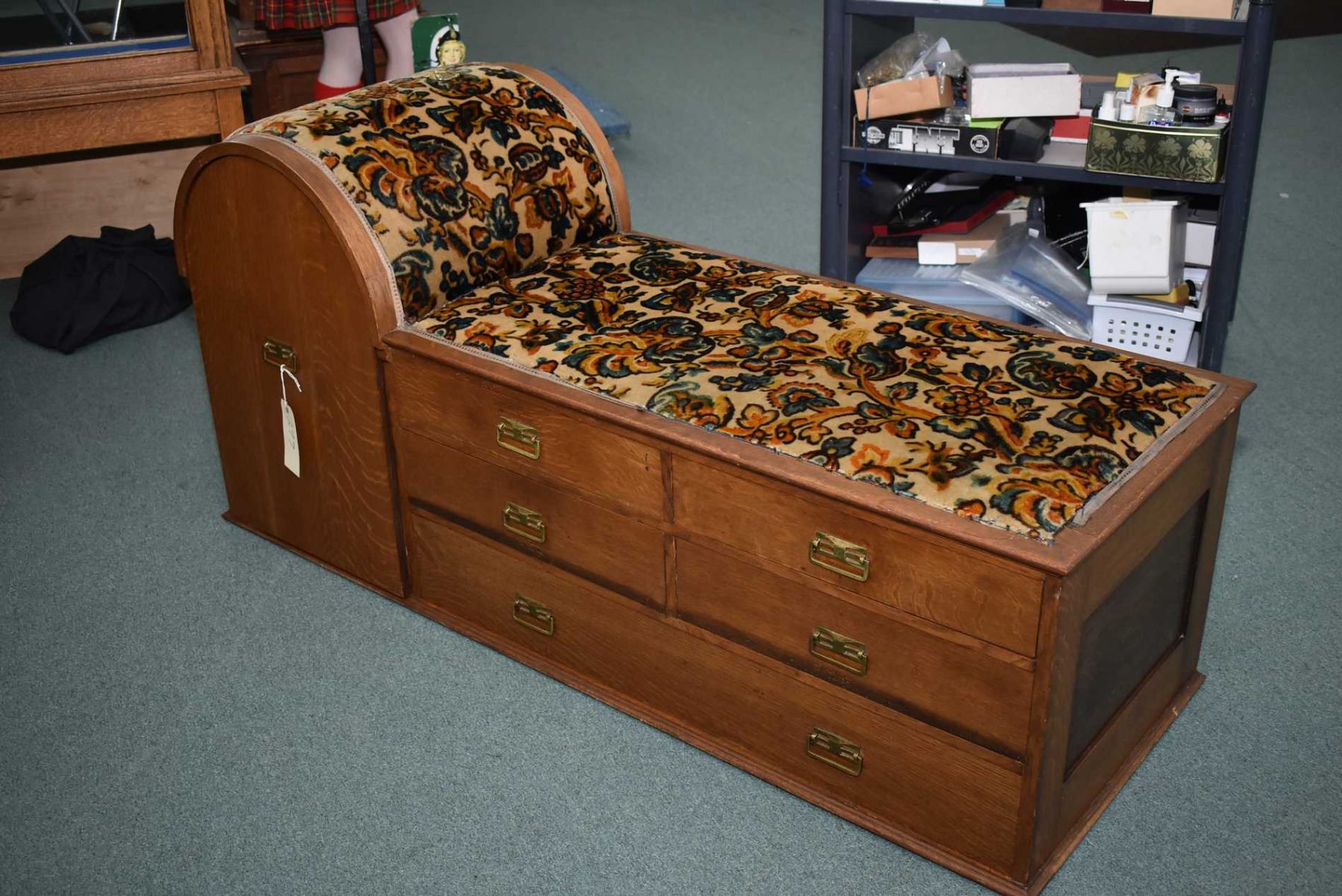 Antique quarter cut oak chaise with five drawers plus unusual large pull out, appears to be original brass pulls