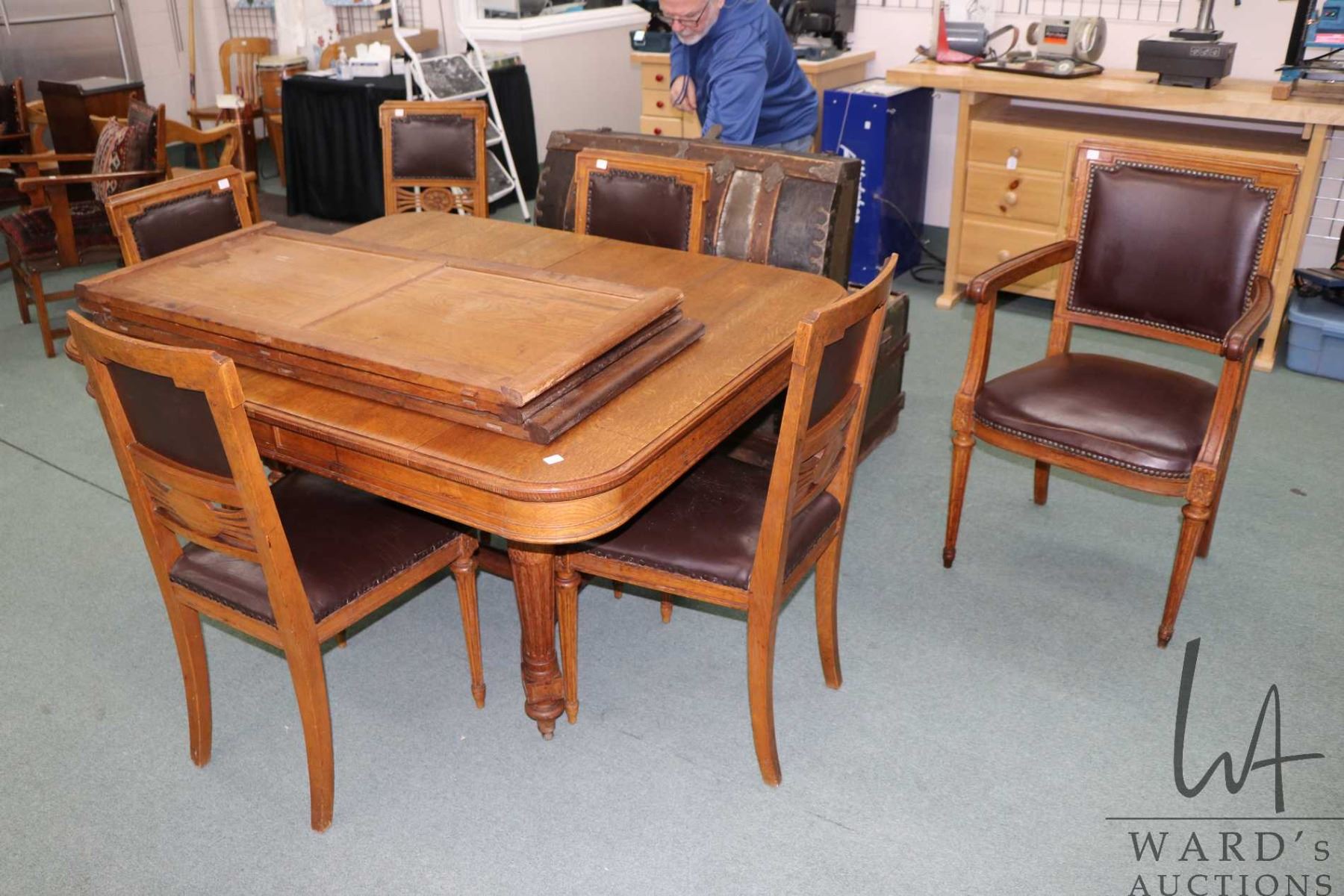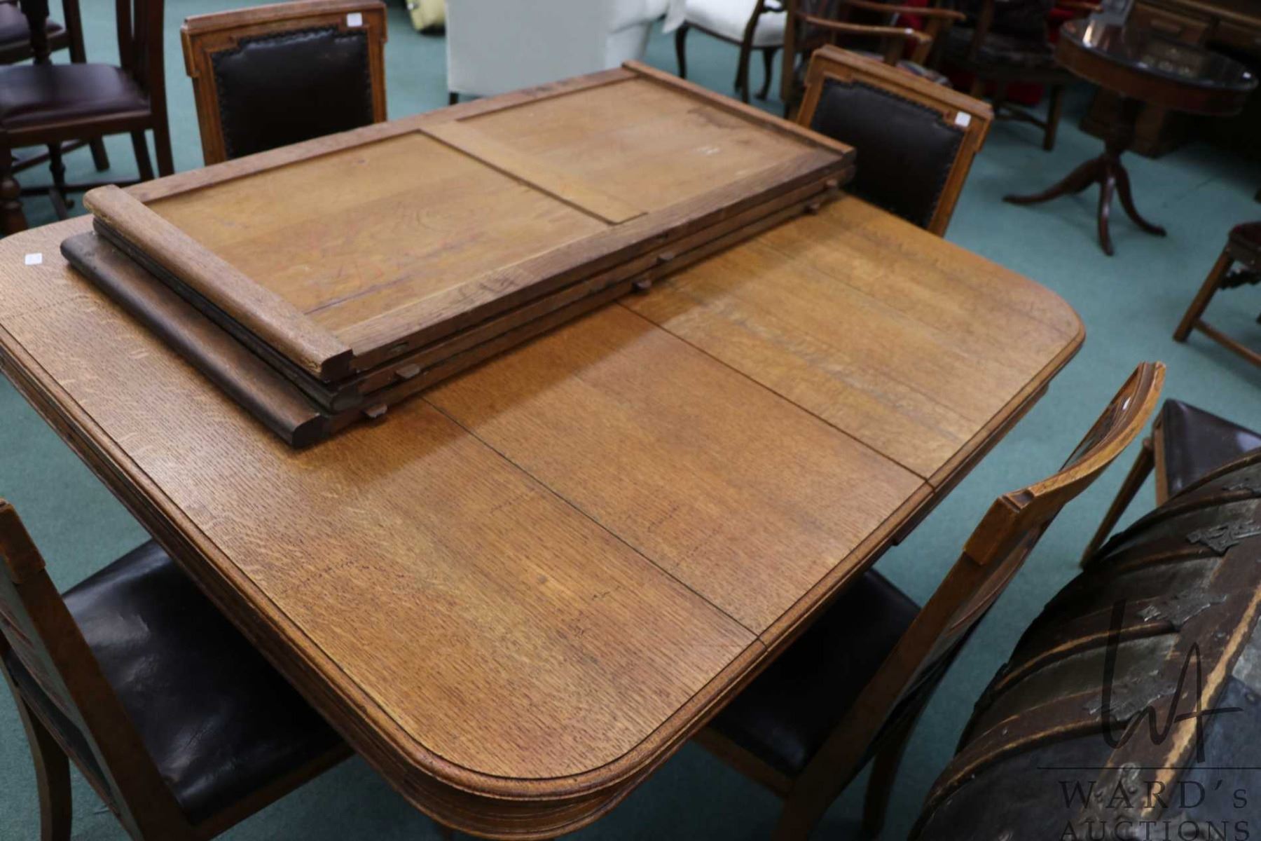 Antique quarter cut oak dining table 50" X 43" plus three 20" original oak framed and soft wood insert leaves and six dining chairs with reeded front supports, carved decoration on leg uppers and seat back plus brown leather upholstery with nail head upholstery