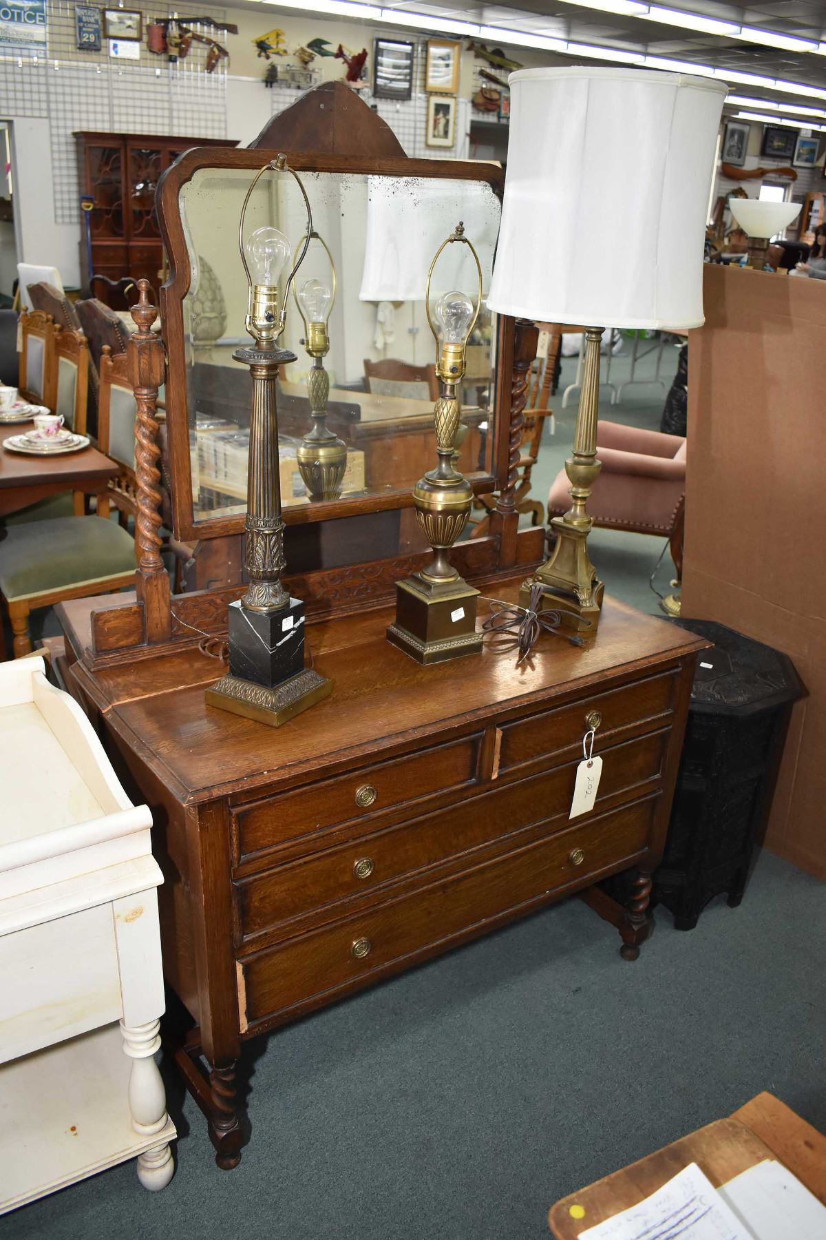 Antique quarter cut oak four drawer mirrored dresser with barley twist supports