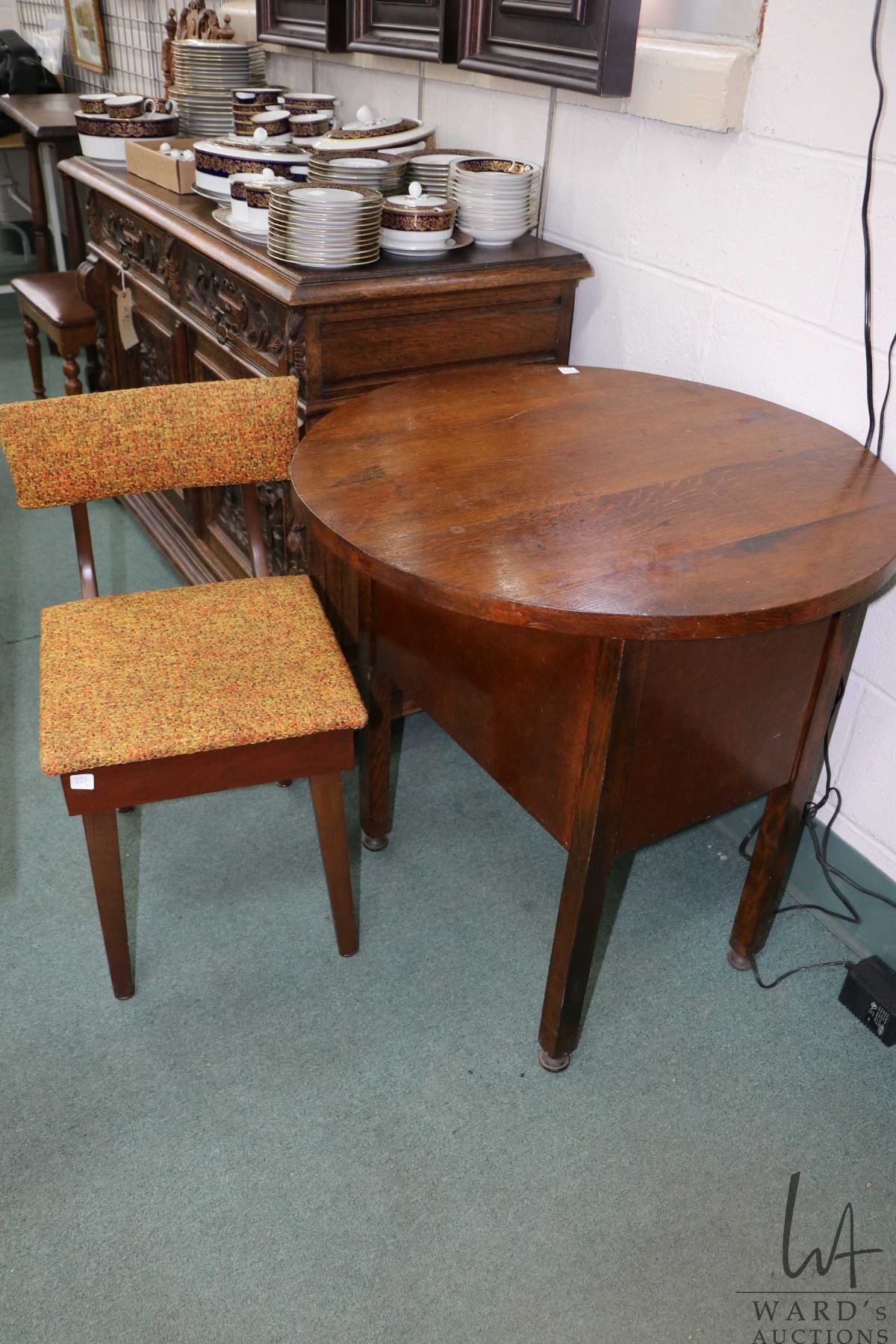 Antique quarter cut oak tilt top sewing table with fitted interior, 27" in diameter, plus a small non-matching chair