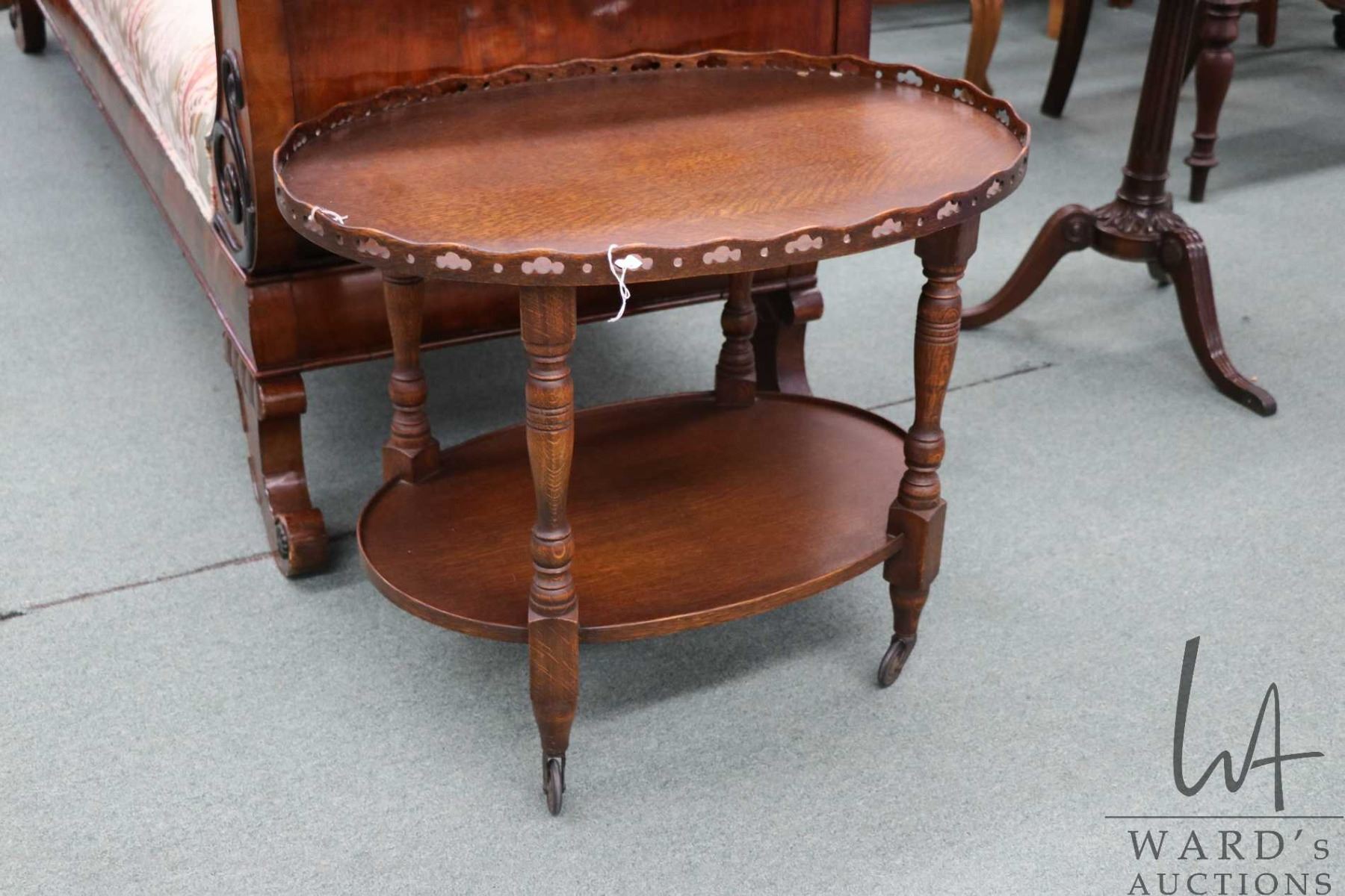 Antique quarter cut oak, two tier occasional table with sculpted fretwork galley on castor, 22" H X